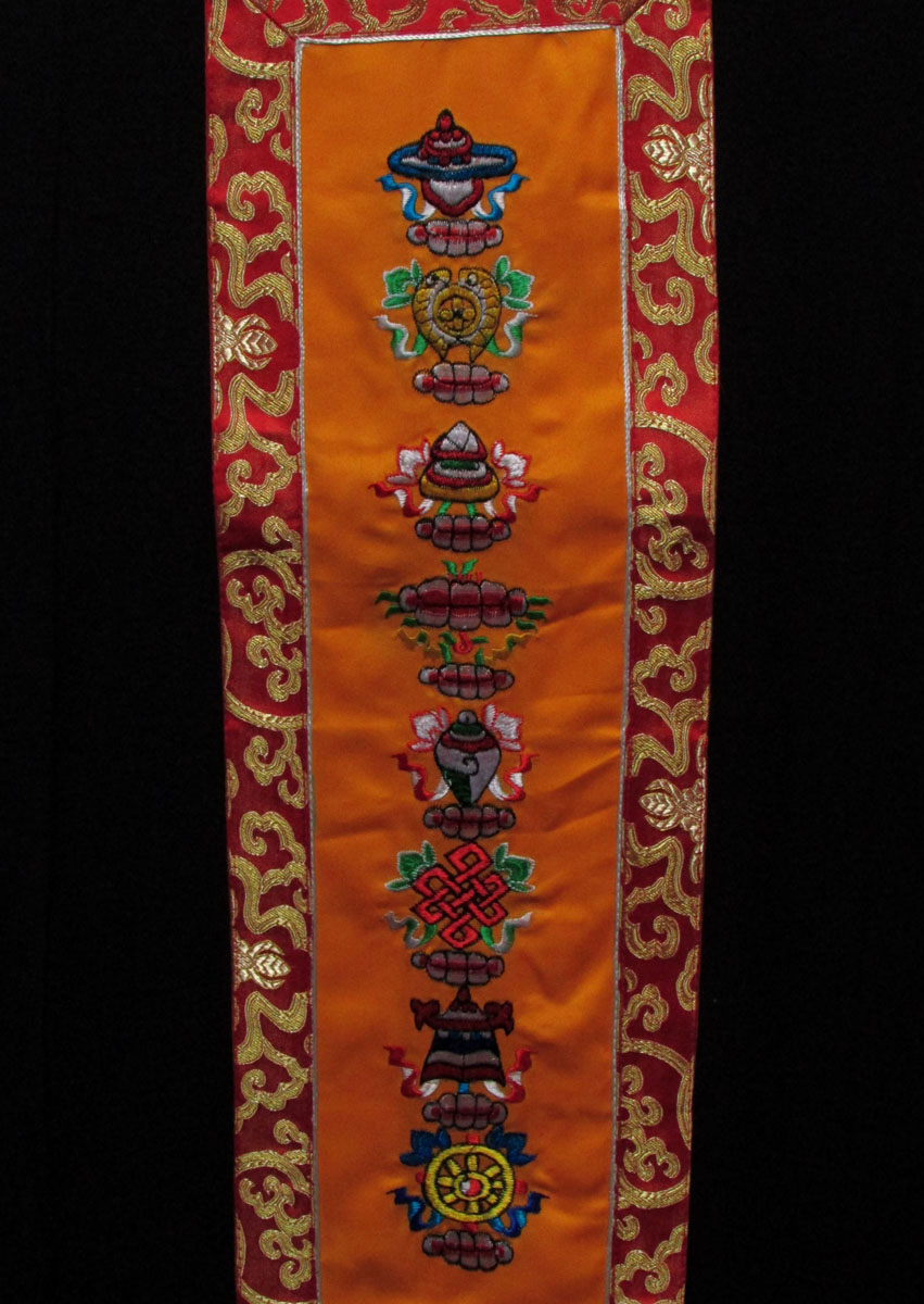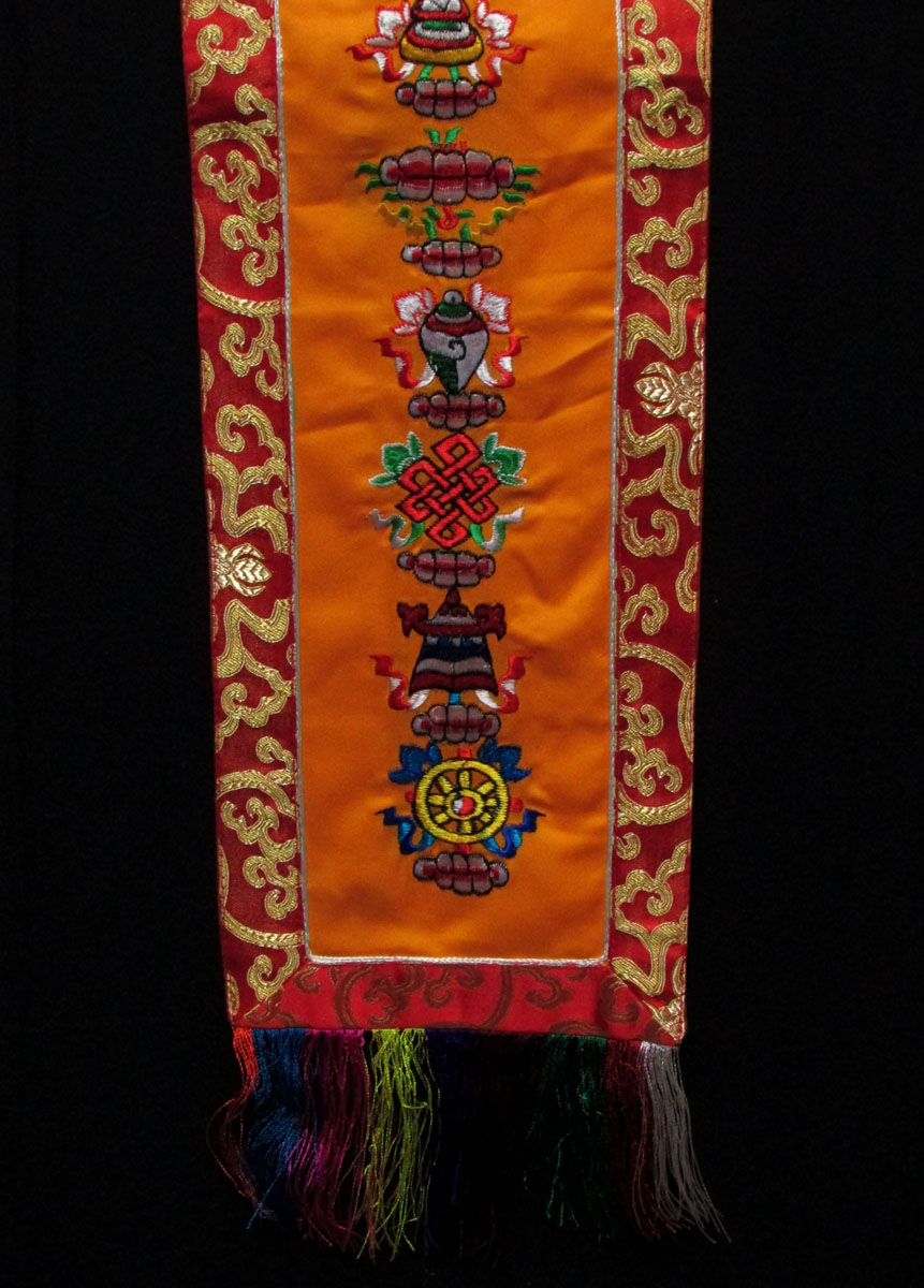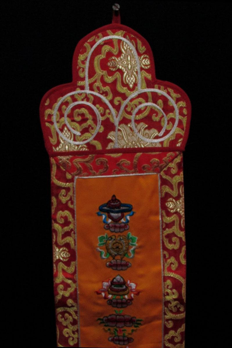 This is a beautiful silk brocade wall hanging from Nepal. At the center Astamangala image is decorated with beautiful hand woven silk embroidery, there is a high quality brocade border. They are handmade by the highly skilled and experienced local artisans in Nepal.
