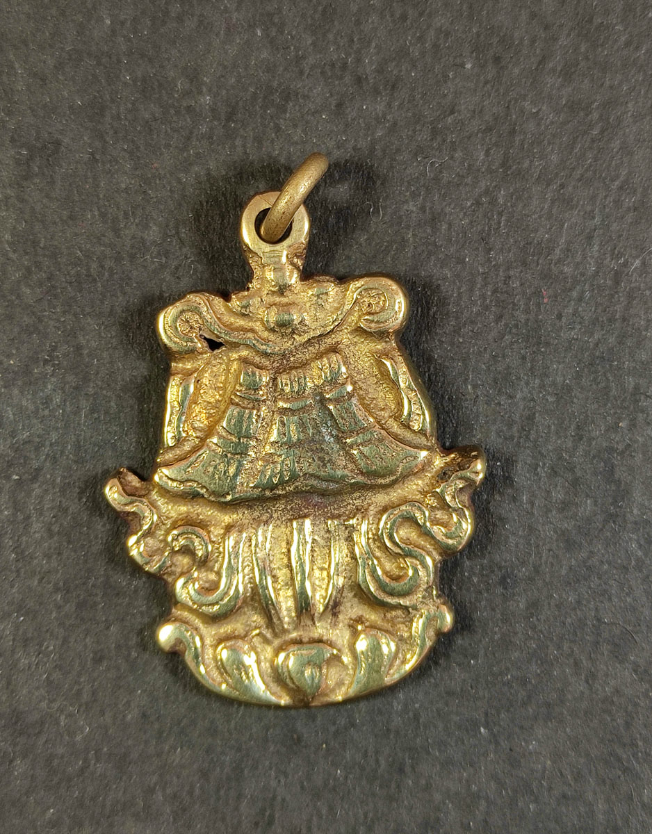This is a very beautiful amulet of Auspicious Sign "The Victory Banner" from Nepal. It is embossed in a Solid Brass from Nepal. The back side is plain.