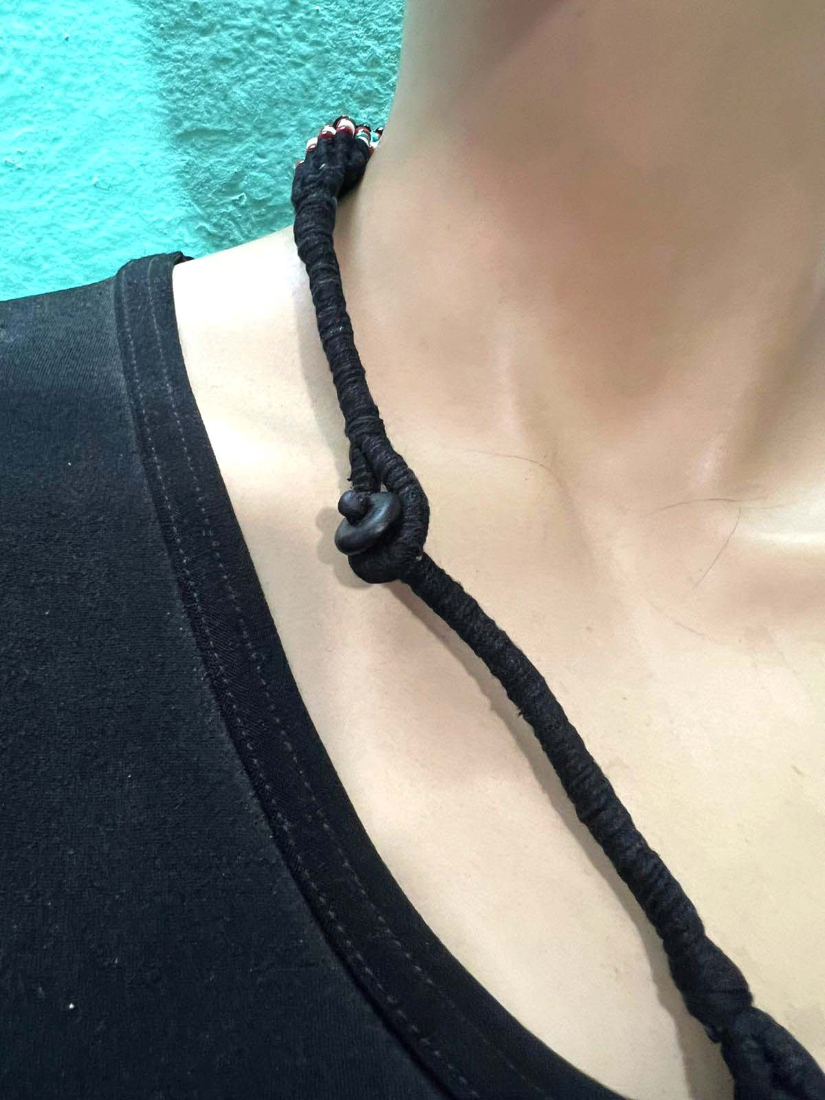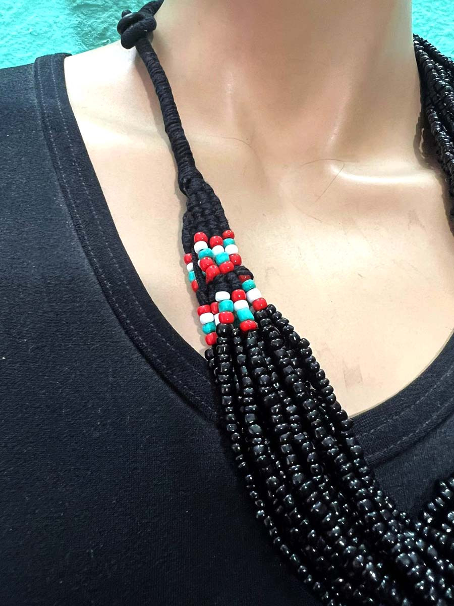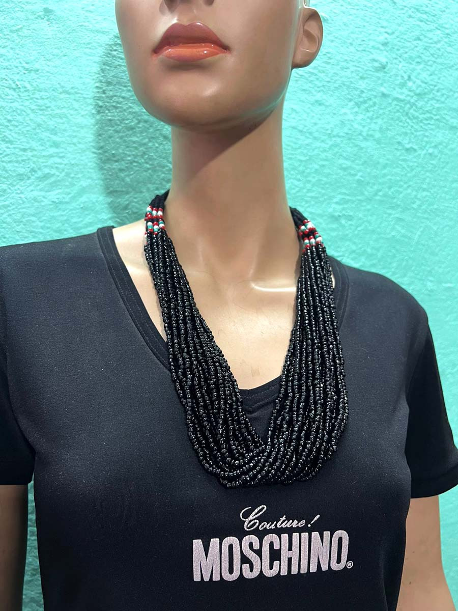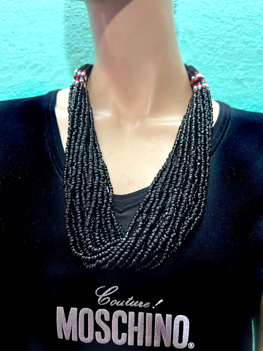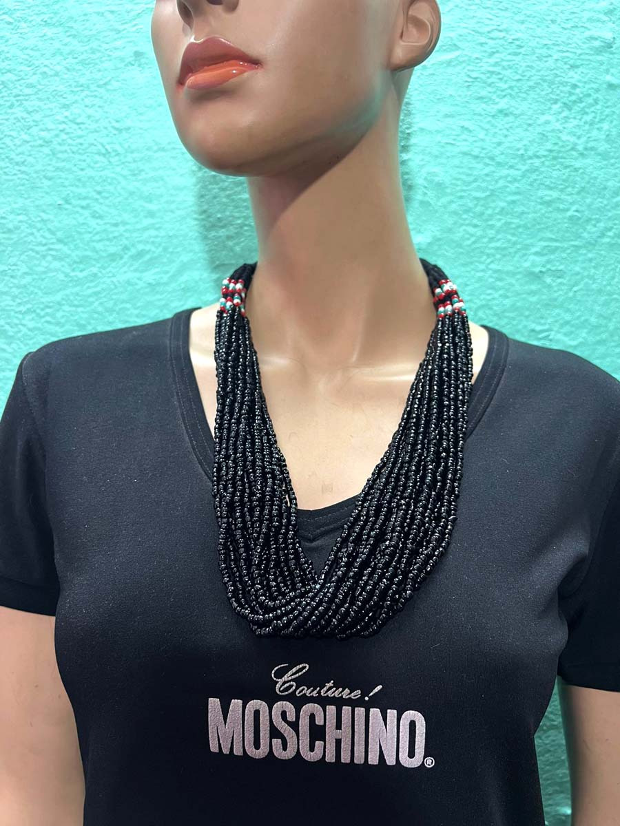 This is a gorgeous 18 strands Black/red, white, blue Color glass beads with a small coconut button for a lock necklace (Brand New) from India.