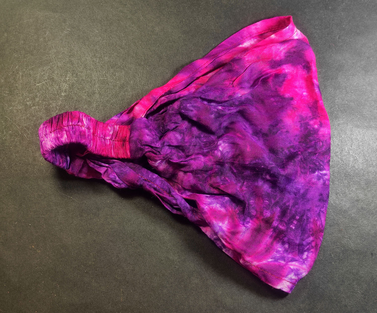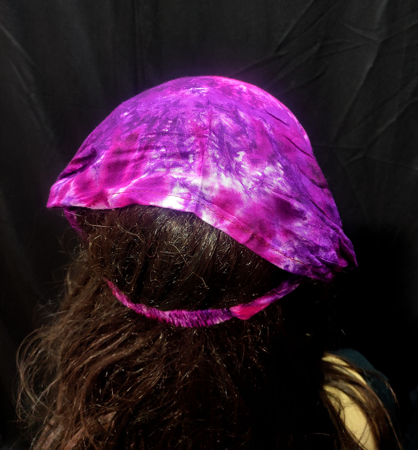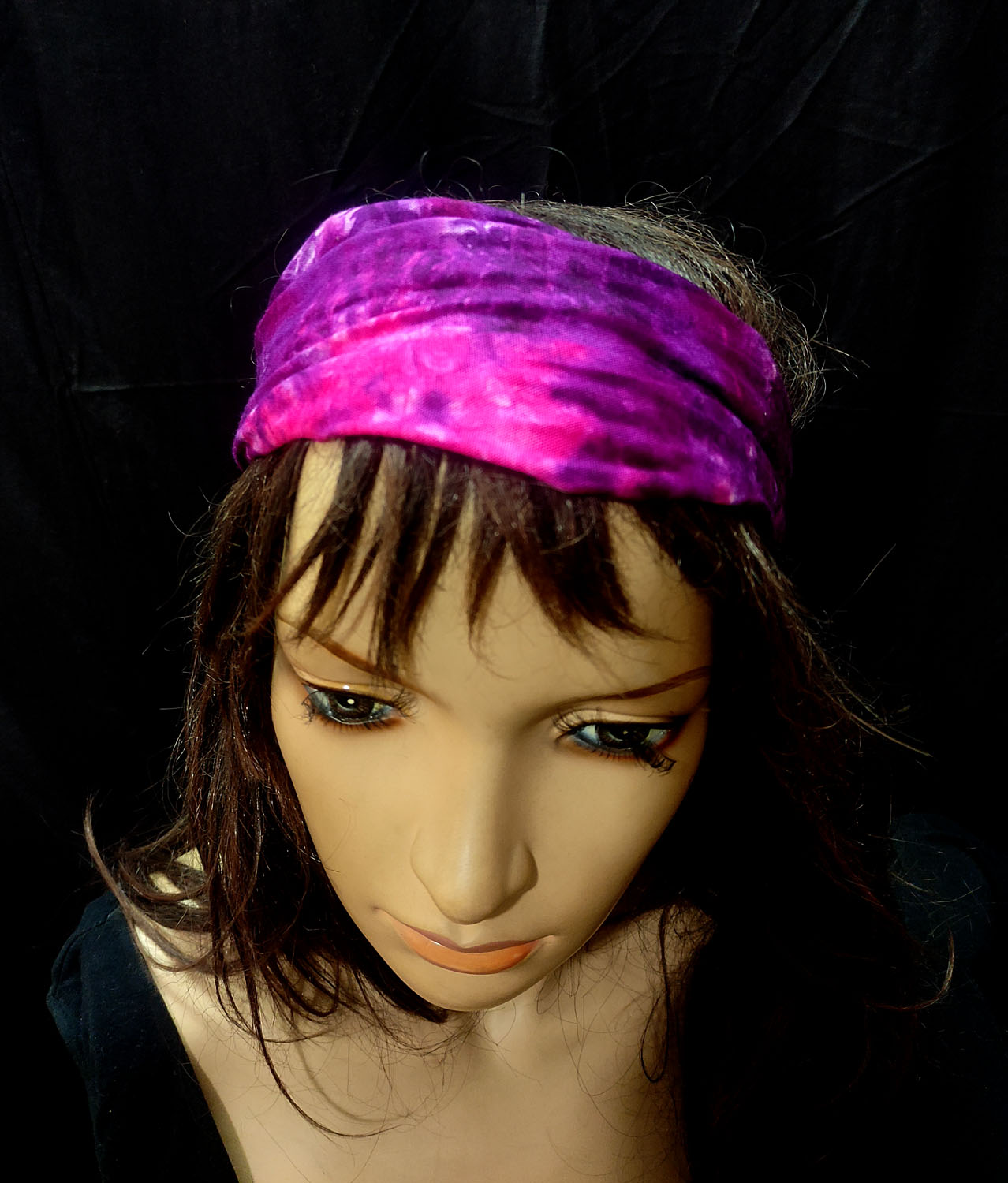It is a wide cotton headband with elasticated band at the back which fits almost all adult heads. The head band can be worn scrunched up or pulled out.