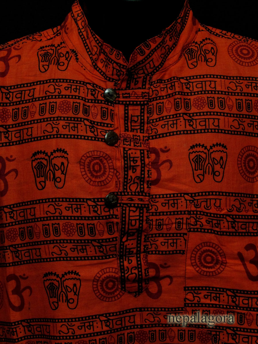 This a brand new (with tag) garment 100% cotton handloom Om Mantra with other sacred symbols block printed shirt from Nepal. This is a top having three unique wood button in the front below the collar and one pocket on left front chest with short sleeve which looks very classic and stylish. We can use it as casual wear in the summer.