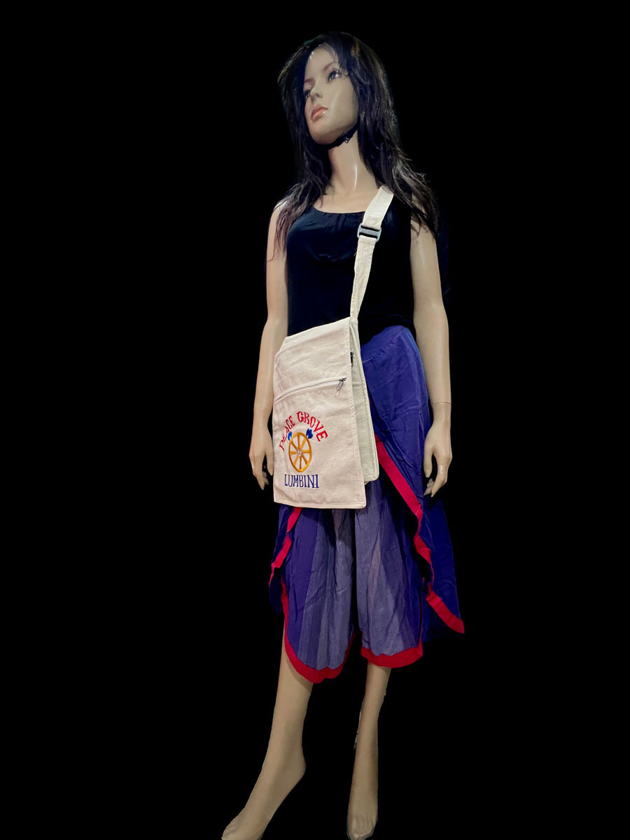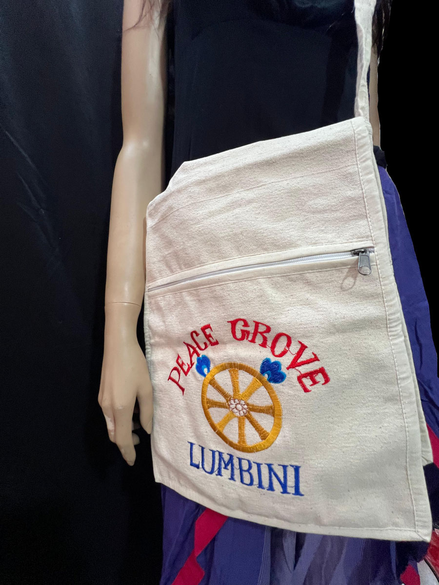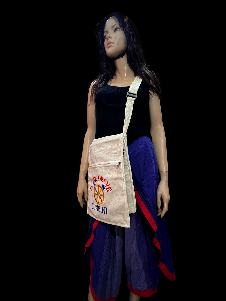 Celebrate peace, heritage, and mindful living with this Handmade Buddha Chakra Sling Bag, crafted in Nepal using 100% handloom cotton. Featuring a vibrant embroidered Peace Grove design symbolizing the Birth of Buddha in Lumbini, it carries the auspicious Dharma Chakra (Wheel of Law)—a sacred Buddhist symbol of harmony and enlightenment.