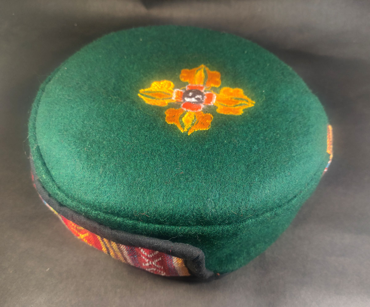This traditional handmade Sherpa cap from Nepal is a versatile and cozy accessory that combines style and function. The black cotton inner fleece lining provides warmth and comfort, making it perfect for cold weather. Its unique design also allows it to be worn as an ear flap cap, providing additional protection from the elements. With its traditional Nepalese embroidery, this cap is not only functional but also a cultural keepsake, making it a great addition to any outdoor enthusiast's wardrobe.