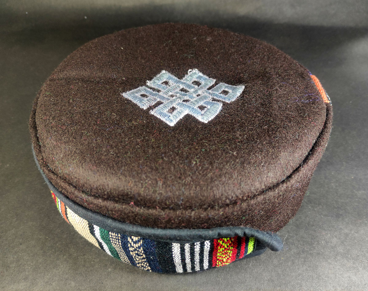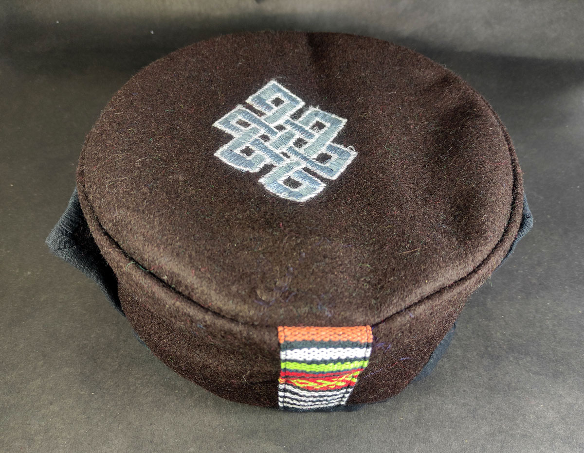 The traditional Sherpa cap from Nepal is a iconic and warm accessory worn by the Sherpa people, who are indigenous to the Himalayan region. The cap is made from wool or yak hair, and is designed to keep the wearer's head and ears warm in the cold climate of the high mountains. The cap typically features a rounded shape with a pom-pom on top, and is often adorned with colorful tassels or embroidery. The Sherpa cap is not only a functional piece of clothing, but also a symbol of cultural heritage and identity for the Sherpa people, who are known for their expertise in mountaineering and their ability to thrive in the harsh conditions of the Himalayas.