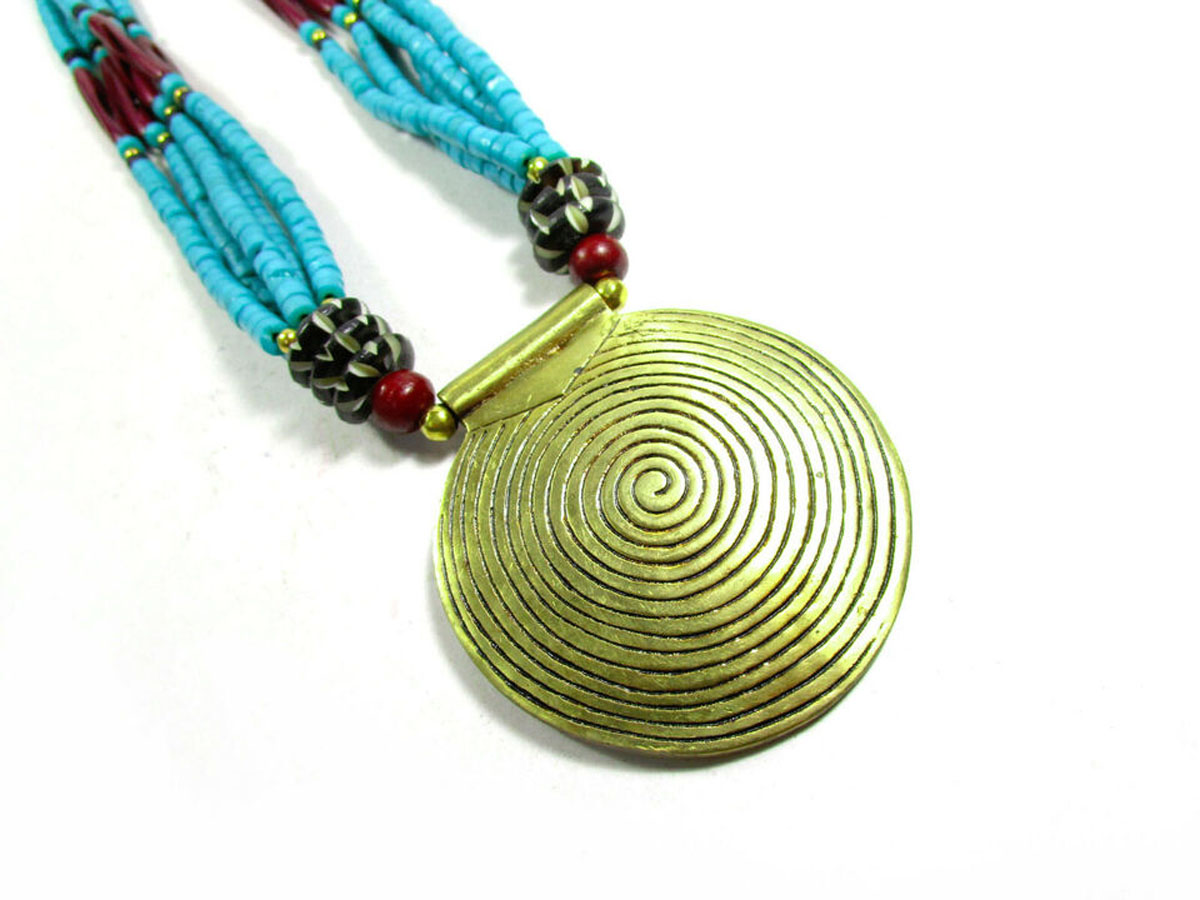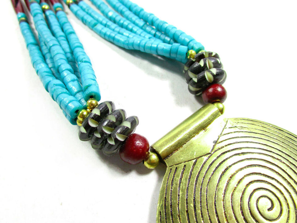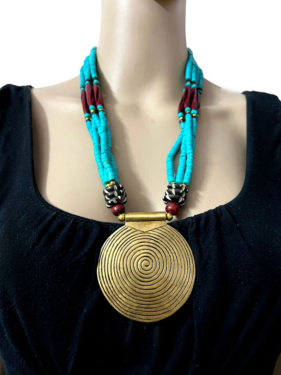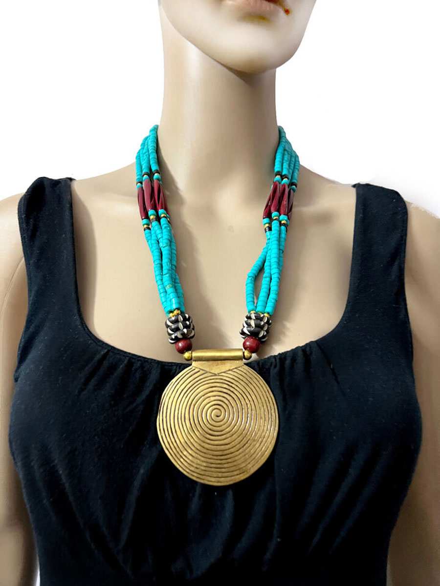 This is a gorgeous Tibetan Bovine Bone beads with center spiral solid Brass metal pendant, ethnic motifs worn by Naga/Tibet and Tribal people from other parts of India (Brand new).