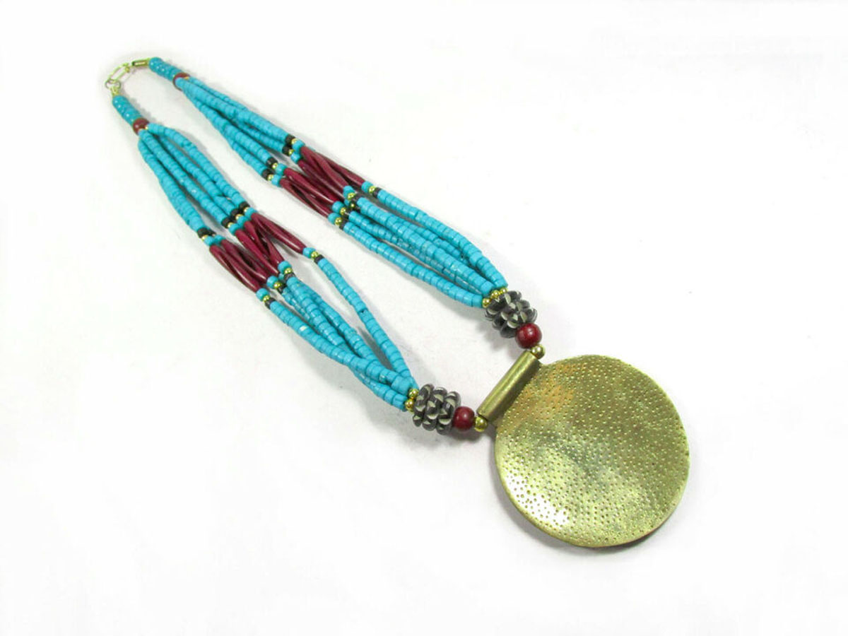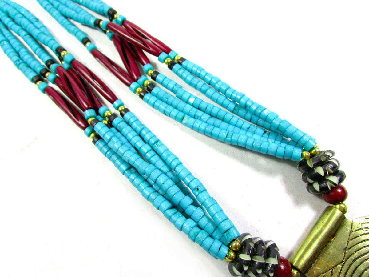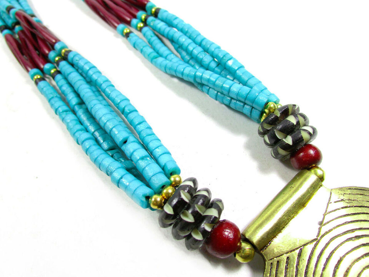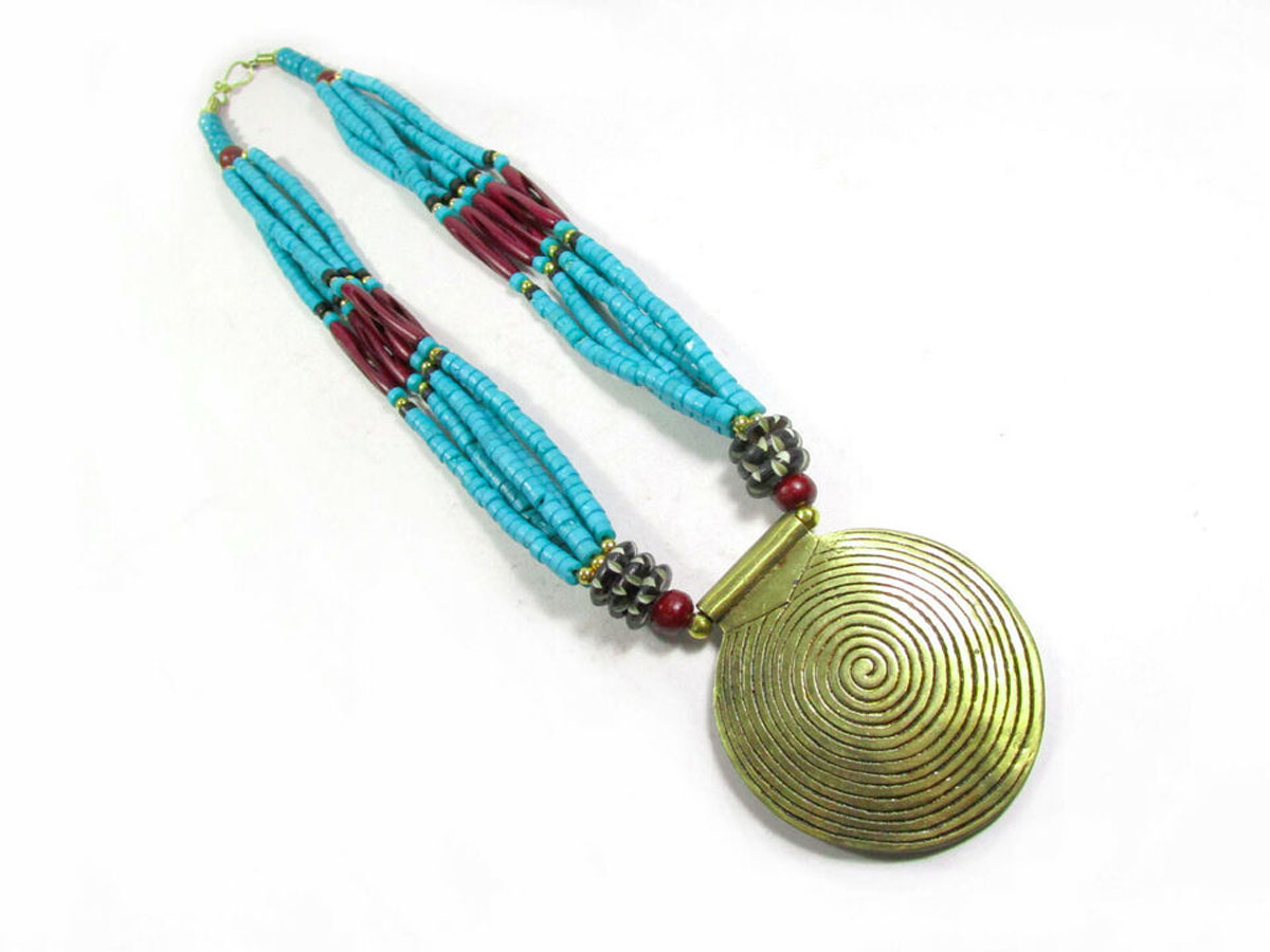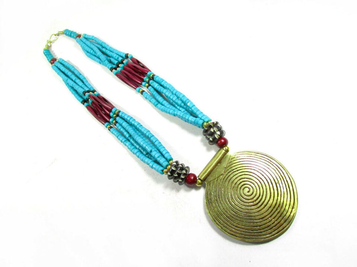 This is a gorgeous Tibetan Bovine Bone beads with center spiral solid Brass metal pendant, ethnic motifs worn by Naga/Tibet and Tribal people from other parts of India (Brand new).
