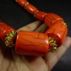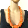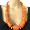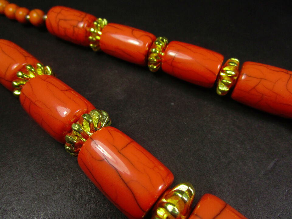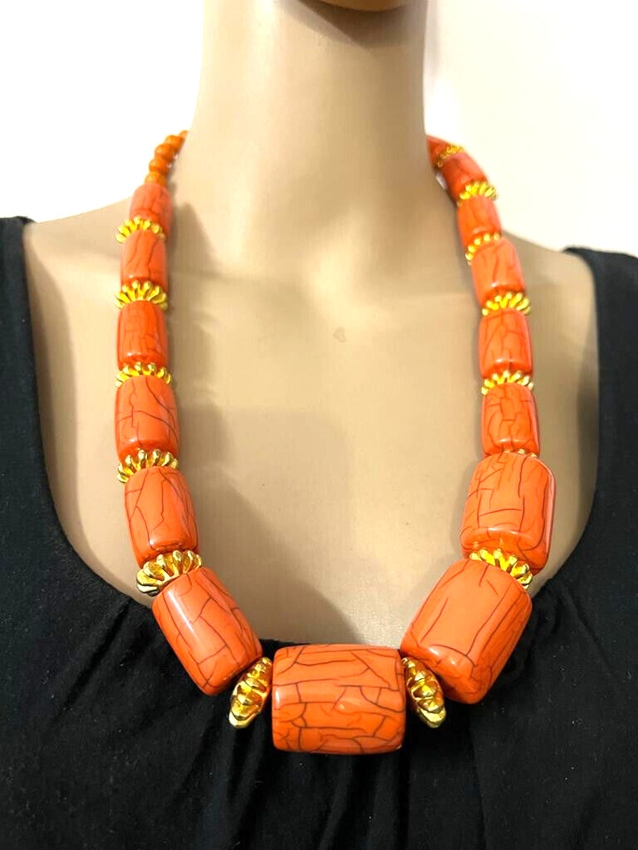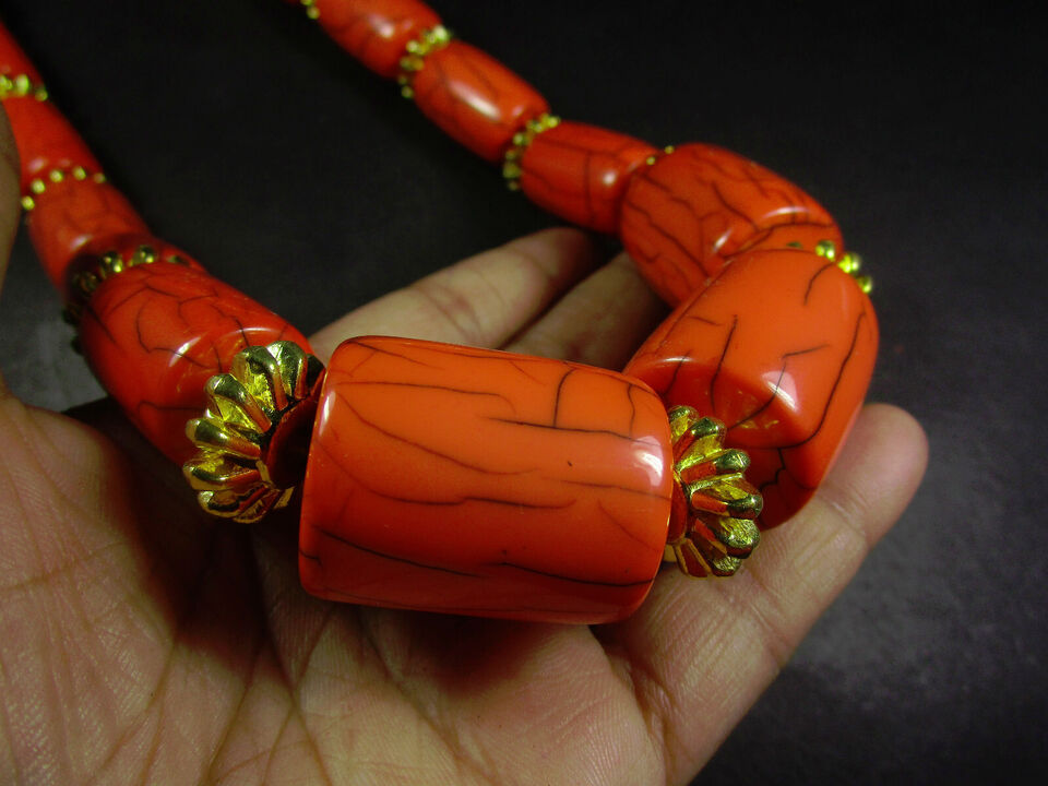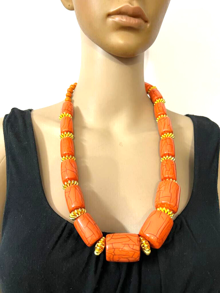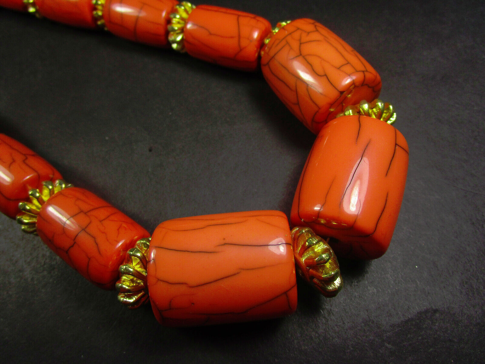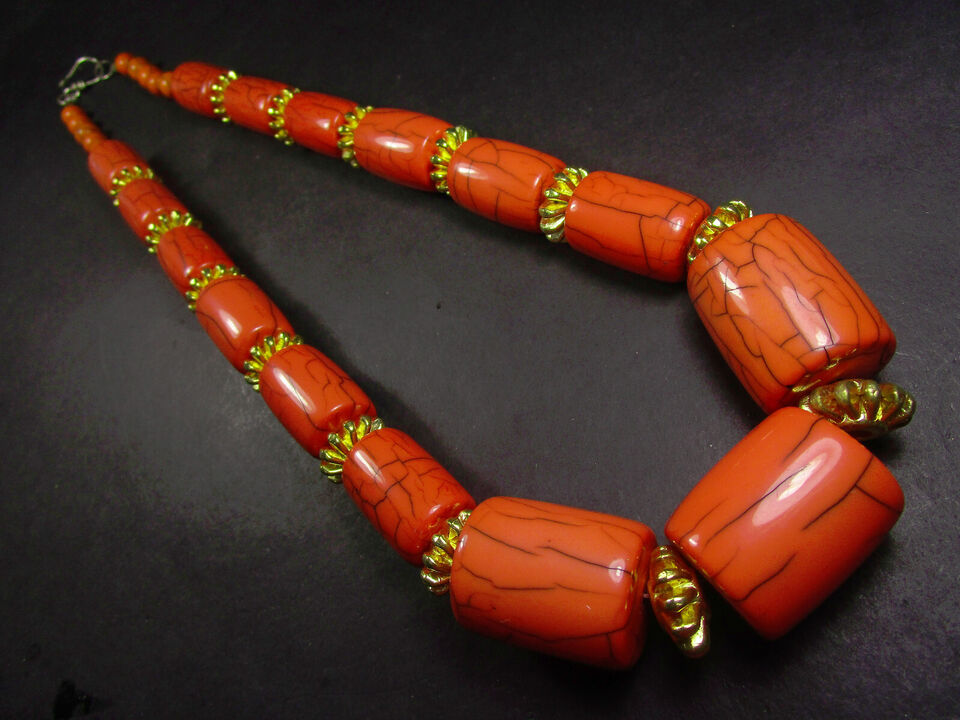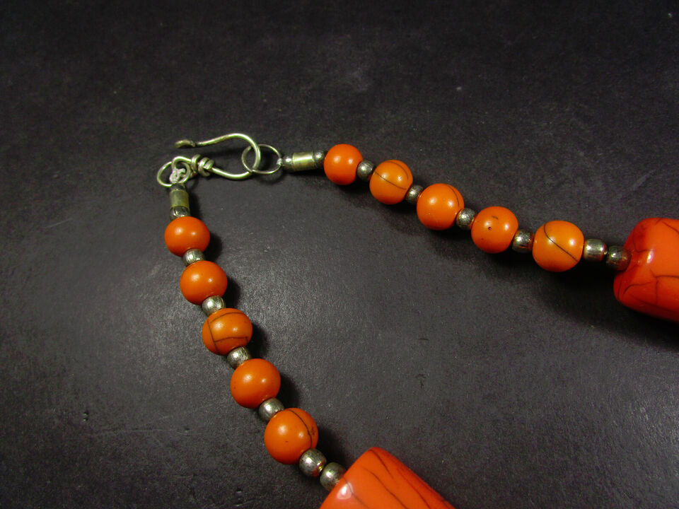 It is an ethnic Tibetan, Orange color resin with brass/silver tone beads Necklace handmade from India.