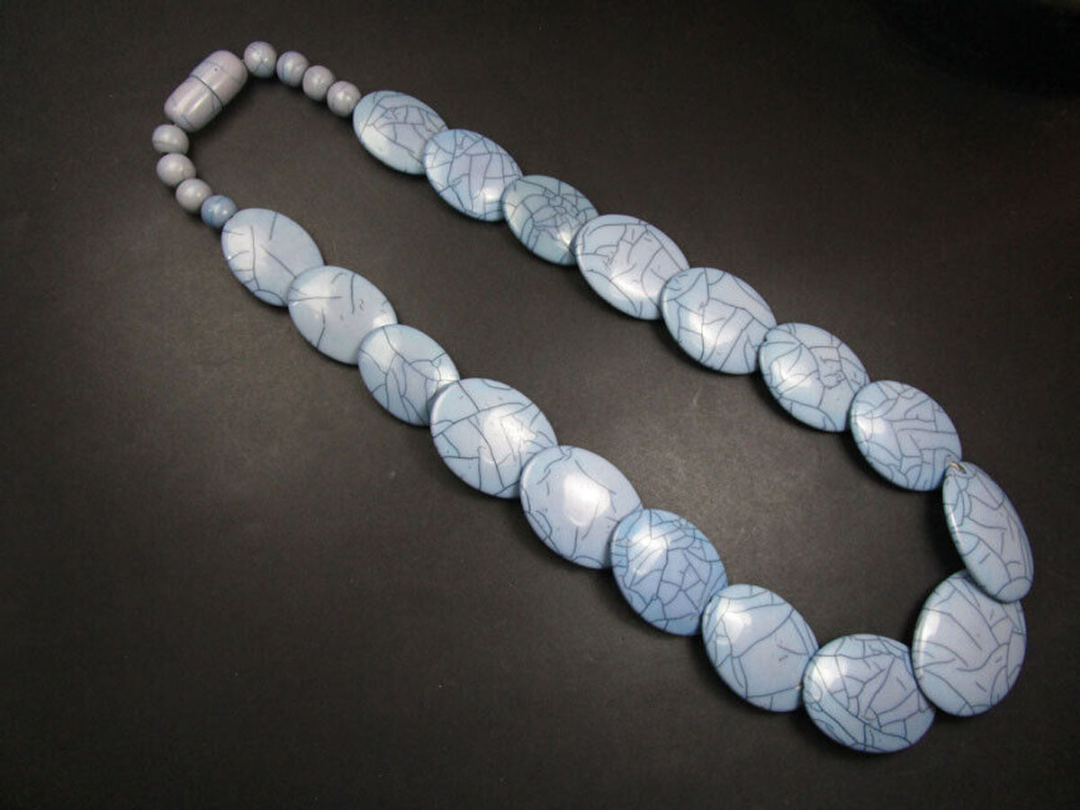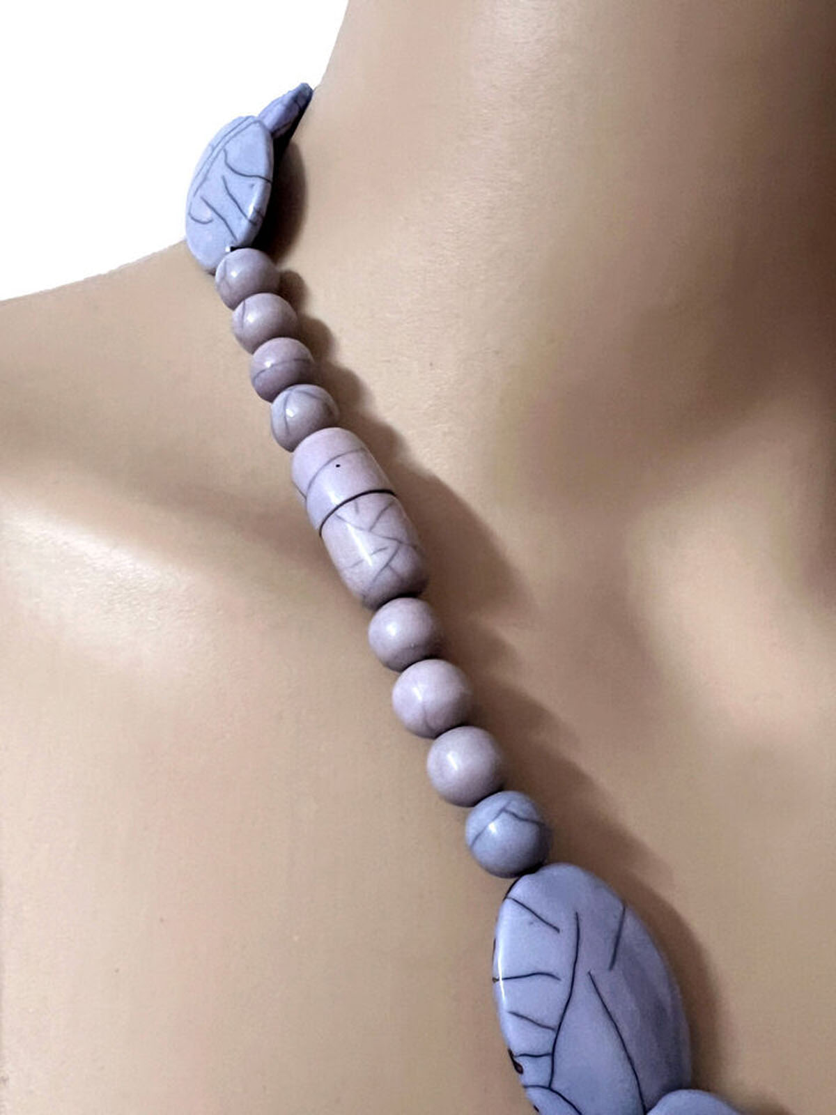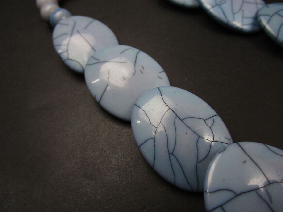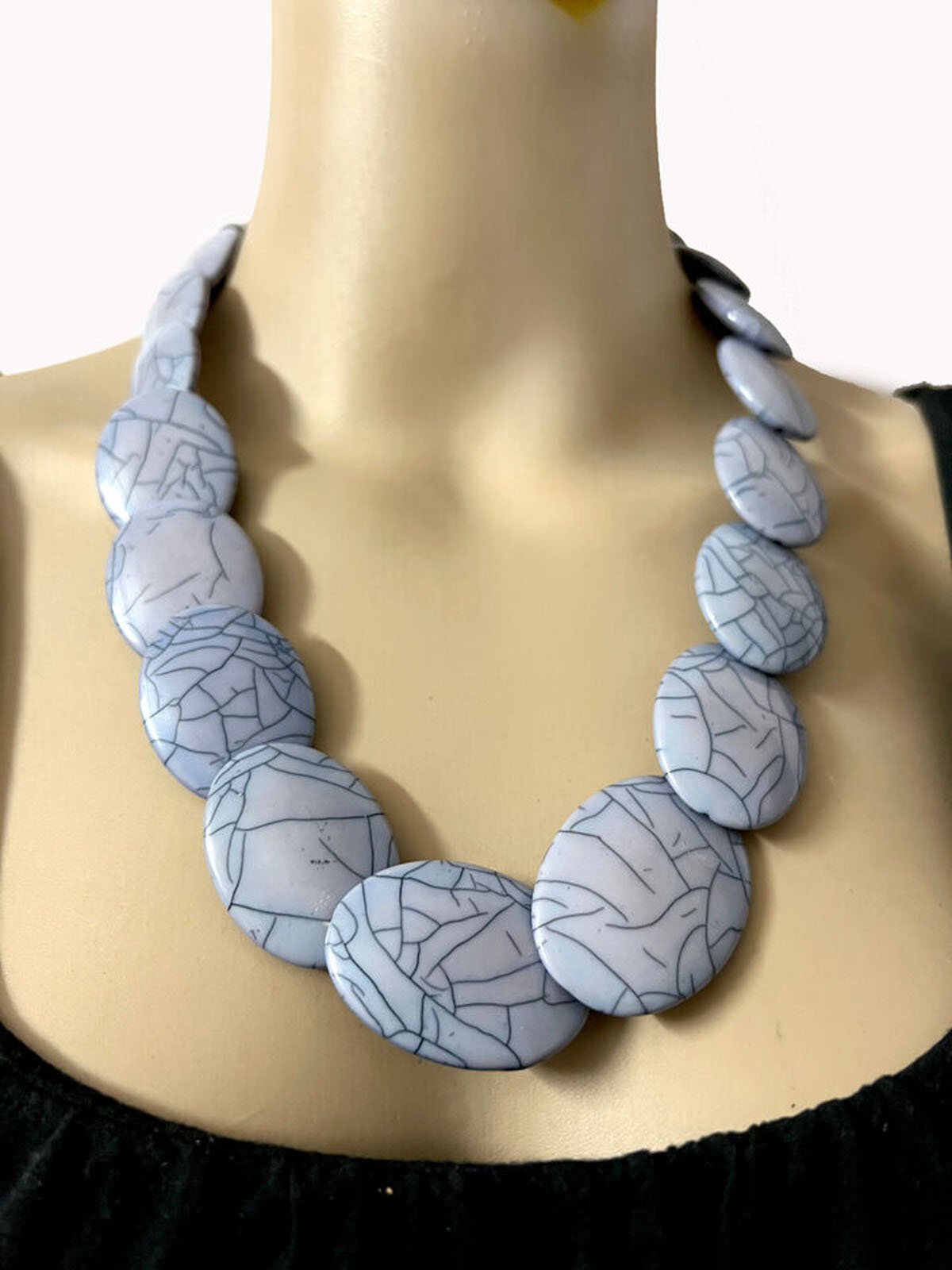 This beautiful necklace features a bold Tibetan design with oval-shaped resin beads. It offers a striking blend of traditional and contemporary style.