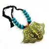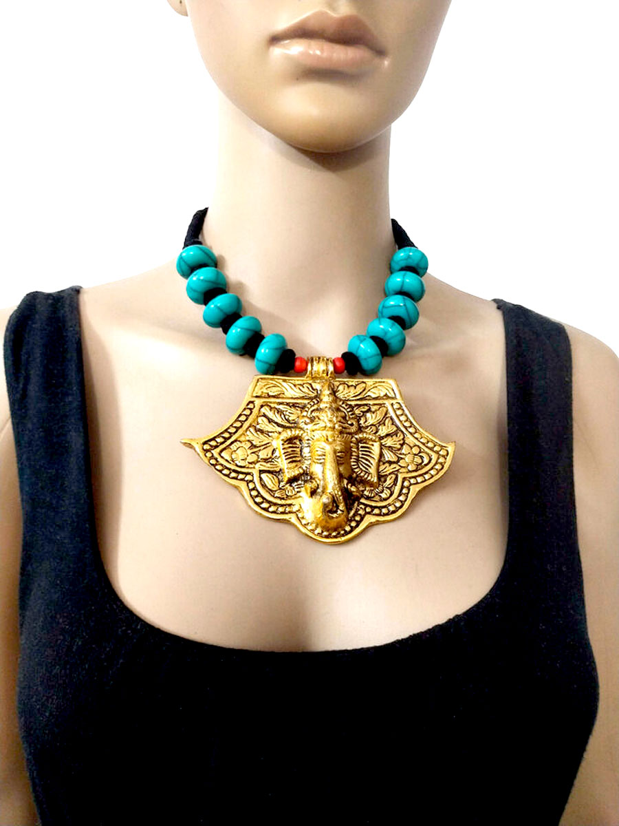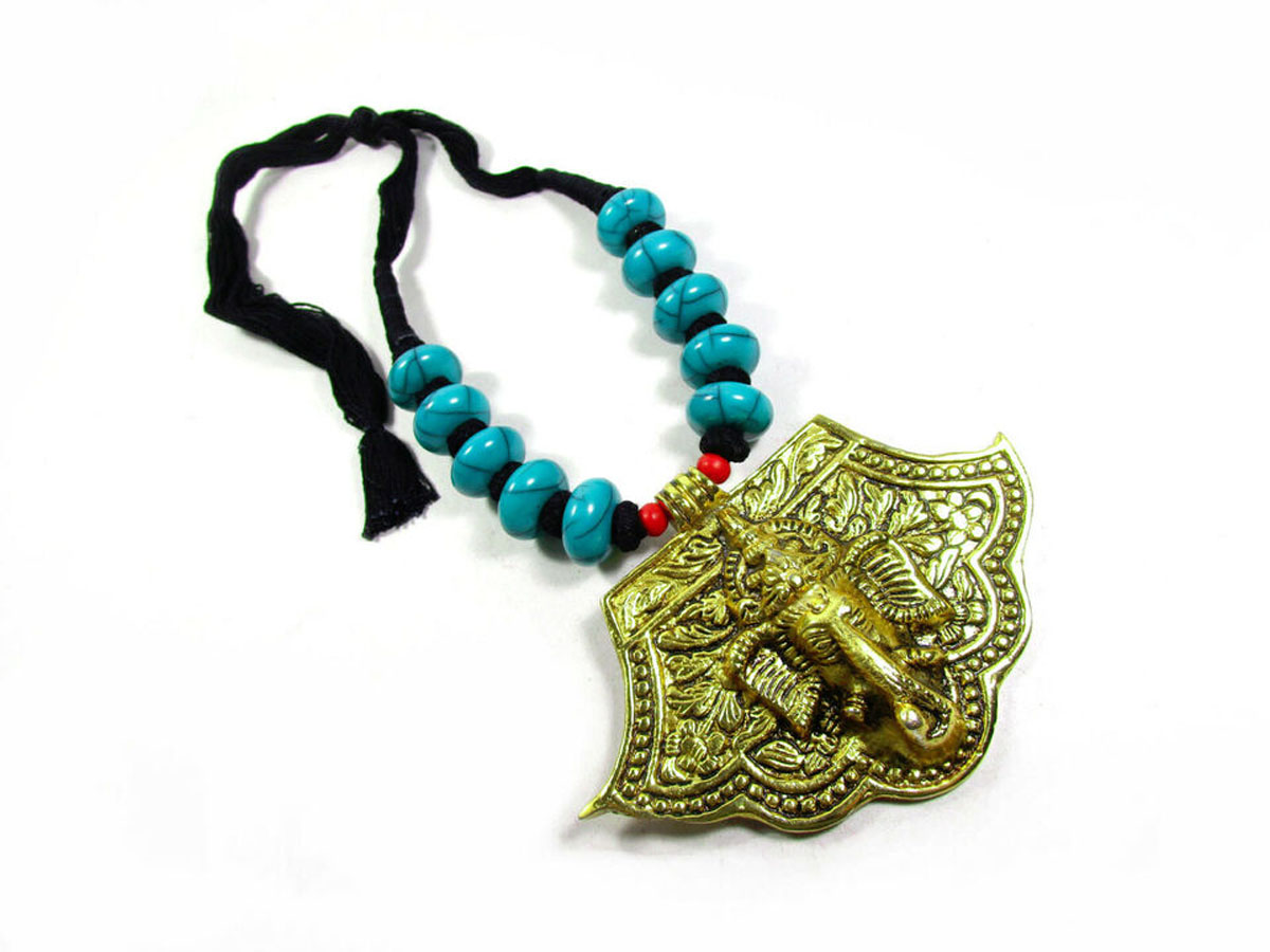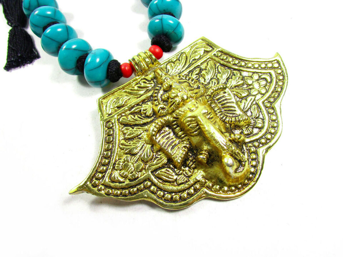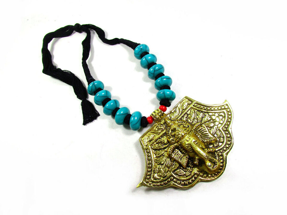 Introducing a beautifully handcrafted necklace featuring an embossed Om Ganesha pendant, set against a striking black thread. This long, ethnic-style necklace hails from India and boasts a bold and unique design.