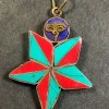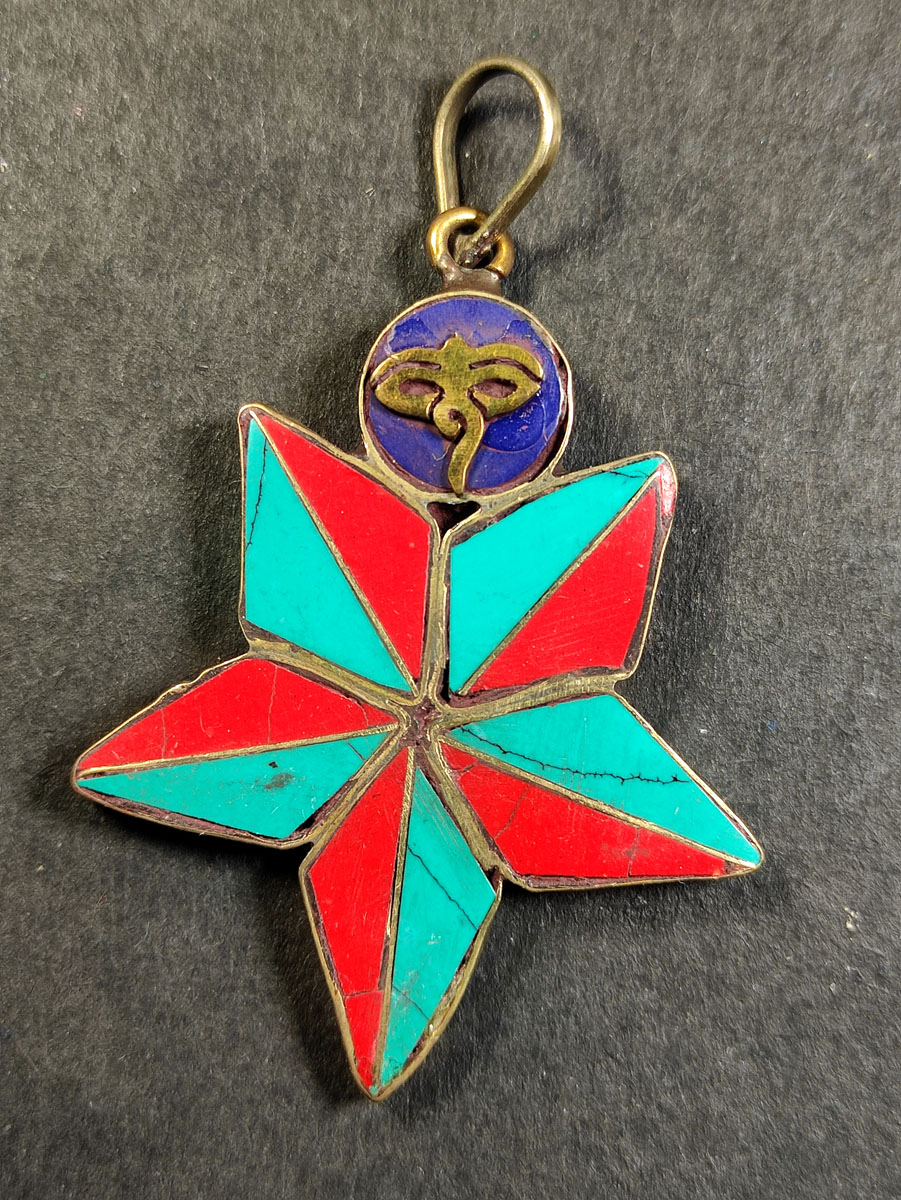It is an ethnic Tibetan Auspicious Star Lotus Buddha Eye resin with white metal amulet Pendant handcrafted by the local artisans of Kathmandu, Nepal. Very well made (Brand new).