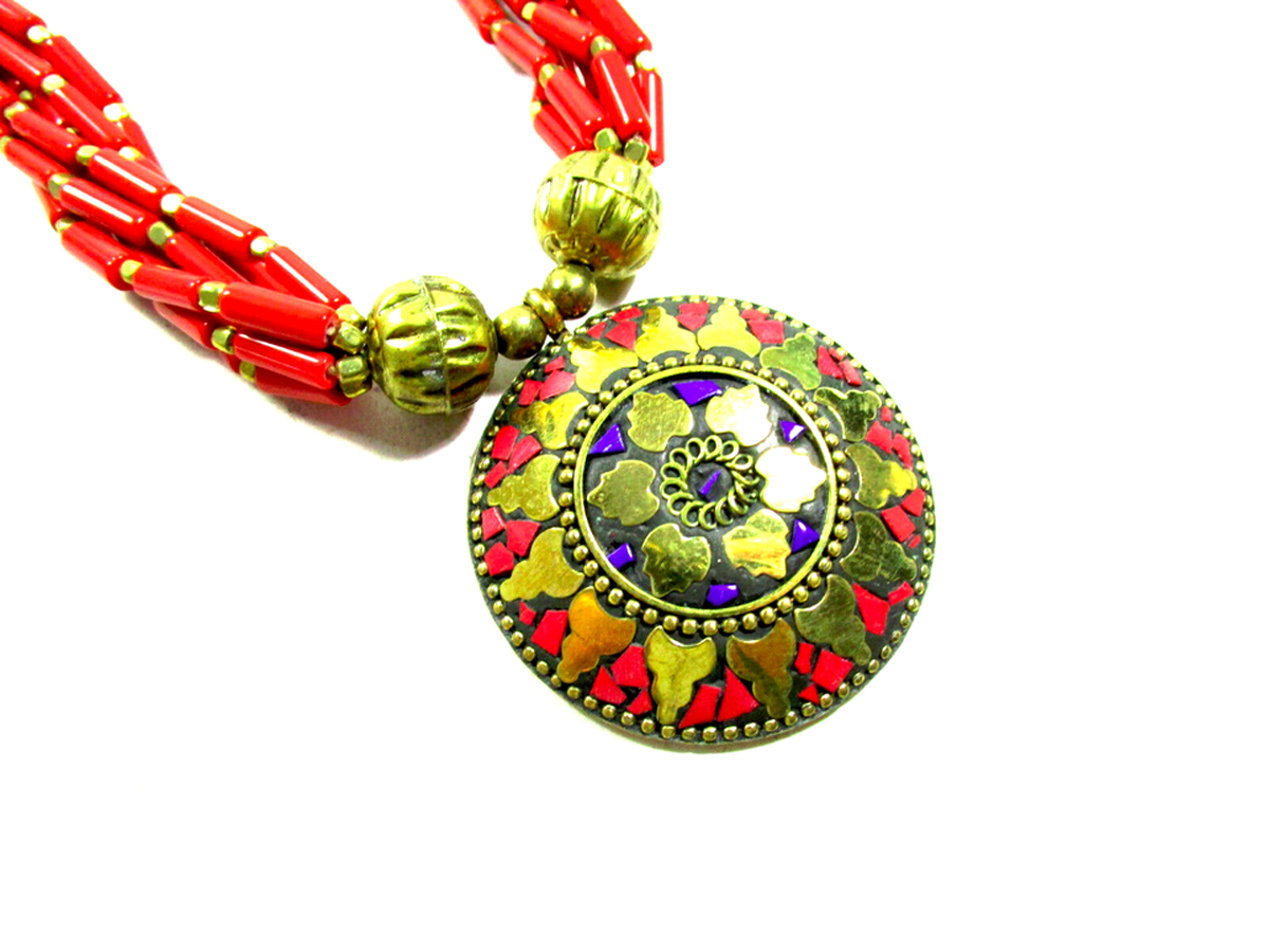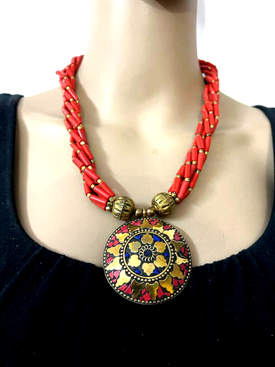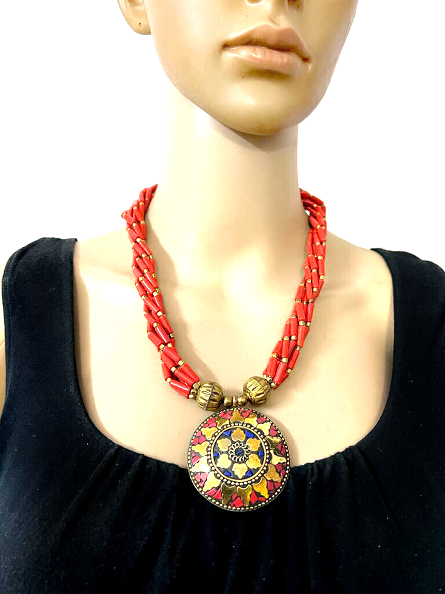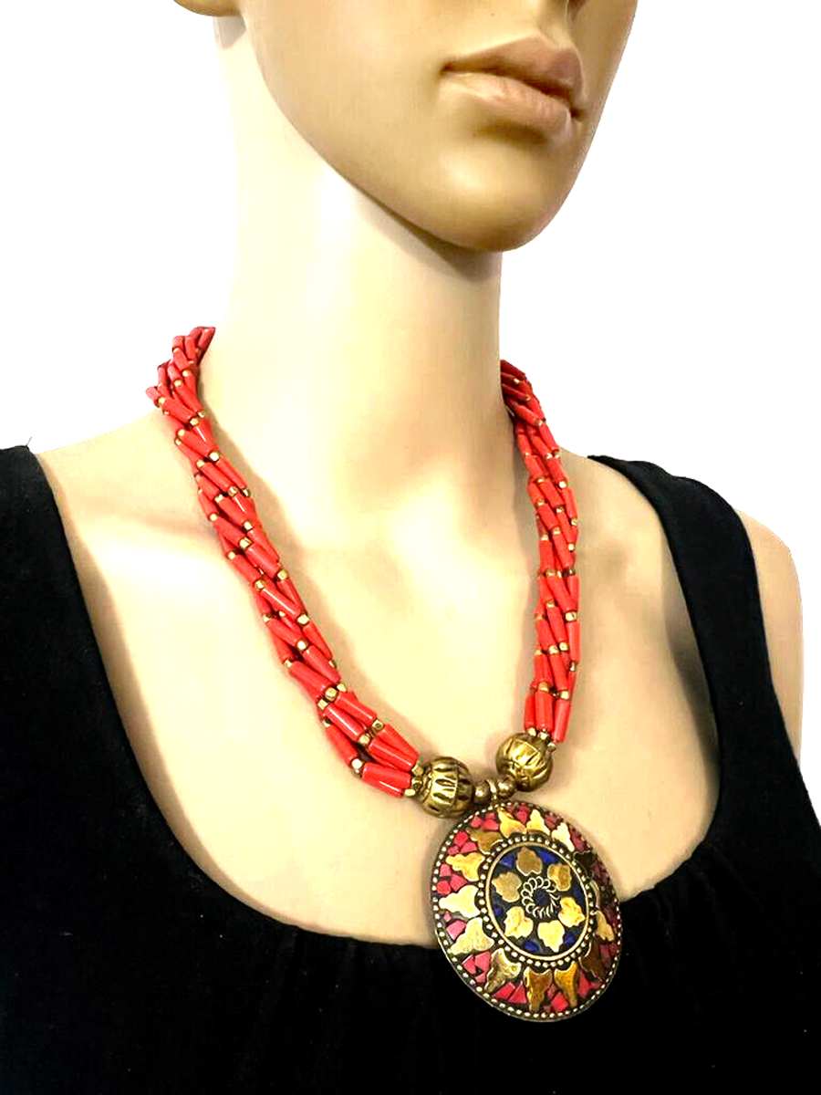 This is an Ethnic, Tibetan Bold lapis lazuli, coral color resin, glass with brass beads pendant handmade Necklace from India/Nepal. Looks very ethnic Indian.