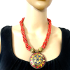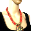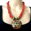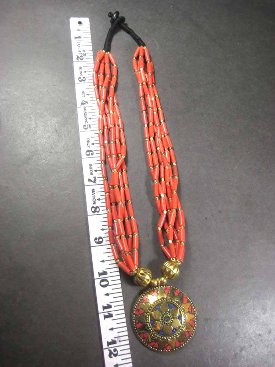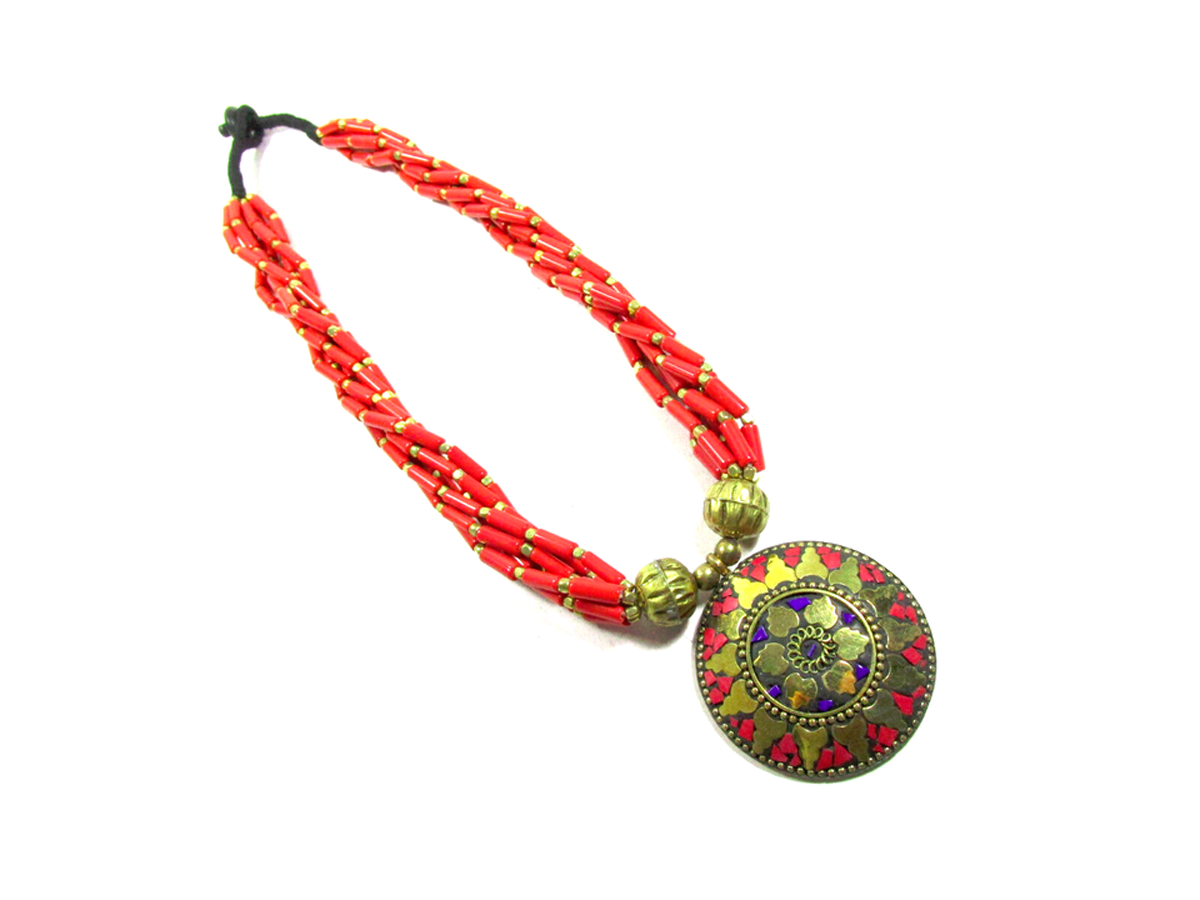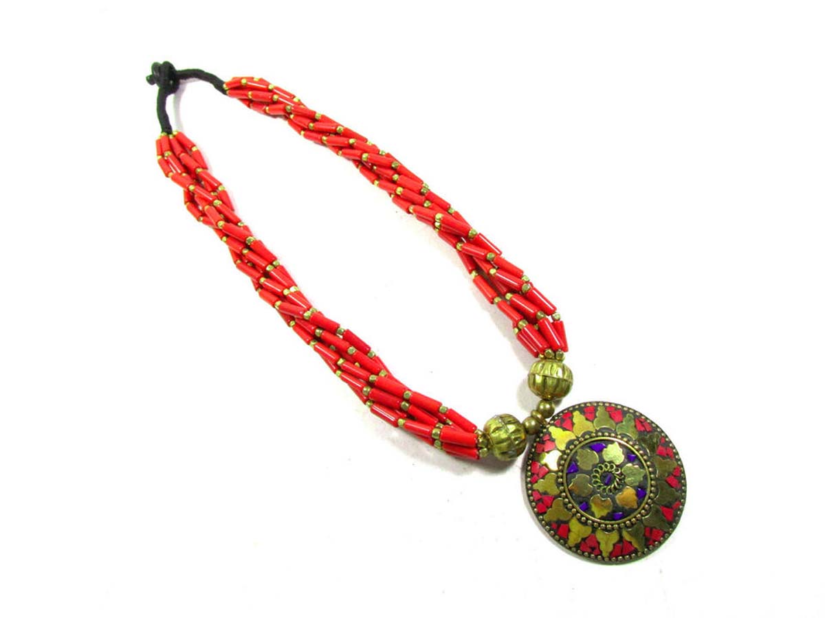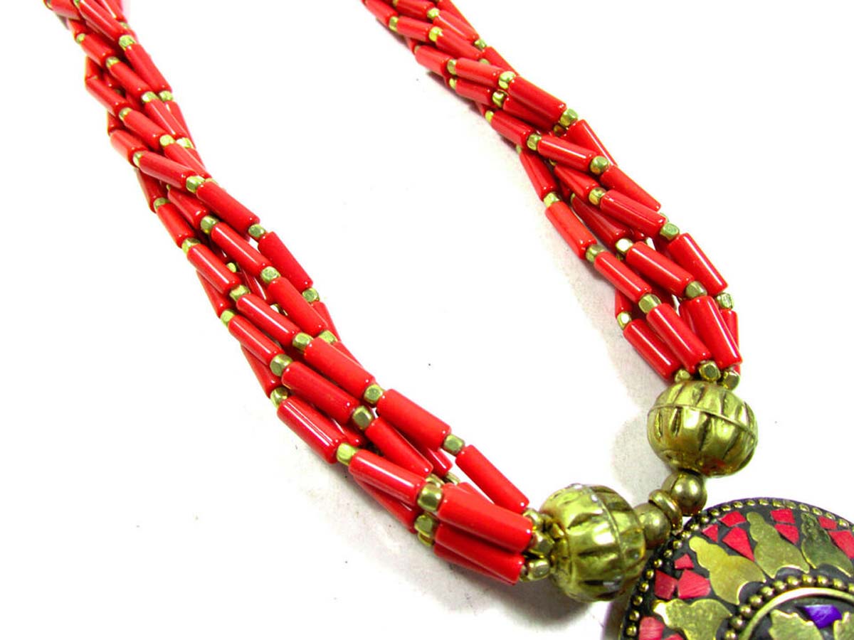 This is an Ethnic, Tibetan Bold lapis lazuli, coral color resin, glass with brass beads pendant handmade Necklace from India/Nepal. Looks very ethnic Indian.