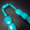 This striking necklace features a bold Tibetan design, showcasing oval-shaped beads crafted from resin and brass. Its unique and eye-catching appearance makes it a standout piece.