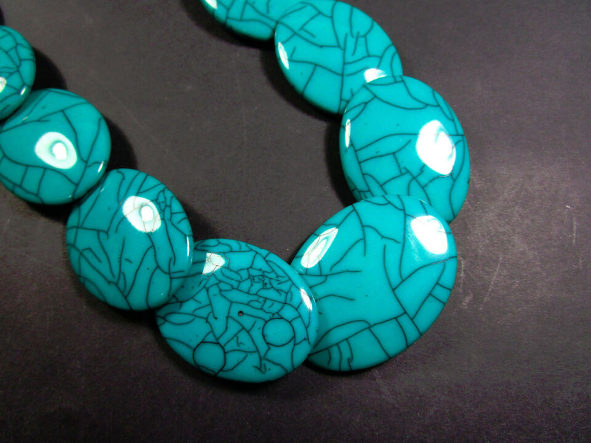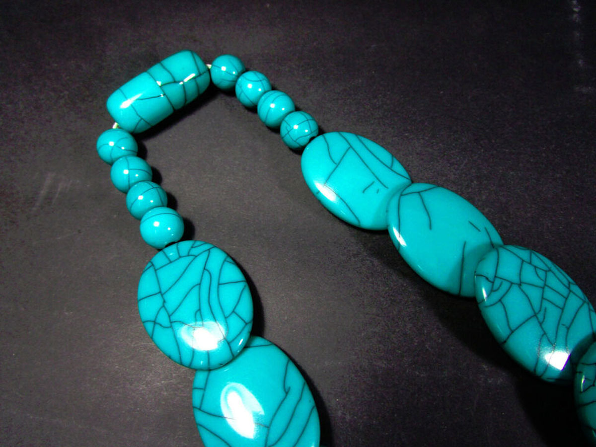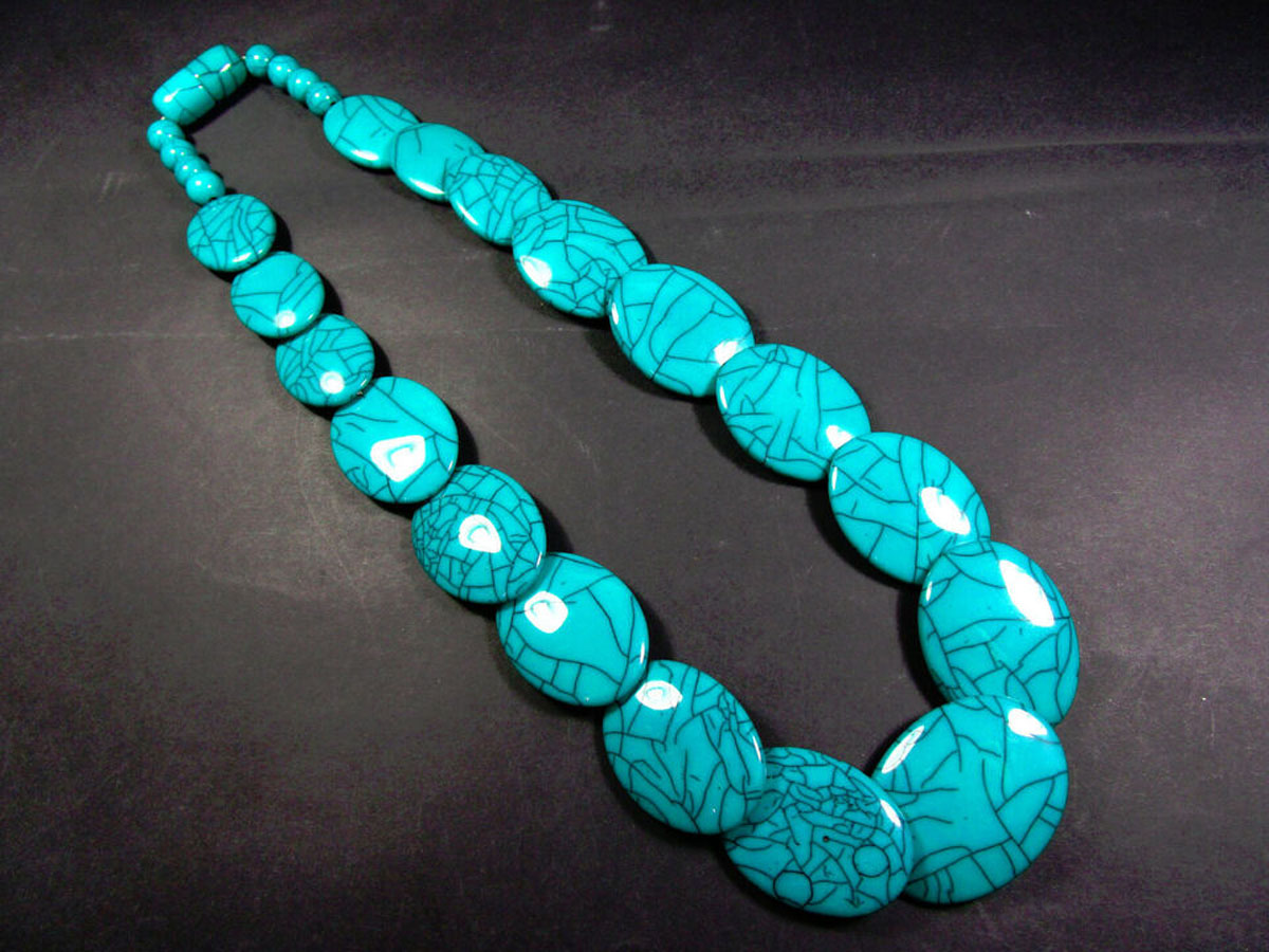 This beautiful necklace features a bold Tibetan design with oval-shaped resin beads. It offers a striking blend of traditional and contemporary style.
