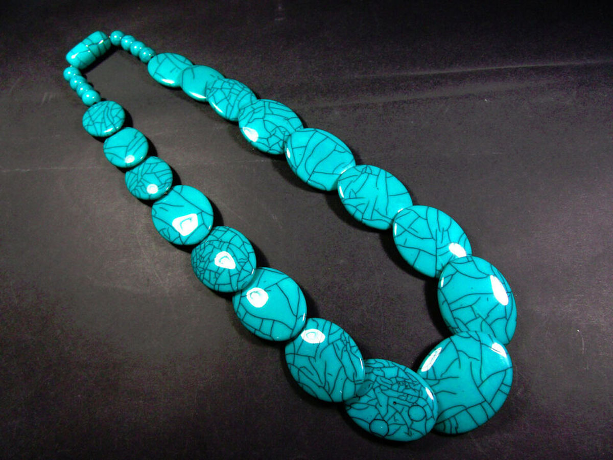 This necklace’s unique design and vibrant colors make it a distinctive accessory, perfect for adding a bold statement to any outfit.