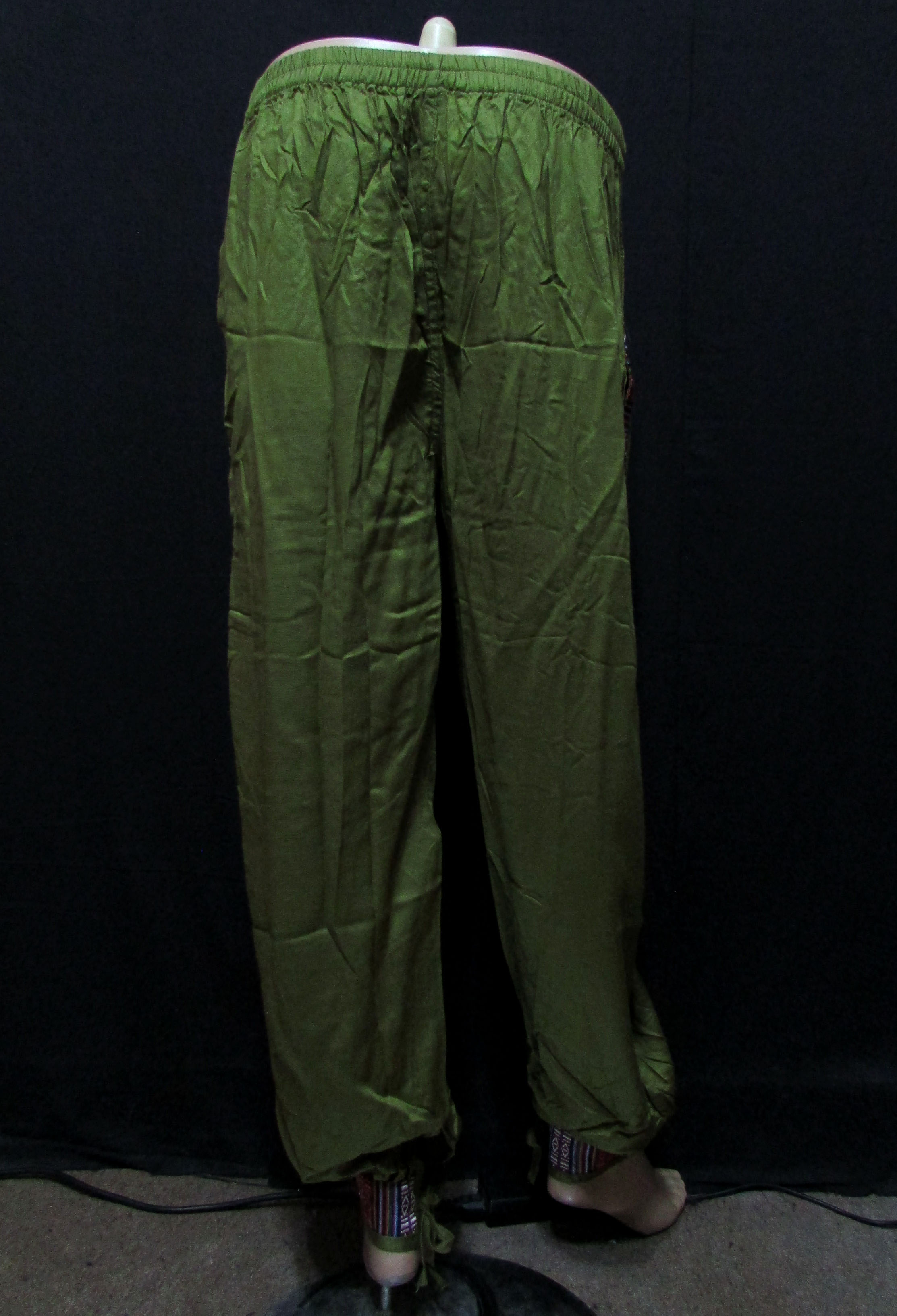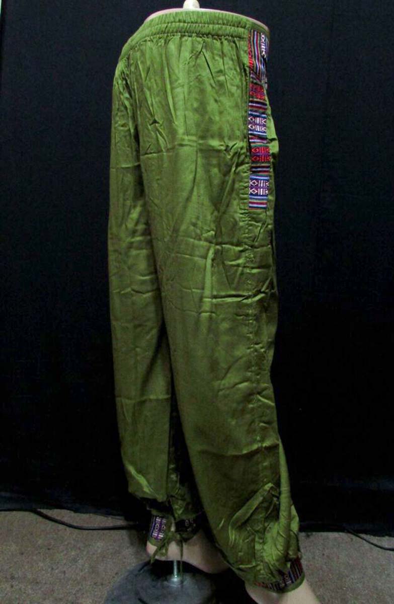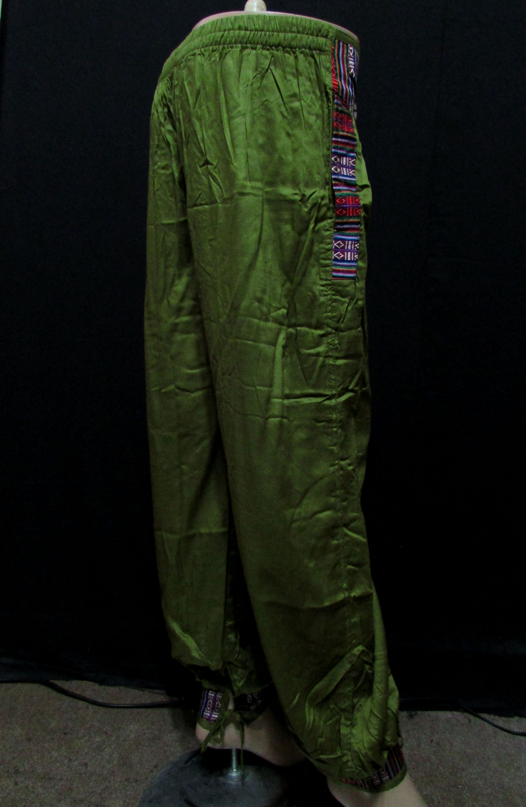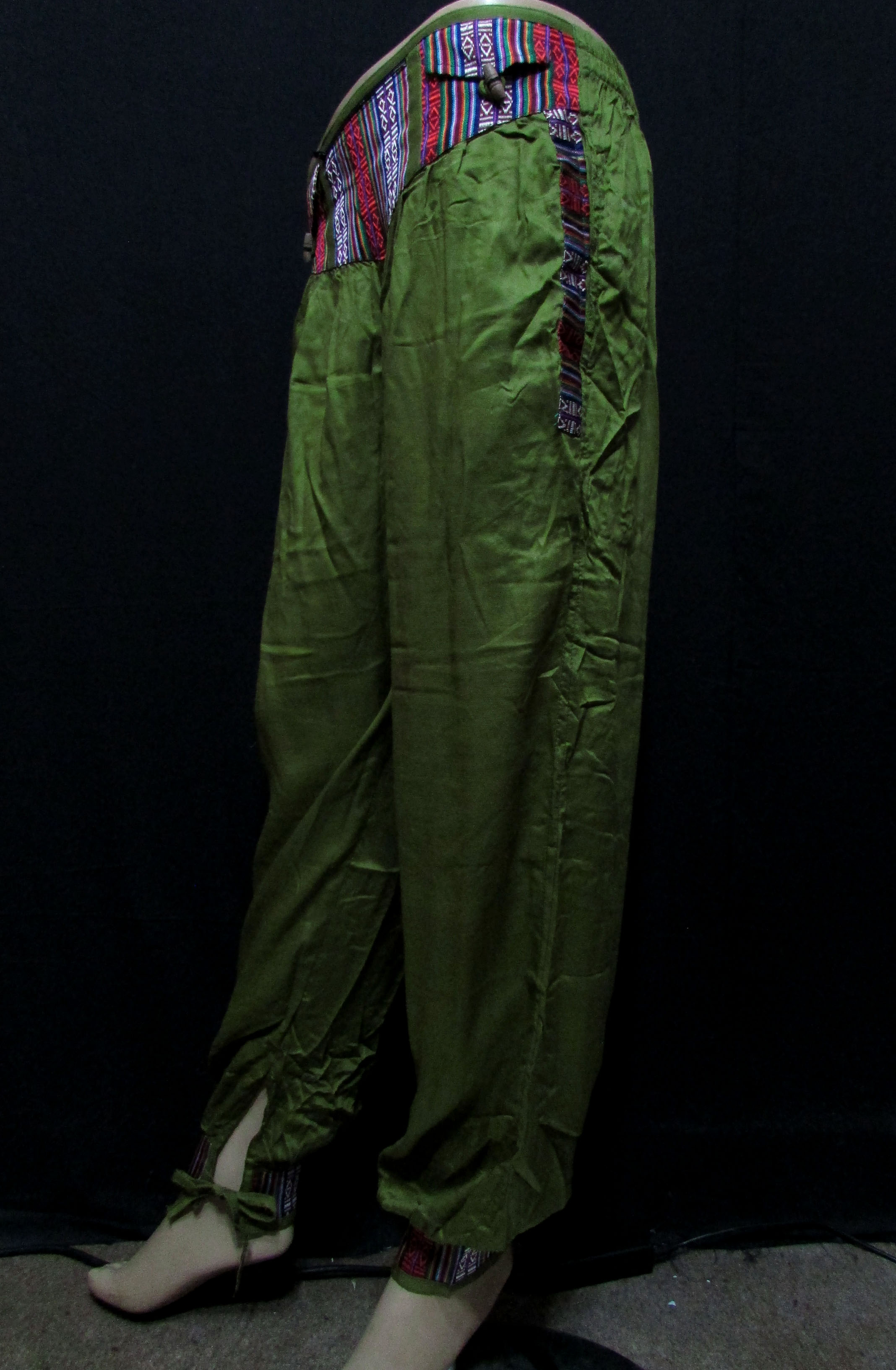 This a brand new (with tag) garment cotton/ rayon fabric trouser entirely handmade in Nepal. It has elasticated waistband at the back. The trouser has two inside pockets and three small coin pockets at the front. It can be used as casual wear. The tie in the ankle will make you feel comfortable as well as stylish looks.