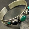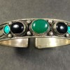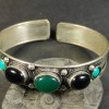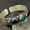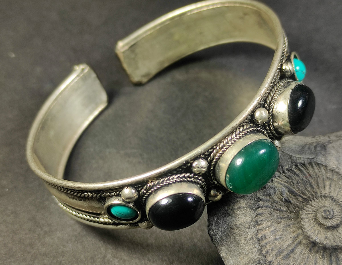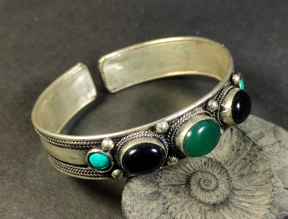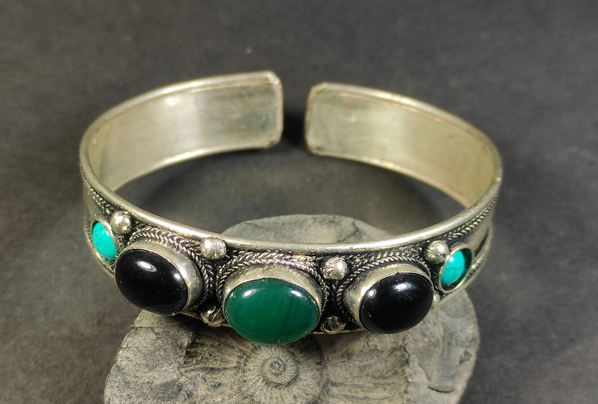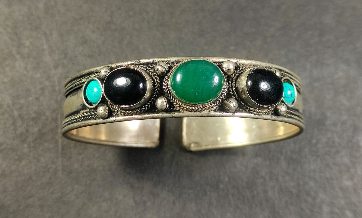 The immaculate wire braided work is achieved by hand-weaving Tibetan silver threads, creating a unique, braided effect. Decorated with lovely Green and Black Onyx stones. Very well made (Brand New). Everything put together very beautifully, making it the perfect ethnic piece. Inside of the bracelet is plain.