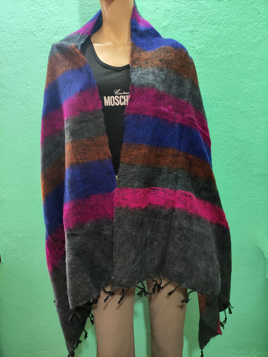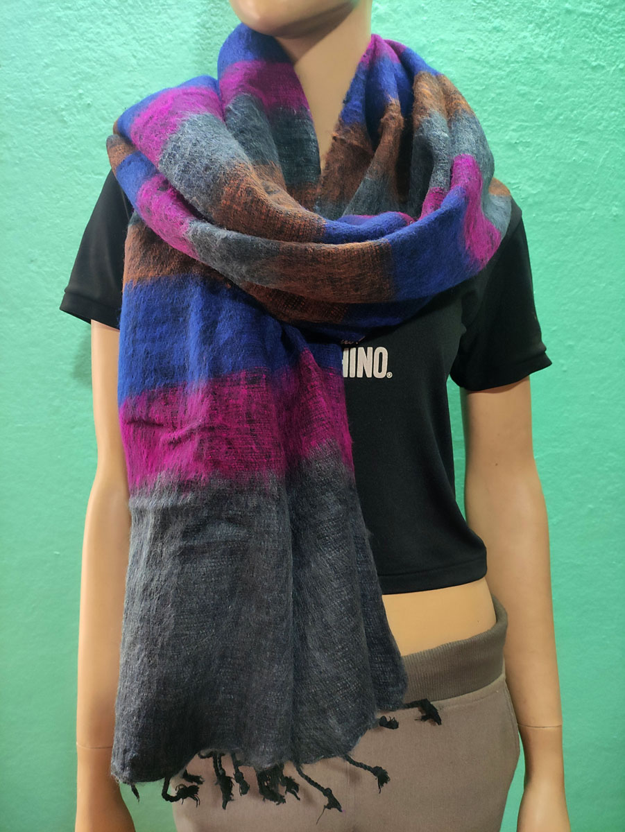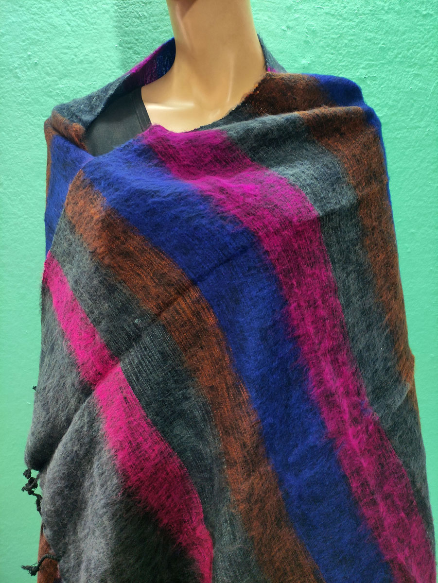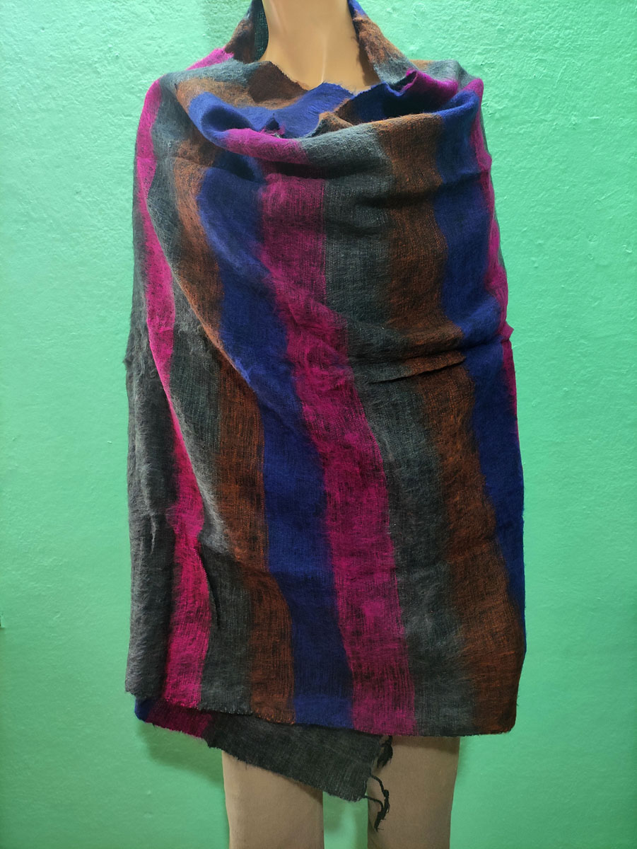 The shawl has been hand loomed by local artisans in Nepal. It is blended with yak wool and cotton. It is very soft, gentle, very warm yet light to wrap. Gentle hand wash or steam clean.