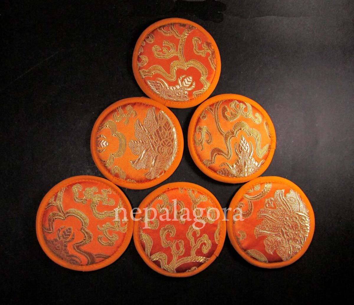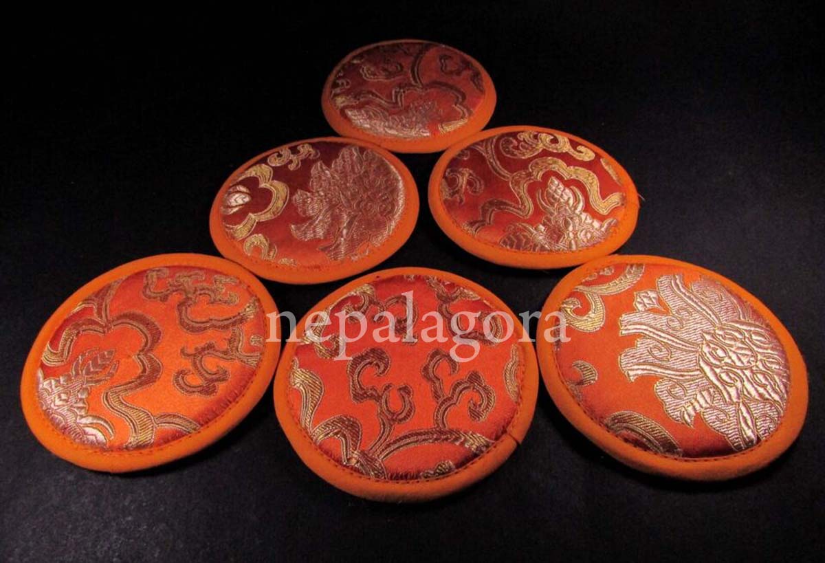 This handmade set of 6 silk brocade Mandala singing bowl cushion pillows measures 10 cm in size. The pillows are adorned with intricate silk brocade designs and are perfect for the singing bowl. The cushions are filled with a soft, plush material that provides comfort and support, making them ideal for use with a singing bowl or as a decorative accent for any room.