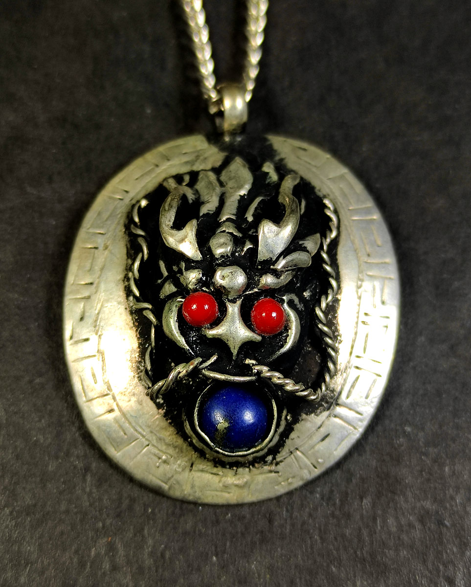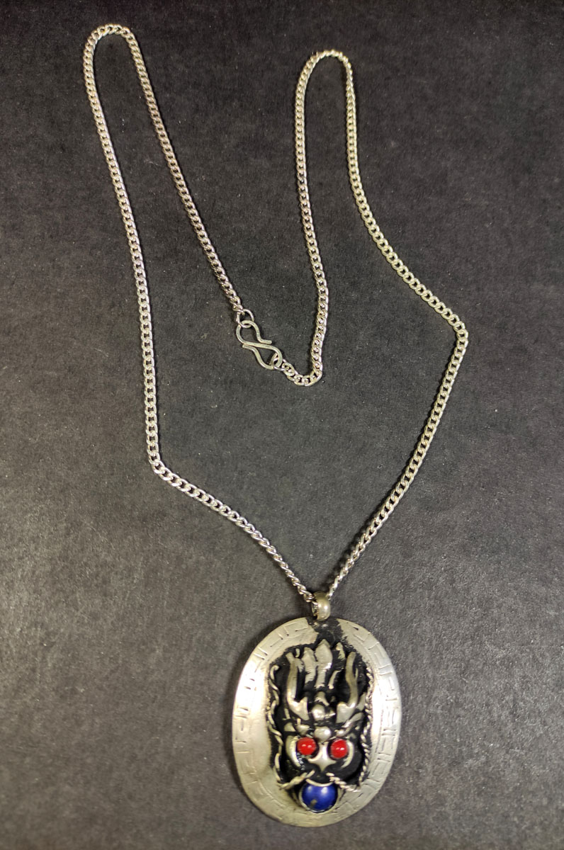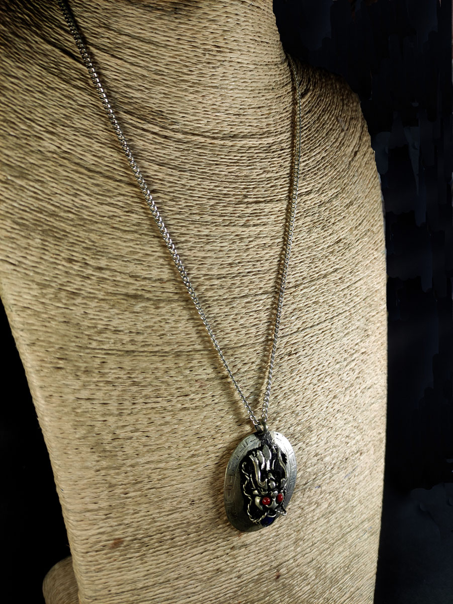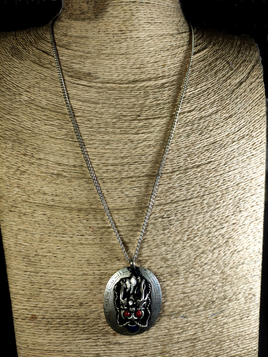 It is a Dragon head silver polished pendant with chain, all handmade by the local Newa artisans of Kathmandu, Nepal.