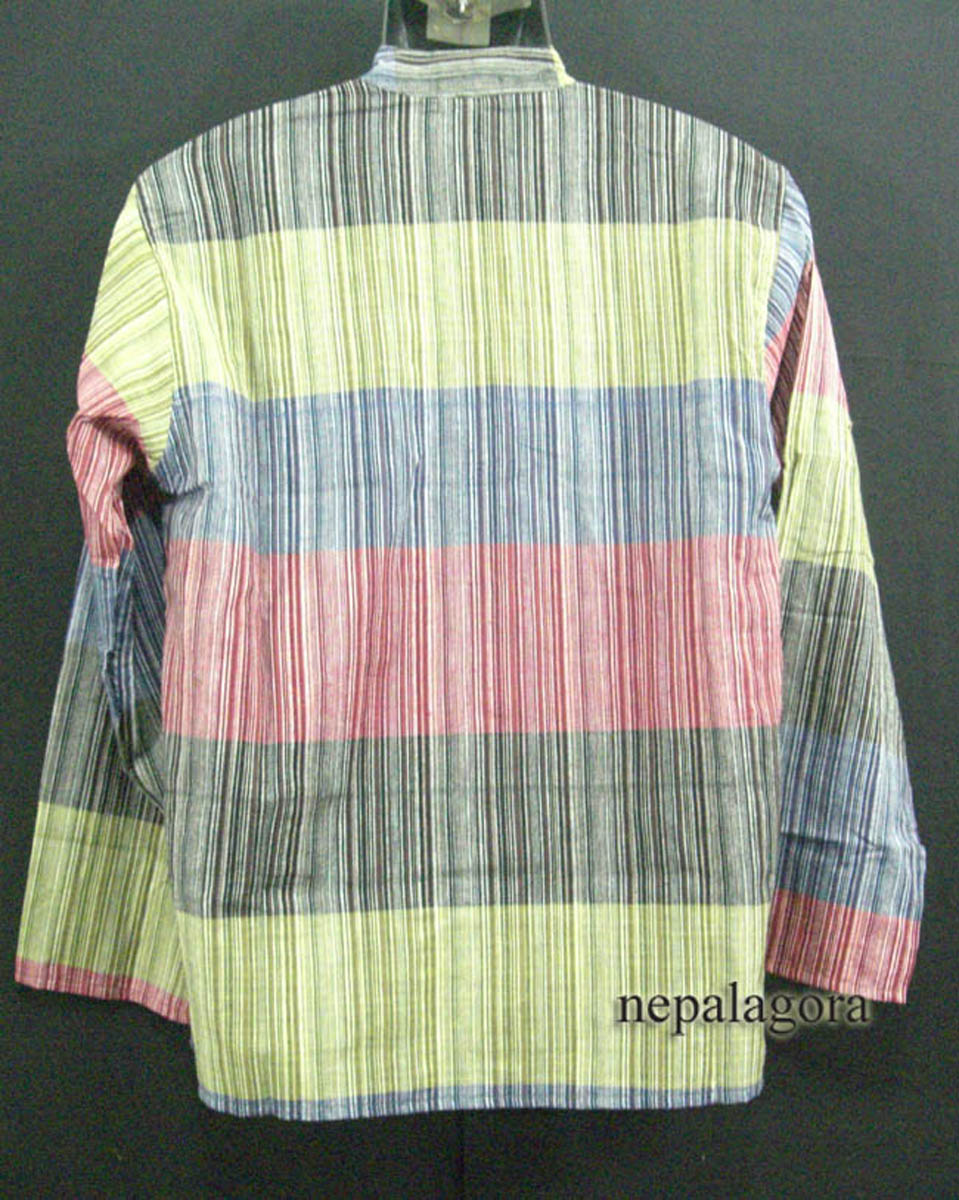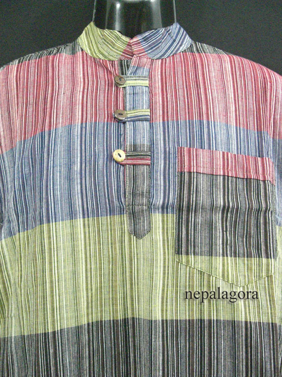 These handloom 100% cotton fabrics here in Nepal are known as "Khadar". These fabrics are well known being light and it gets soft as it is used and come in many different color variations that you can choose from. Very good for a hot climate, as it absorbs body moisture to help keep the skin dry. These shirts are known as Grandad Collar also known as Chinese Collar.