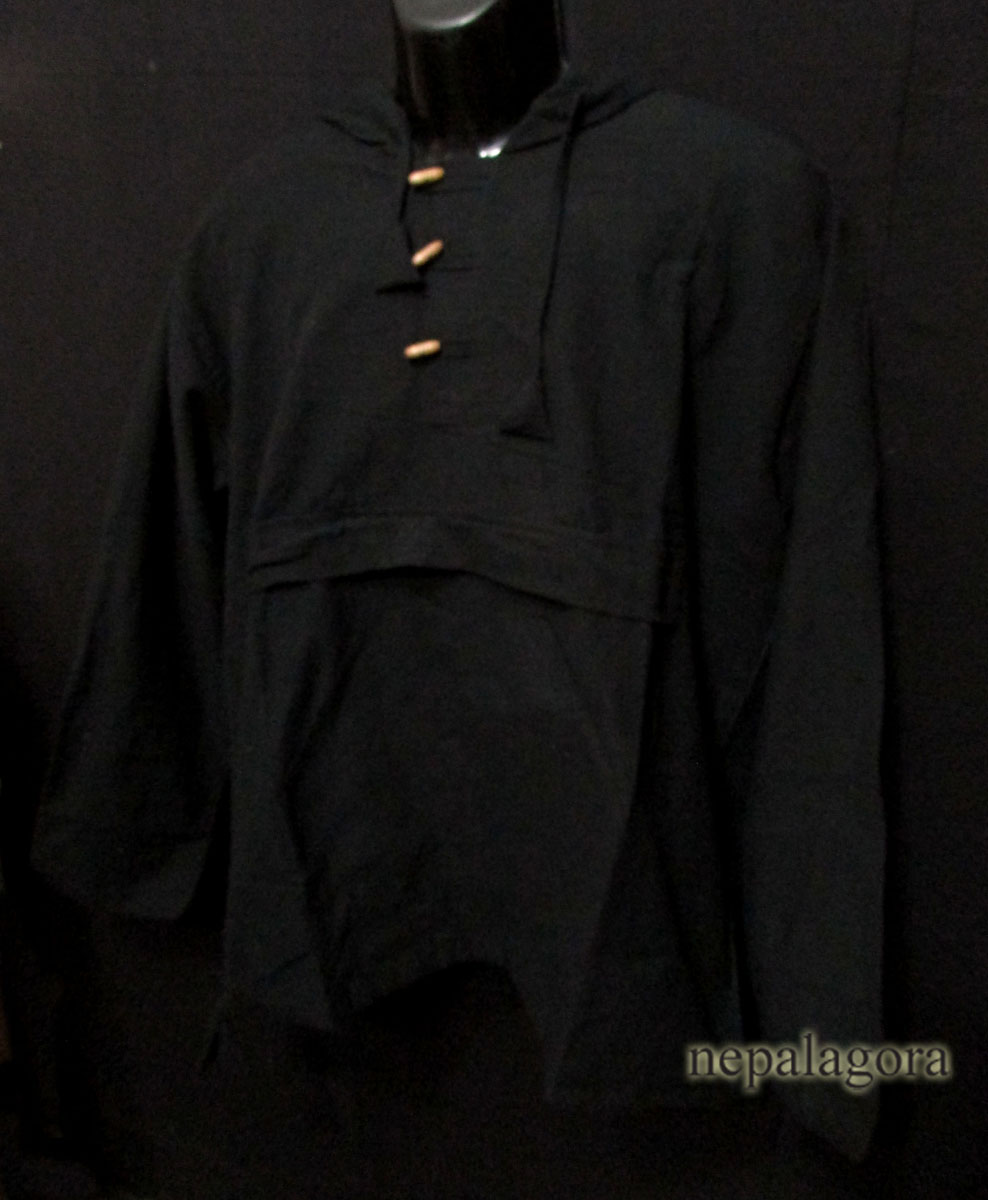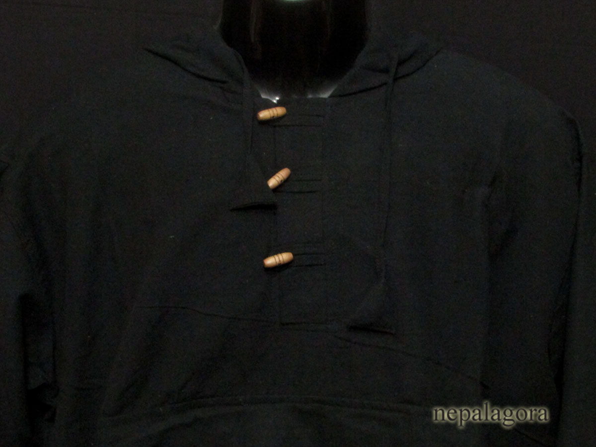 This is a brand new (with tag) garment 100% cotton handloom hooded shirt Nepal. This is a winter hoodie having three unique wood button in the front and three pockets with long sleeve. It has a drawstring at the hood and waist which looks very classic and stylish. We can use it as casual wear in the winter.