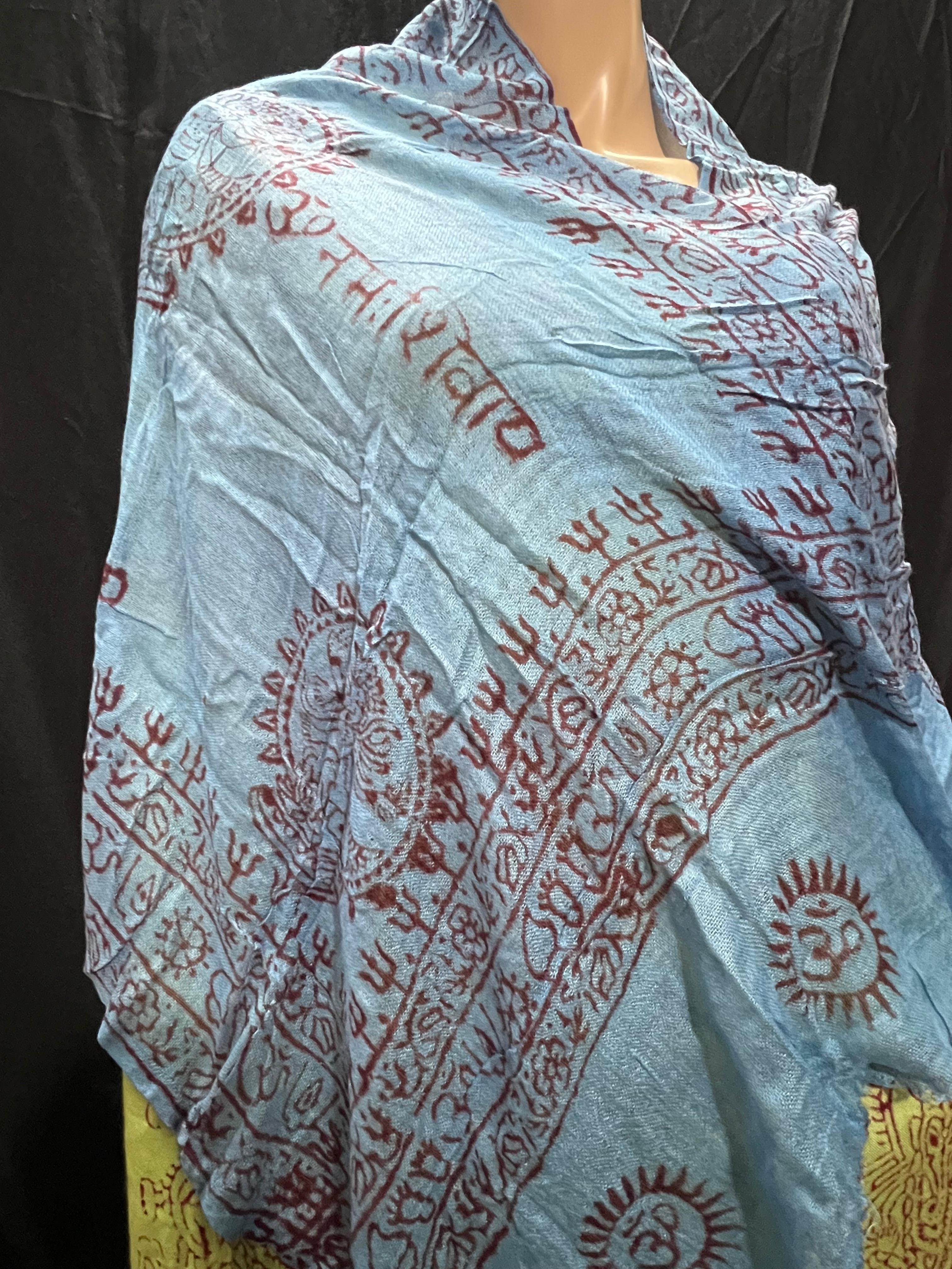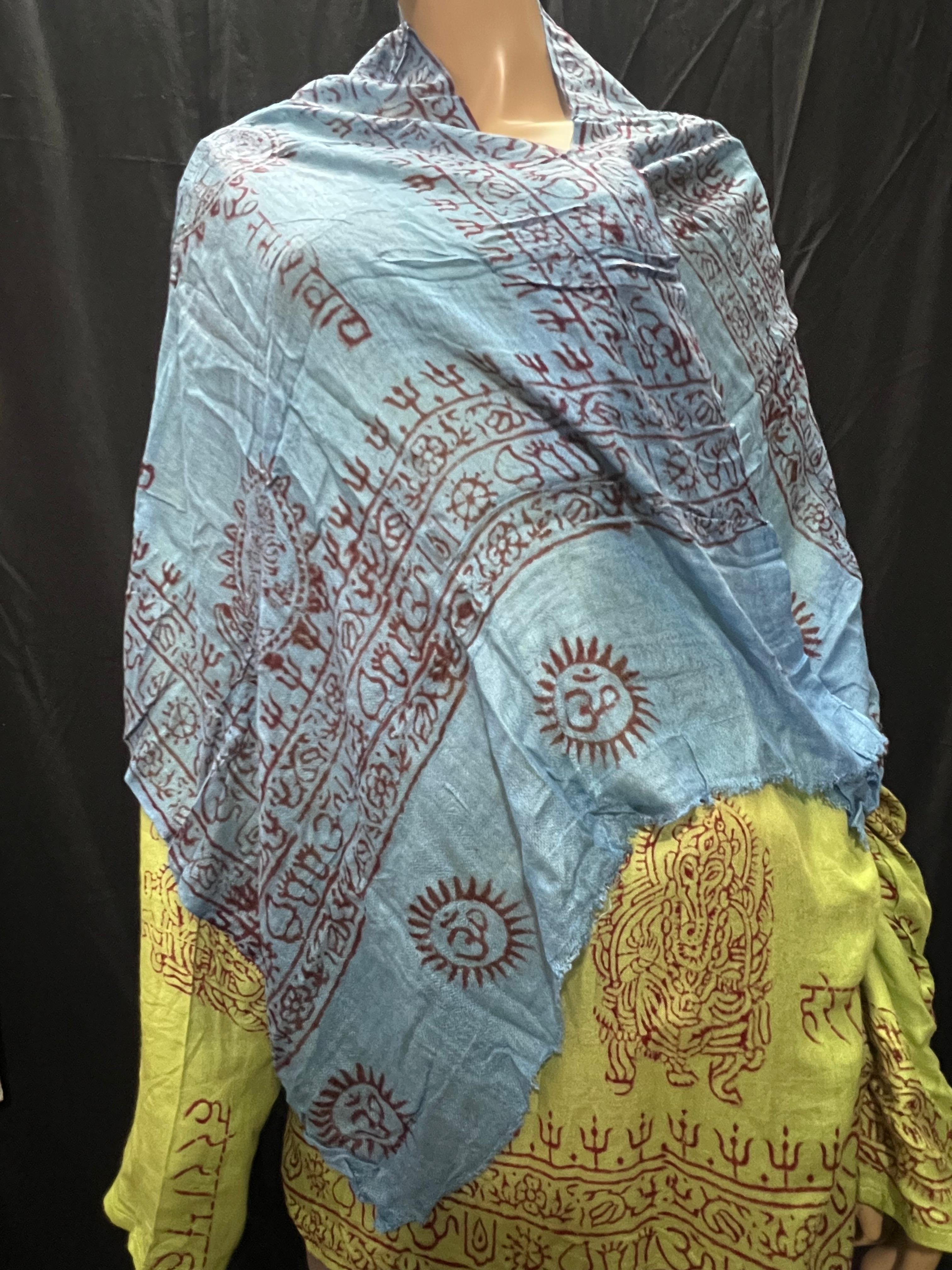This graceful small cotton "Om Namaha Shivaya" Lord Natraj and other sacred symbols printed is soft to touch, luxurious to wear and can be used as a scarf, a wrap, throw or as a shawl. It is all handmade by local artisans in Nepal. It is very soft, gentle yet light which can be used as wrap. Gentle hand wash or steam clean.