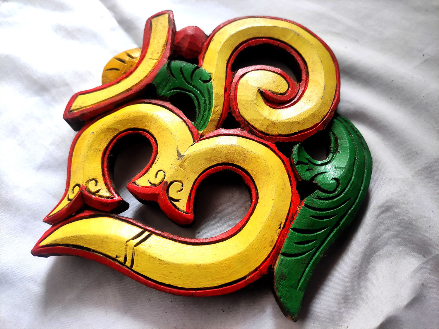 Carefully carved and painted in vibrant red, green, and yellow, this wooden art piece adds both cultural depth and aesthetic beauty to any room, meditation area, yoga studio, or spiritual corner.
