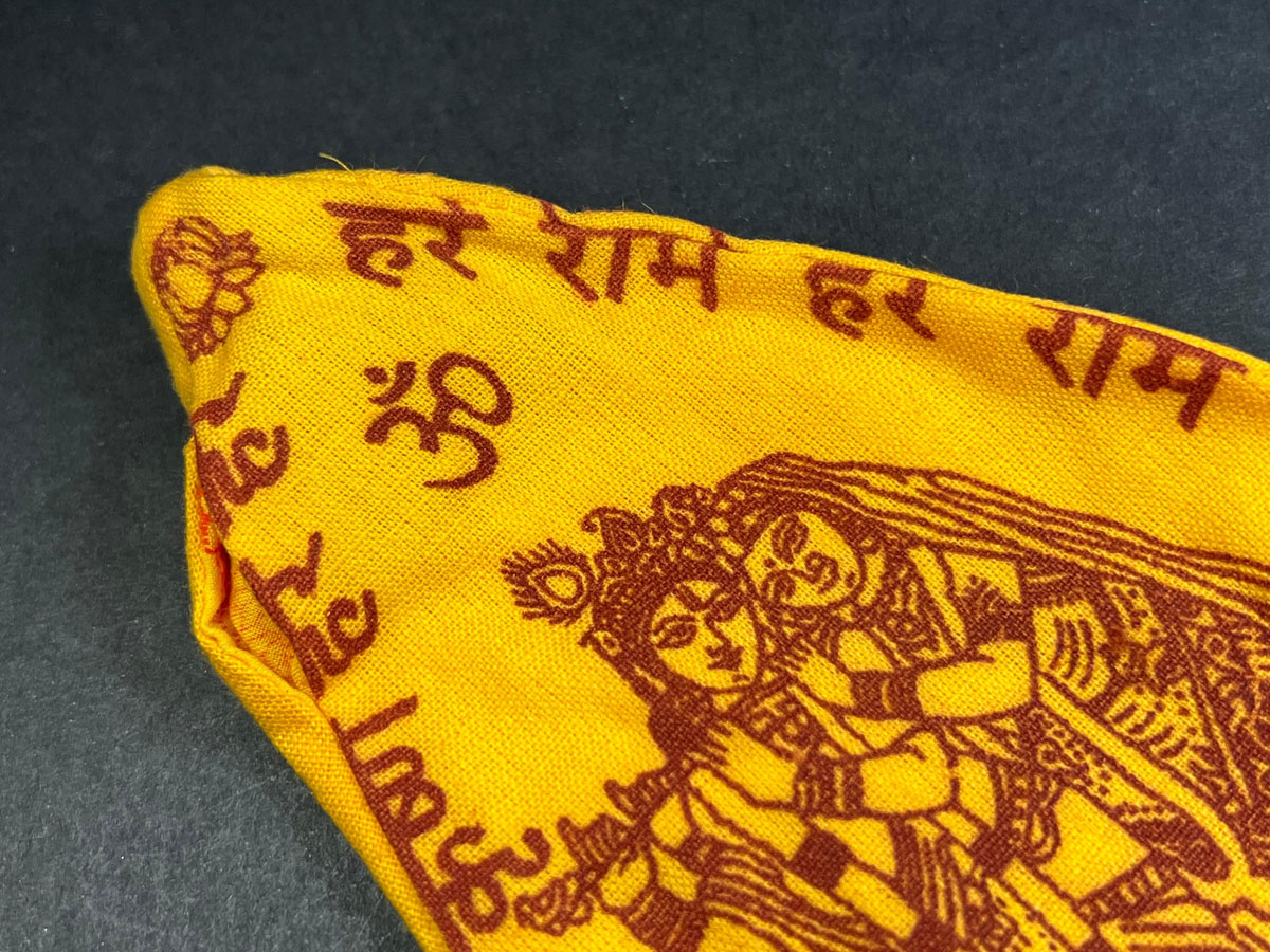 1. Mantra: The bag usually has the mantra "Hare Ram, Hare Krishna" written on it in Sanskrit.