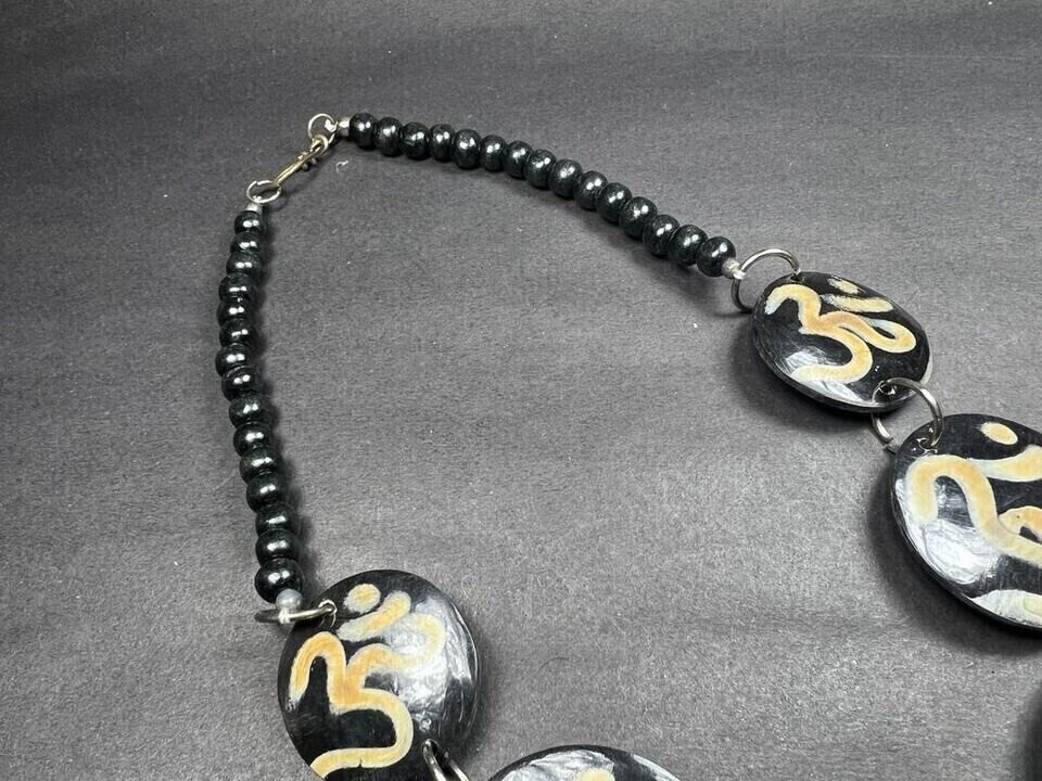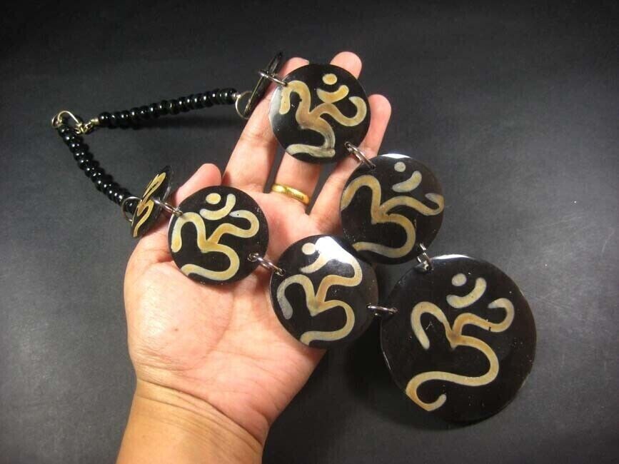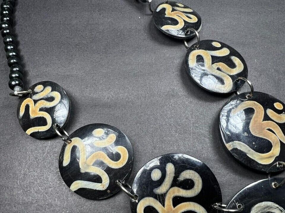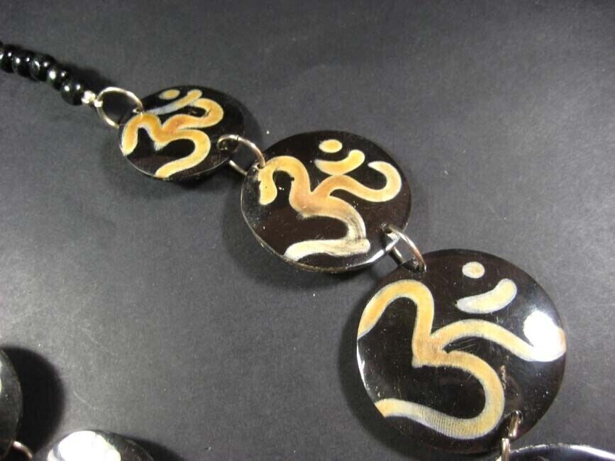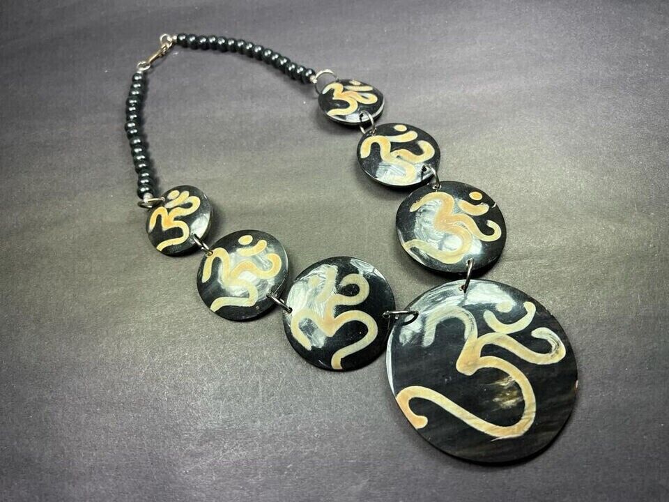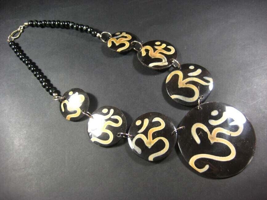 This is a lovely Hindu Om mantra horn beads tribal Naga gypsy Bold Necklace from India. The small black beads are made of wood.