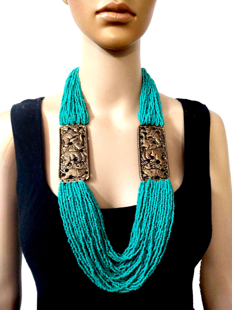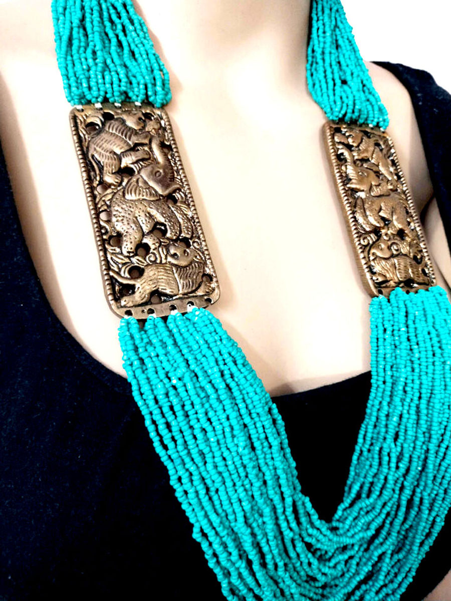 Embrace the vibrant and eclectic spirit of tribal design with this Tibetan Gypsy-inspired necklace. This statement piece features a striking combination of resin and metal beads, arranged in a bold two-strand collar style that elegantly frames the neckline.