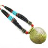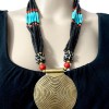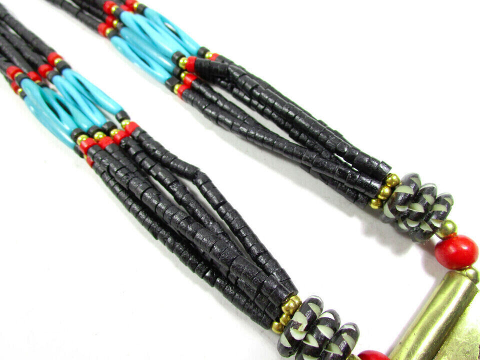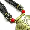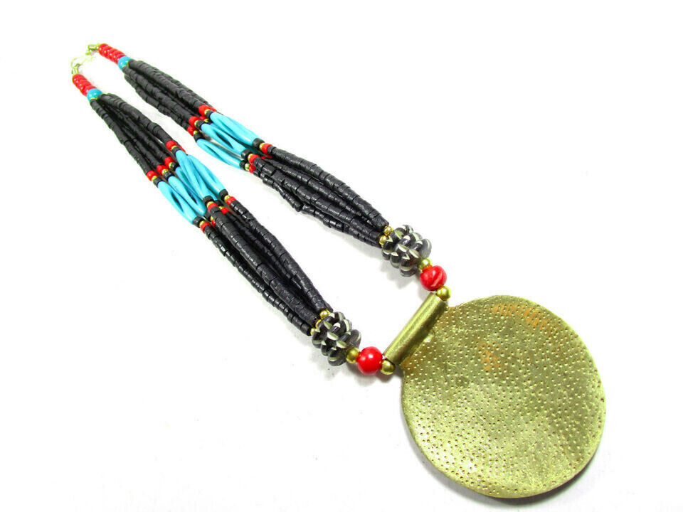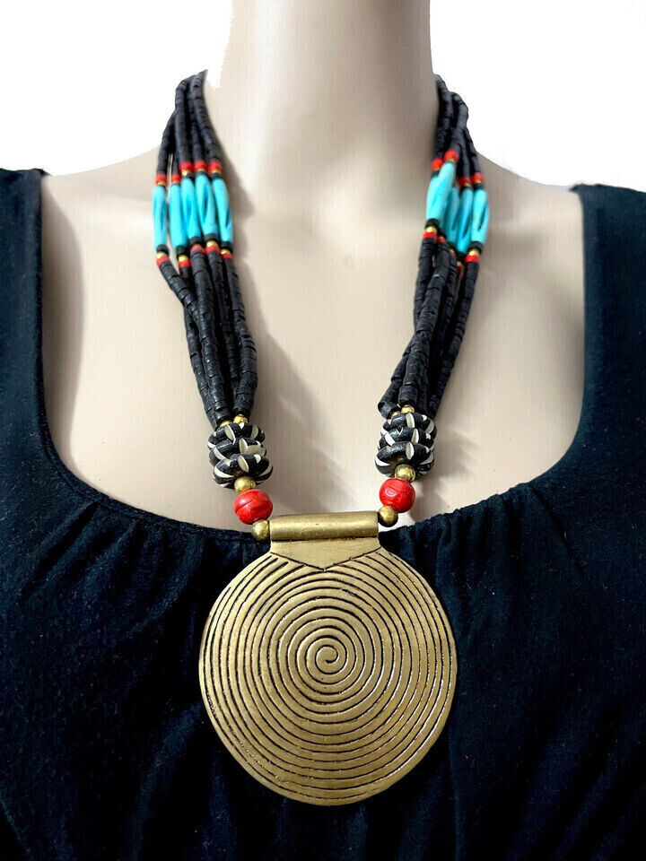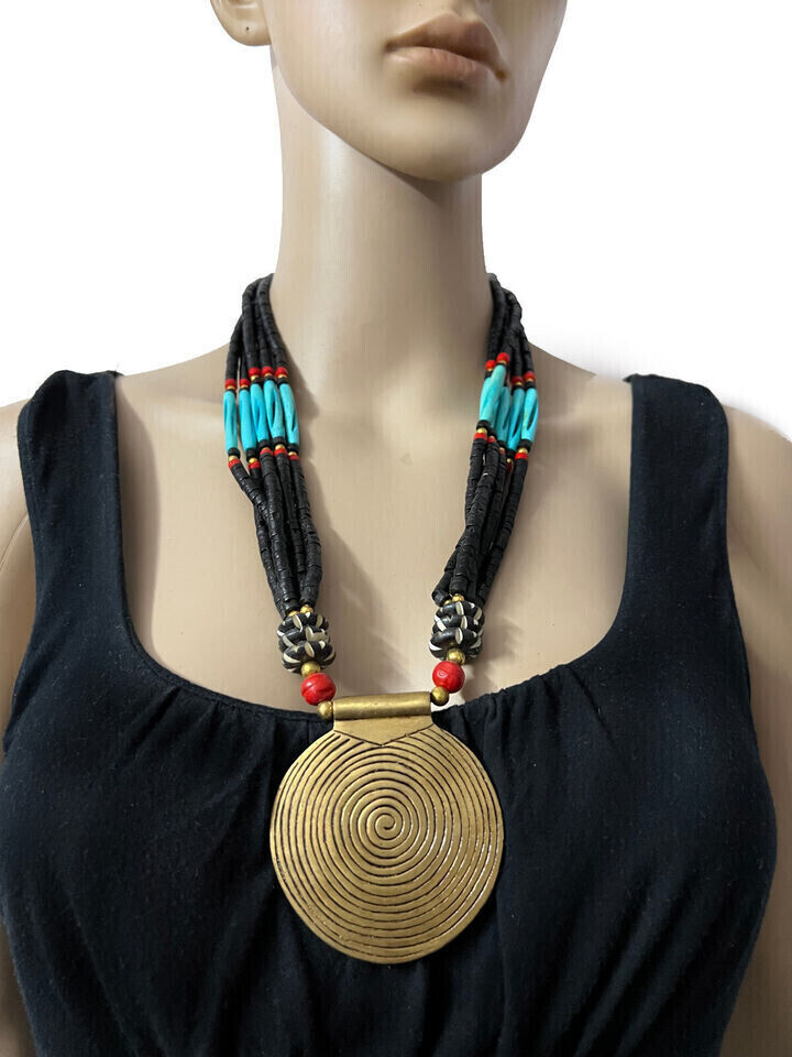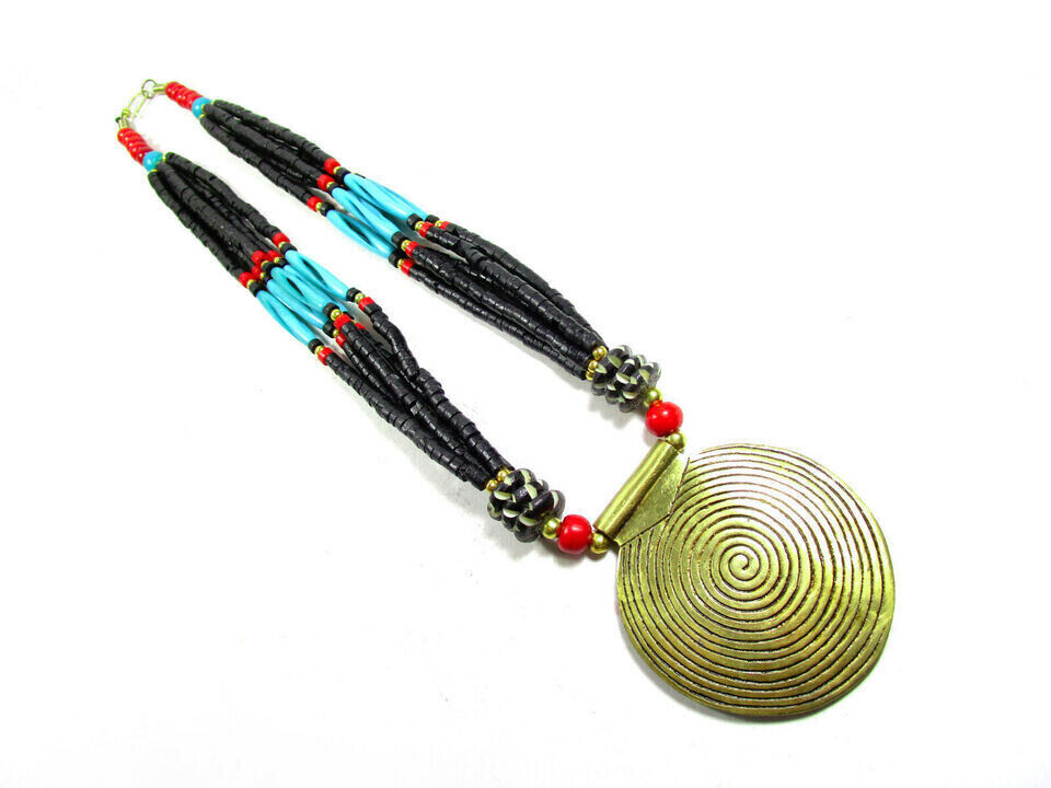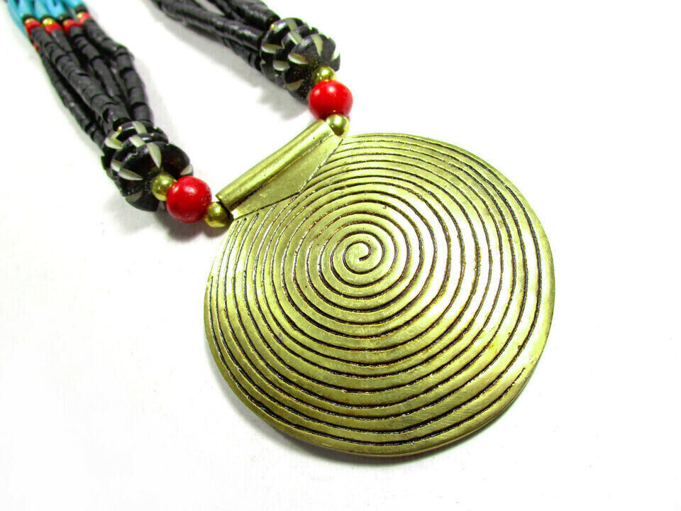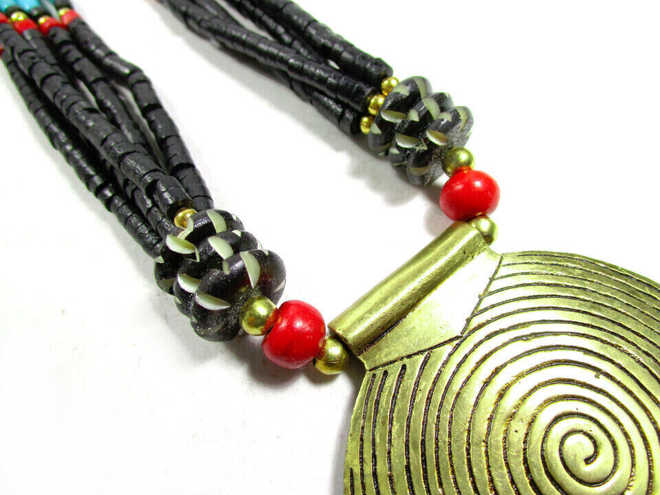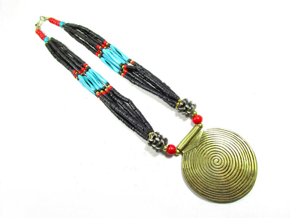 This is a gorgeous Tibetan Bovine bone beads with center spiral solid brass tone pendant. This is an ethnic motifs worn by Naga and Tribal people from other parts of India (Brand new).