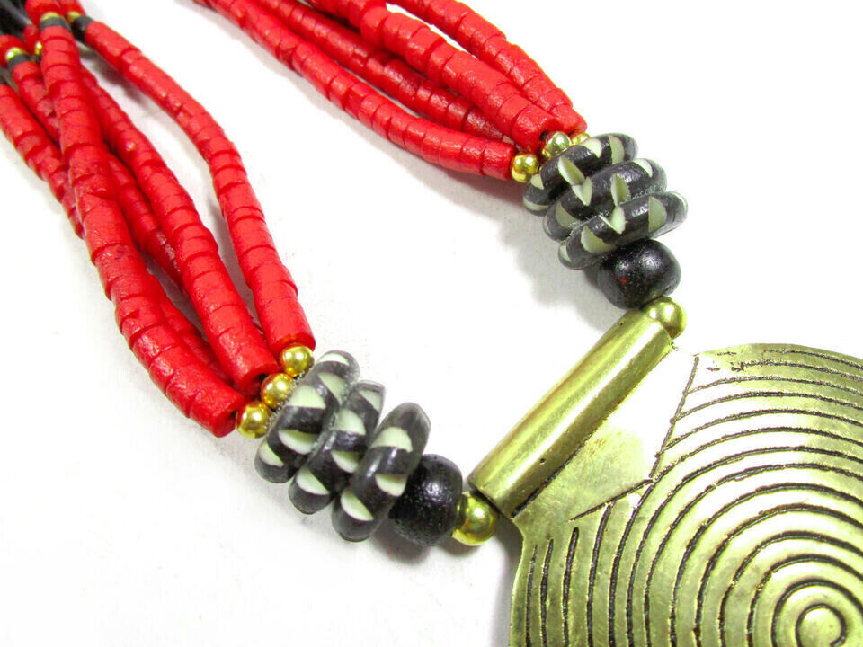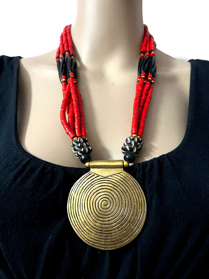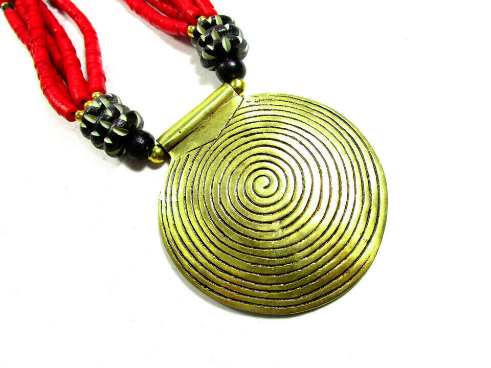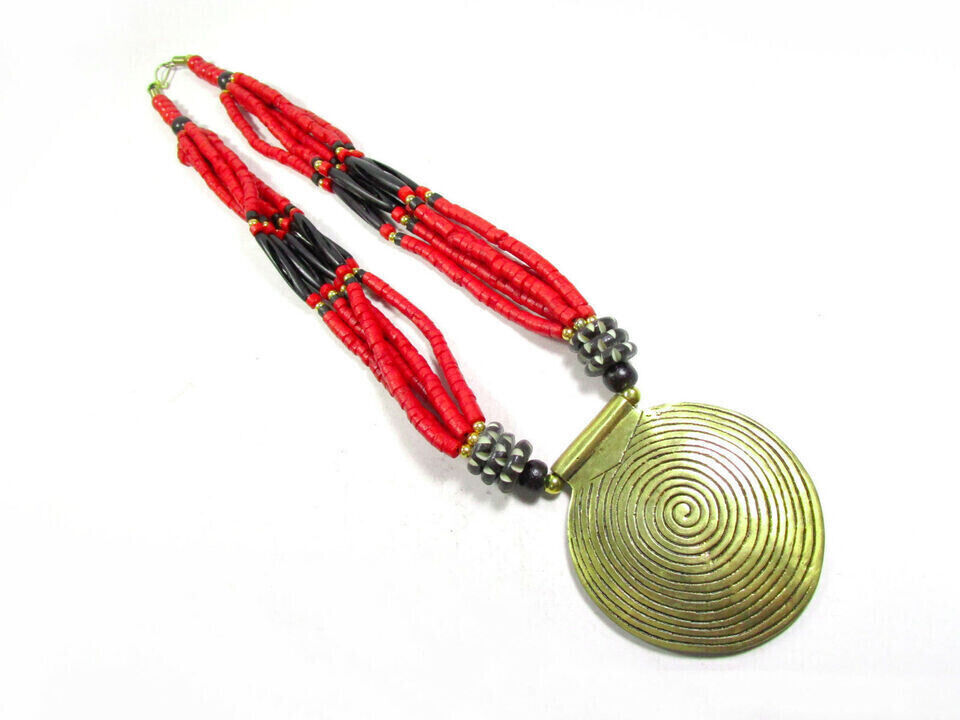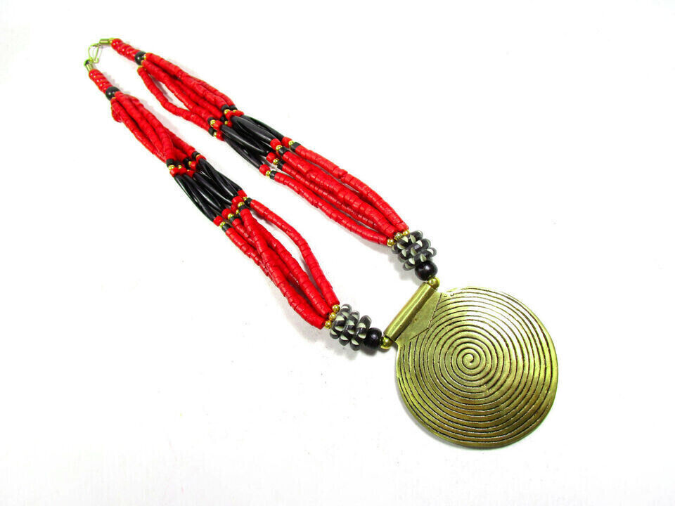 This is a gorgeous Tibetan Bovine bone beads with center spiral solid silver tone pendant. This is an ethnic motifs worn by Naga and Tribal people from other parts of India (Brand new).