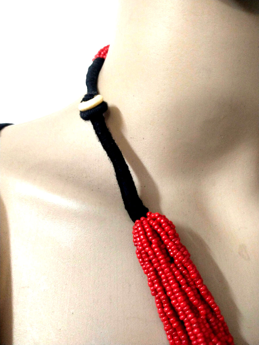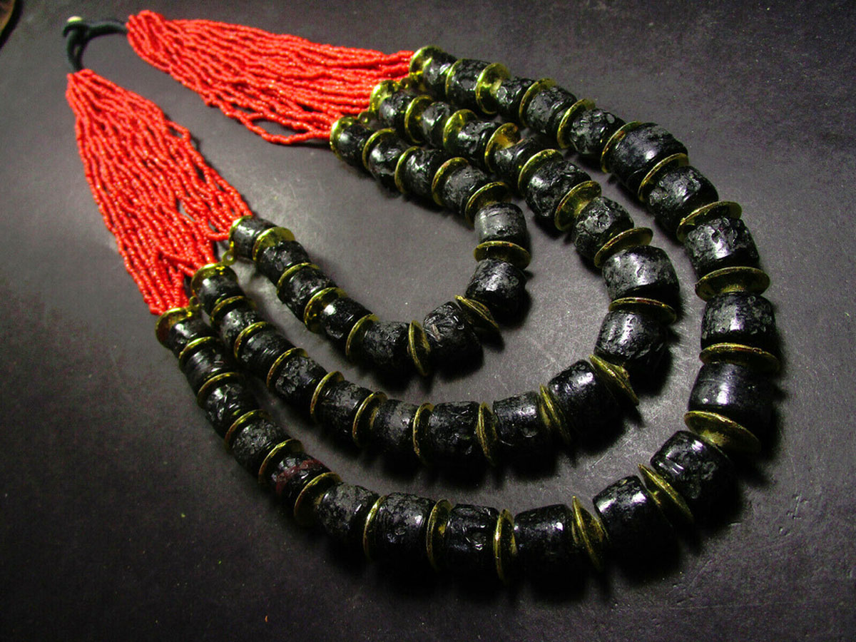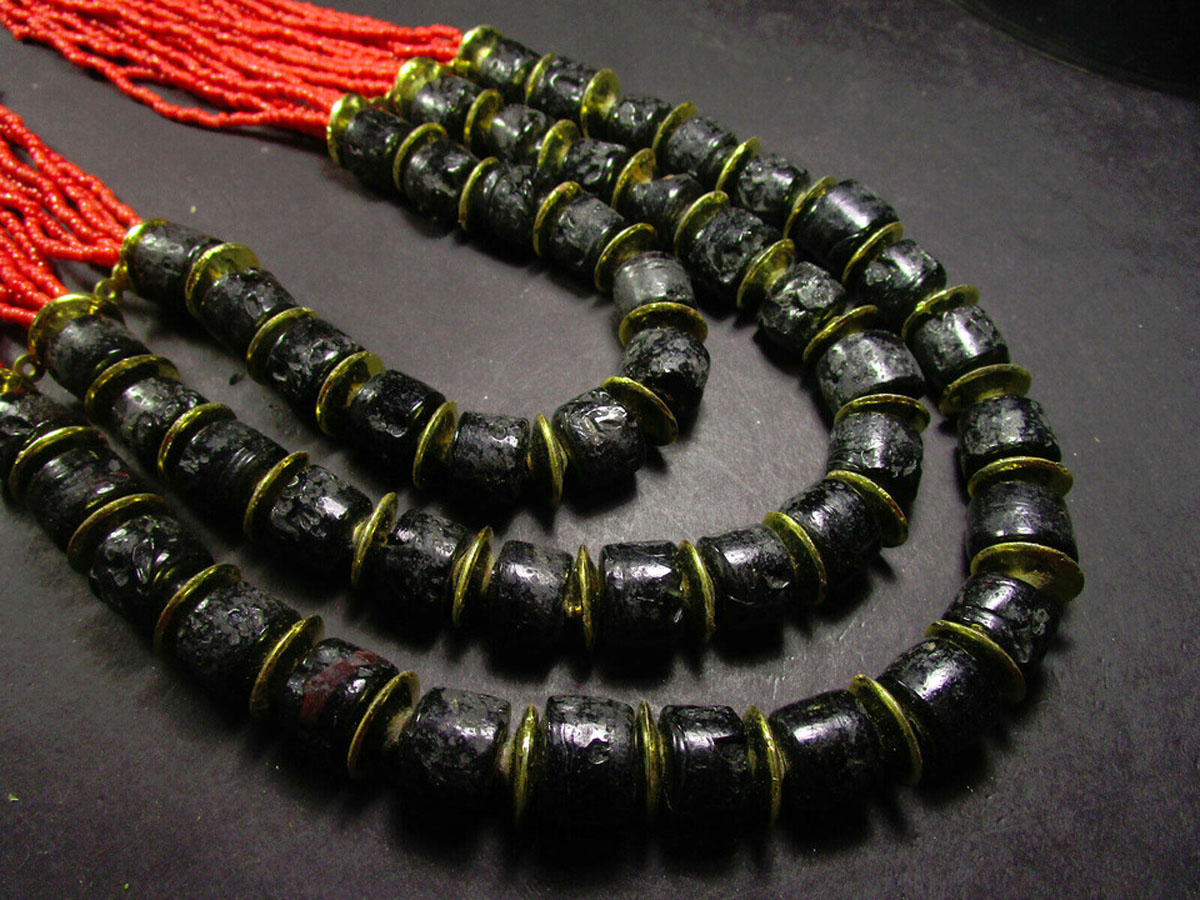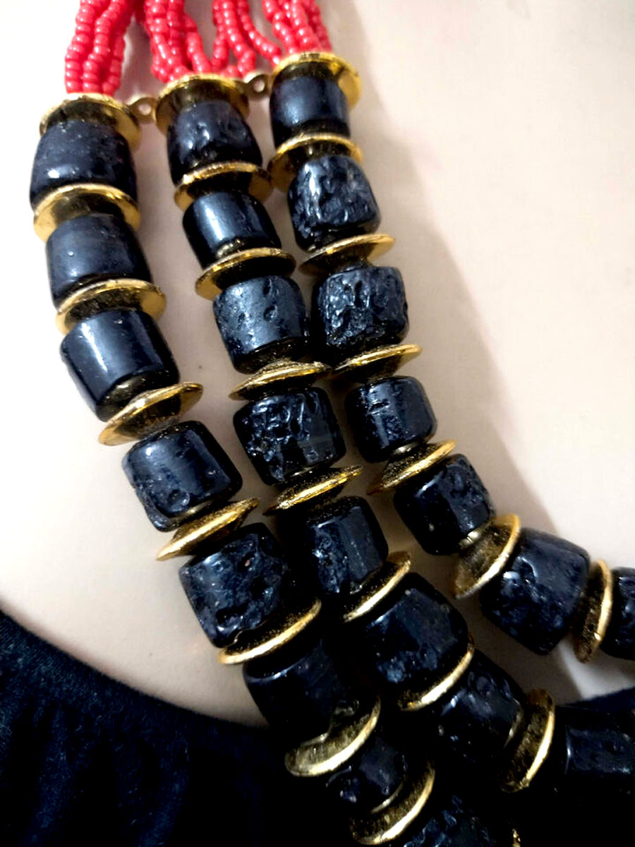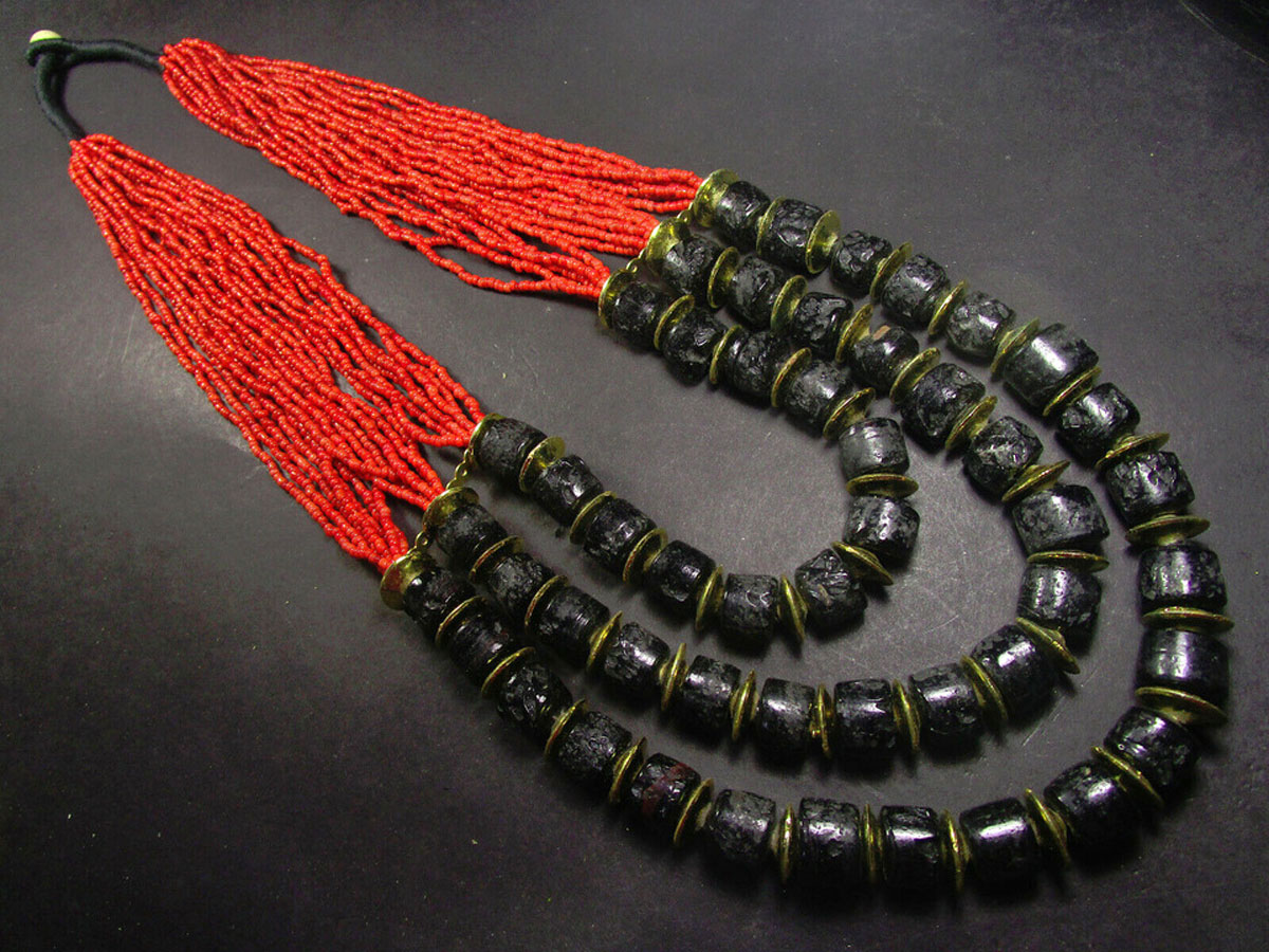 This striking necklace features a multi-strand design with black glass beads and a prominent black glass center drop, embodying the bold and intricate style of Naga tribal craftsmanship.