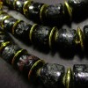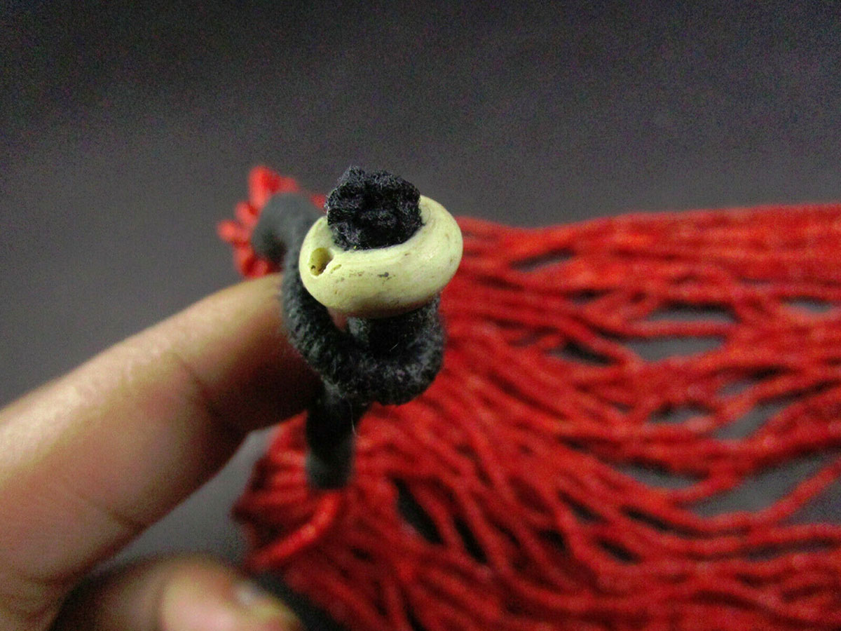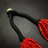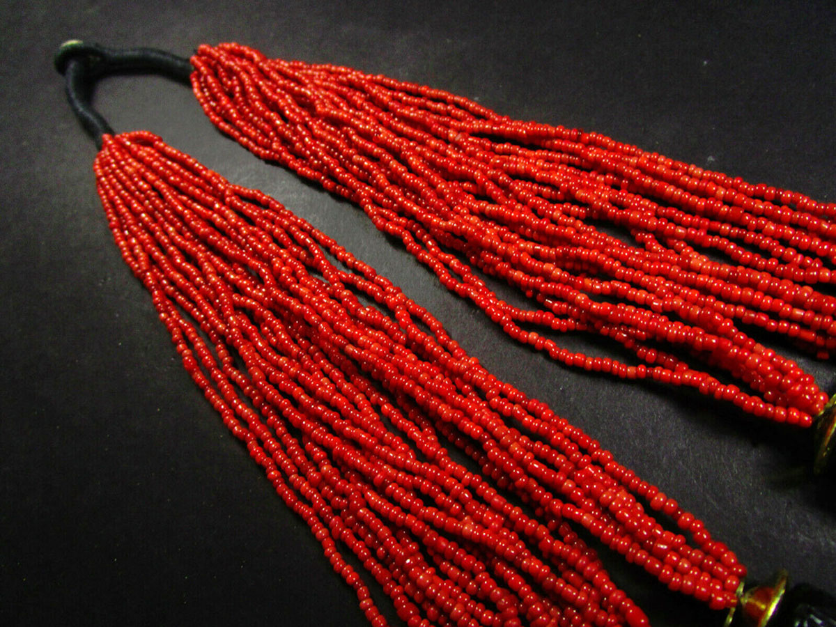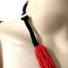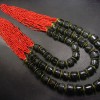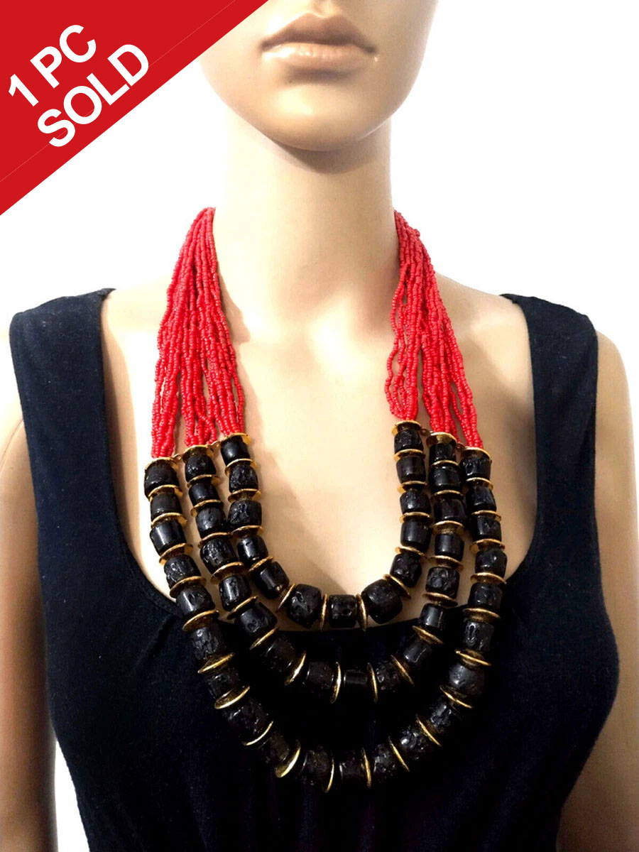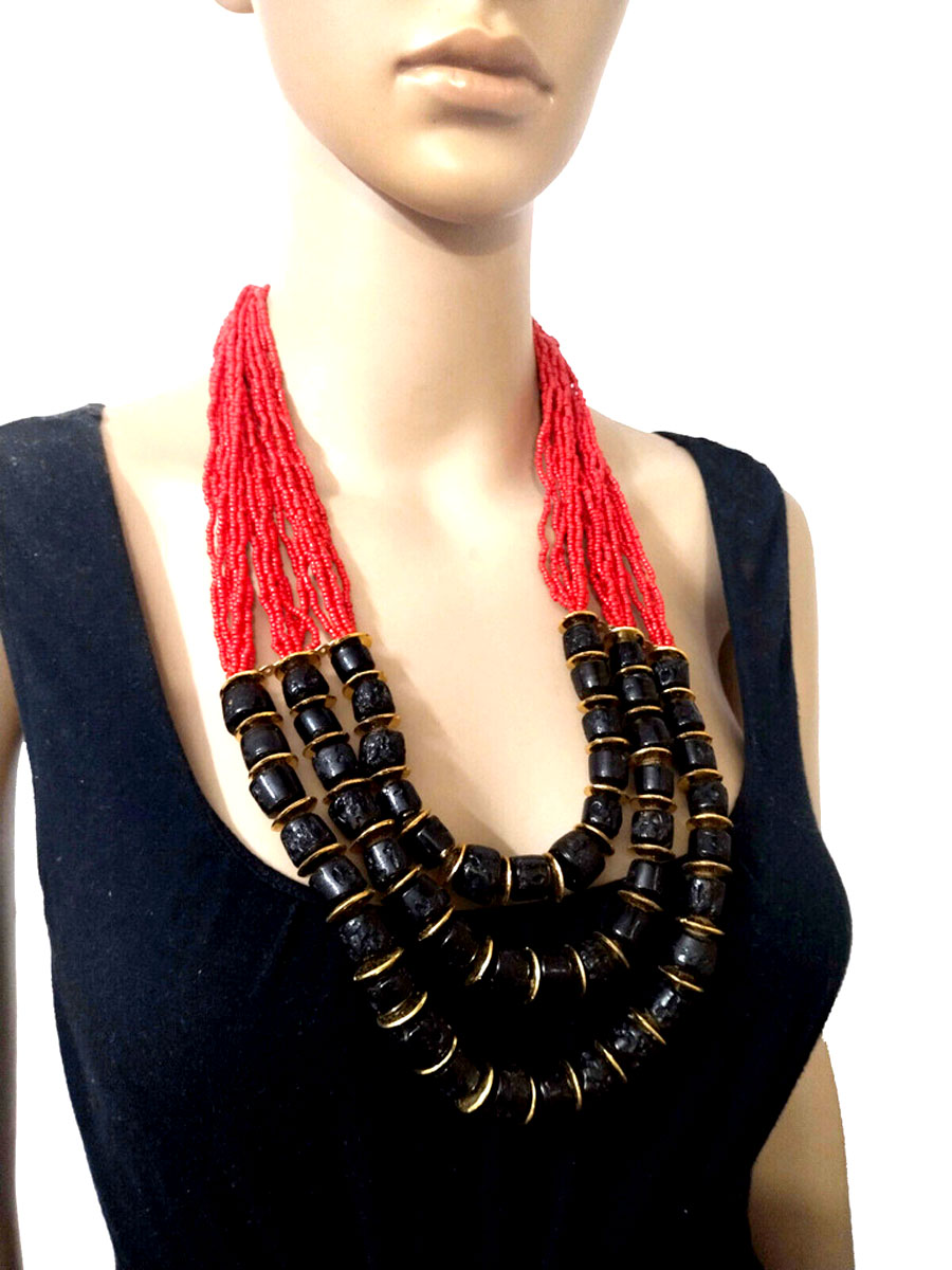 This striking necklace features a multi-strand design with black glass beads and a prominent black glass center drop, embodying the bold and intricate style of Naga tribal craftsmanship.