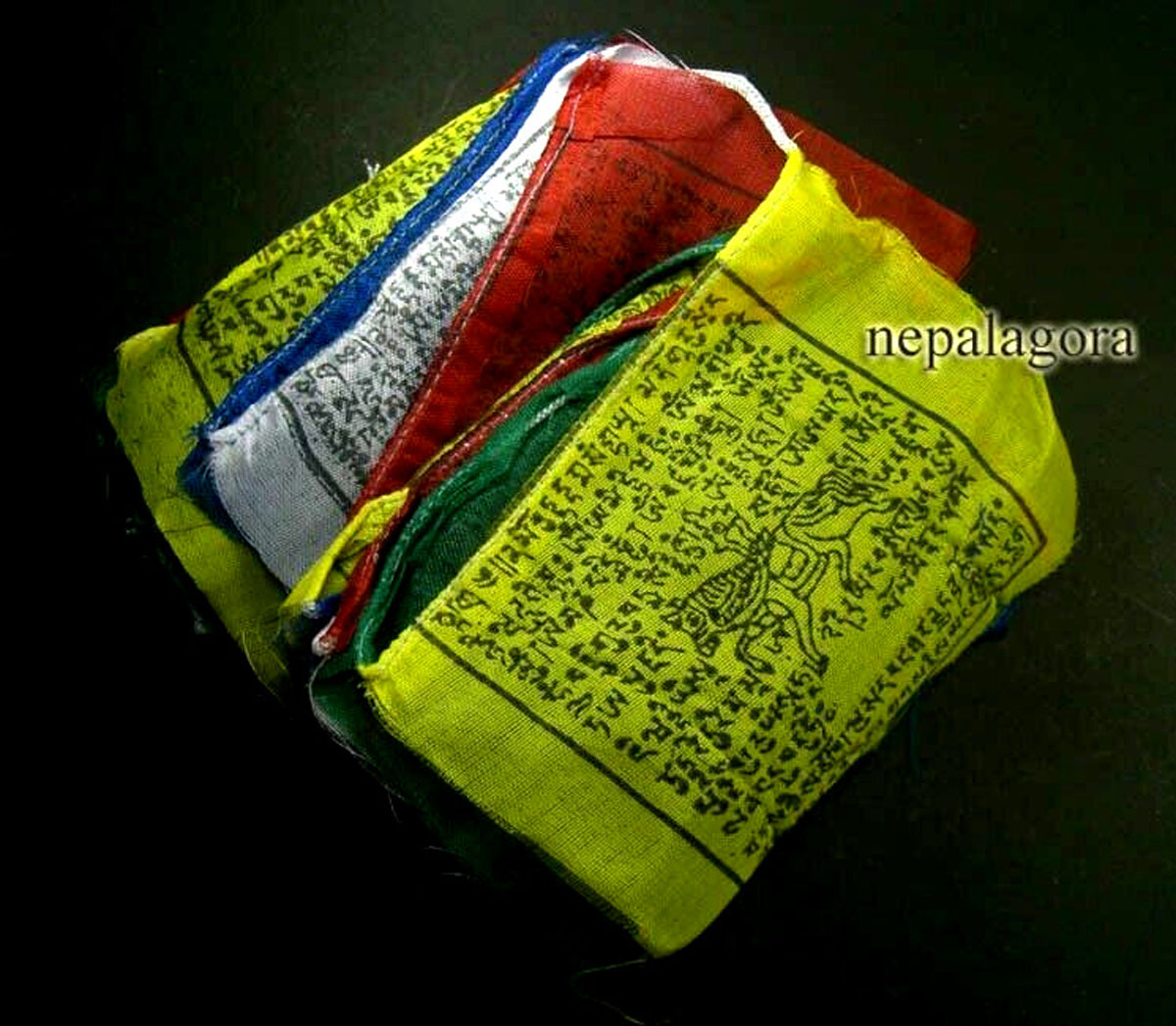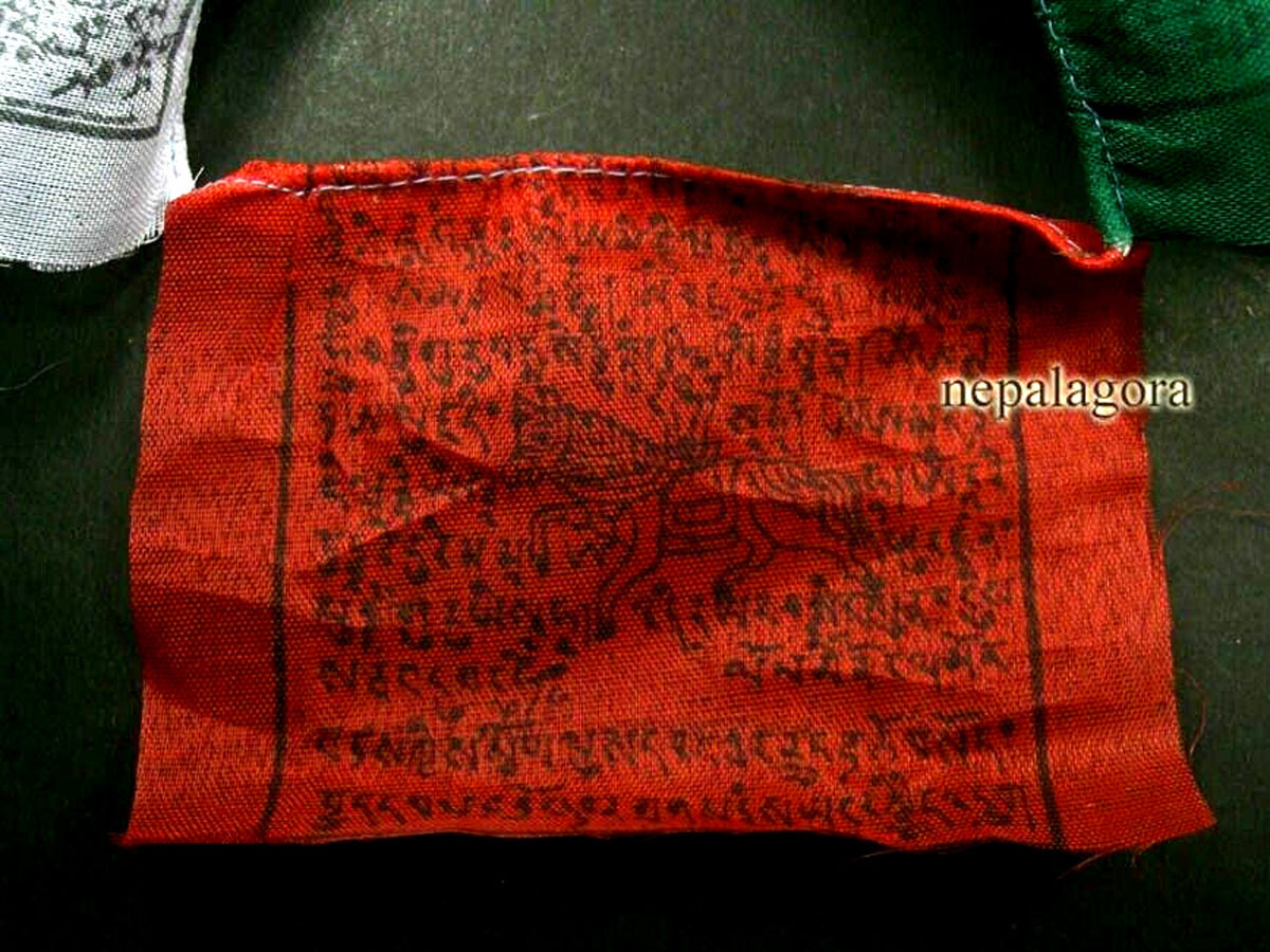 This prayer flag is excellence hand embossed from Nepal. It is a cotton prayer flags with block printed Tibetan Om Ma Ni Padme Hum Mantra. This is a string of 10 flags of 5 rolls with two each of the five Tibetan fundamental colors.
