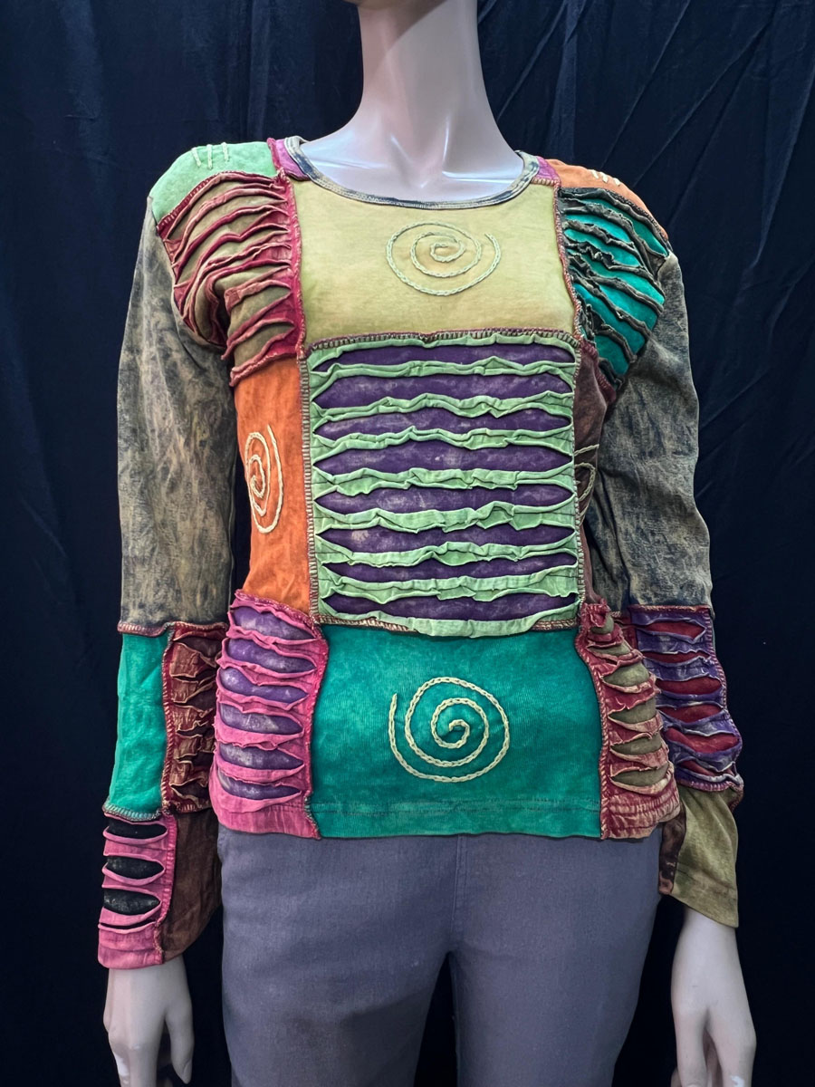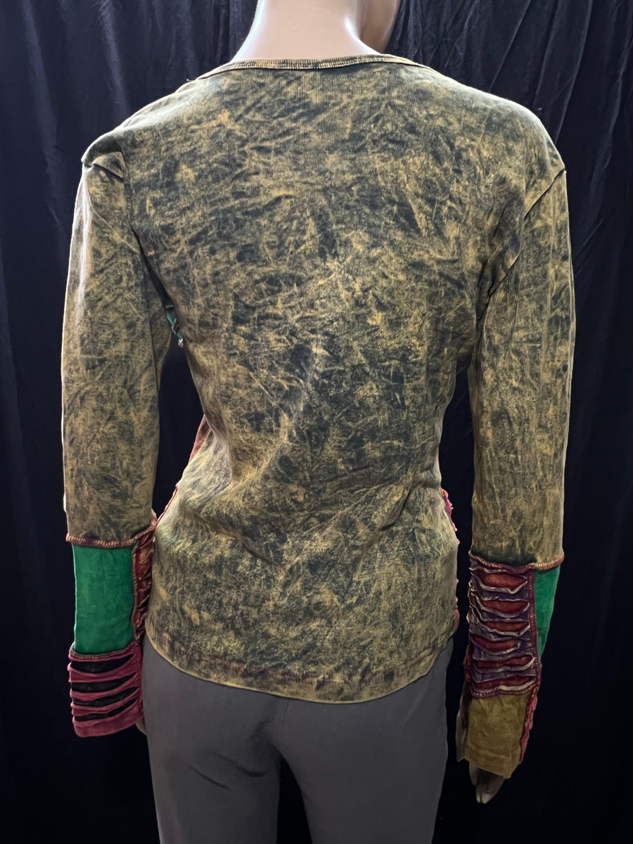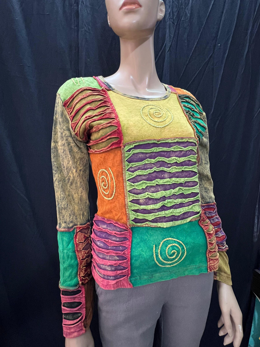 Overall, this handmade razor cut long sleeve T-shirt is a one-of-a-kind piece that combines the vibrant colors of Hippie culture. It's perfect for anyone who appreciates unique, handmade items that tell a story about their cultural heritage.