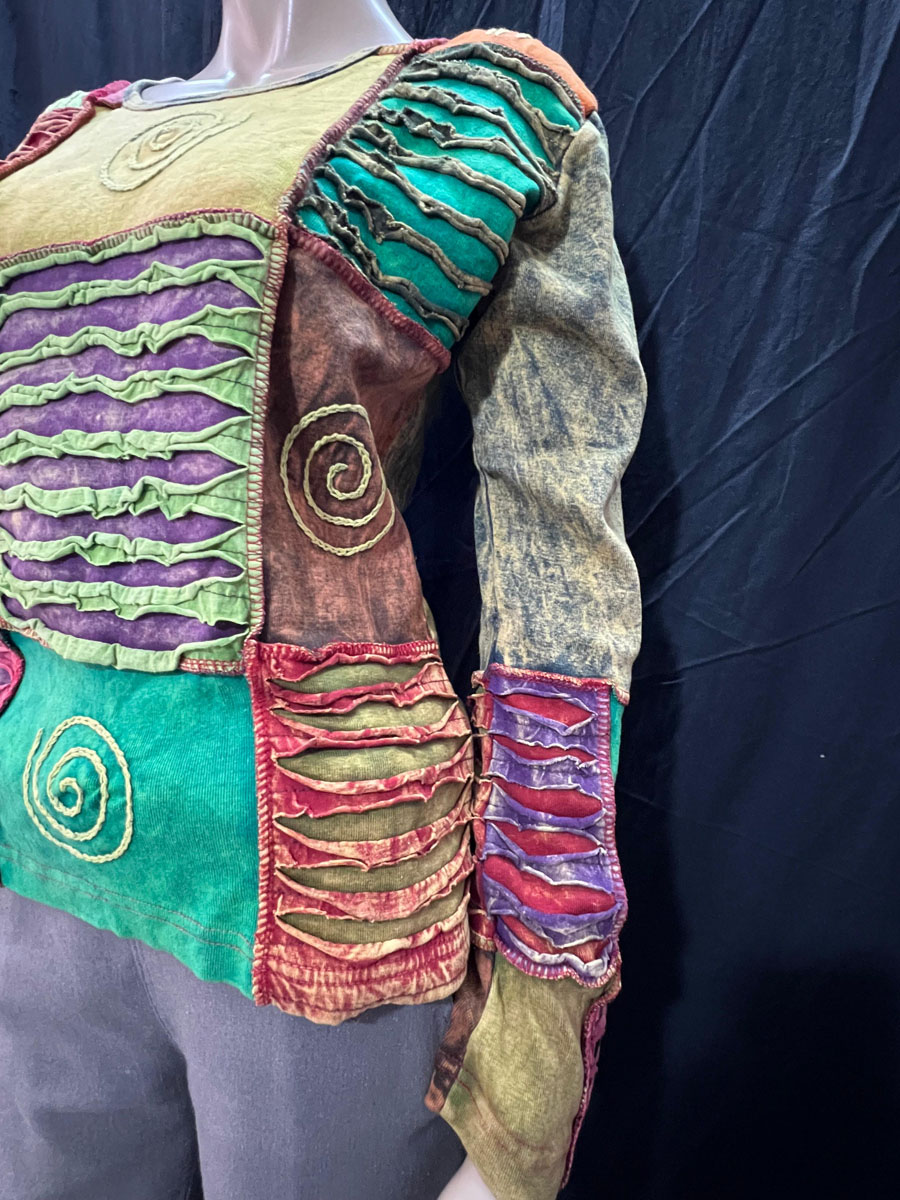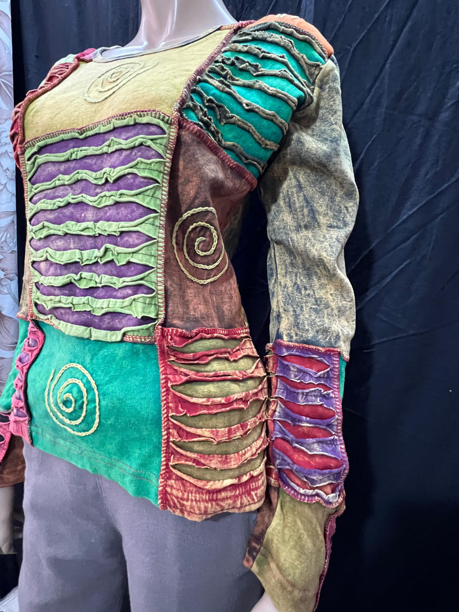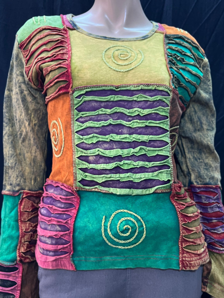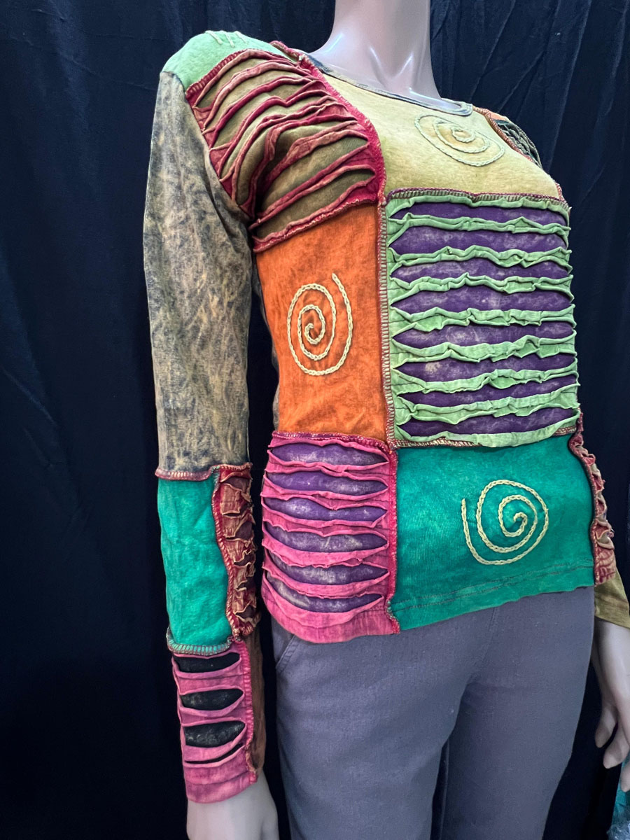Overall, this handmade razor cut long sleeve T-shirt is a one-of-a-kind piece that combines the vibrant colors of Hippie culture. It's perfect for anyone who appreciates unique, handmade items that tell a story about their cultural heritage.
