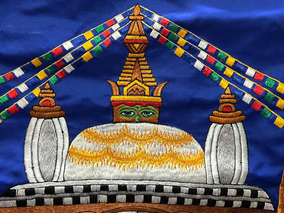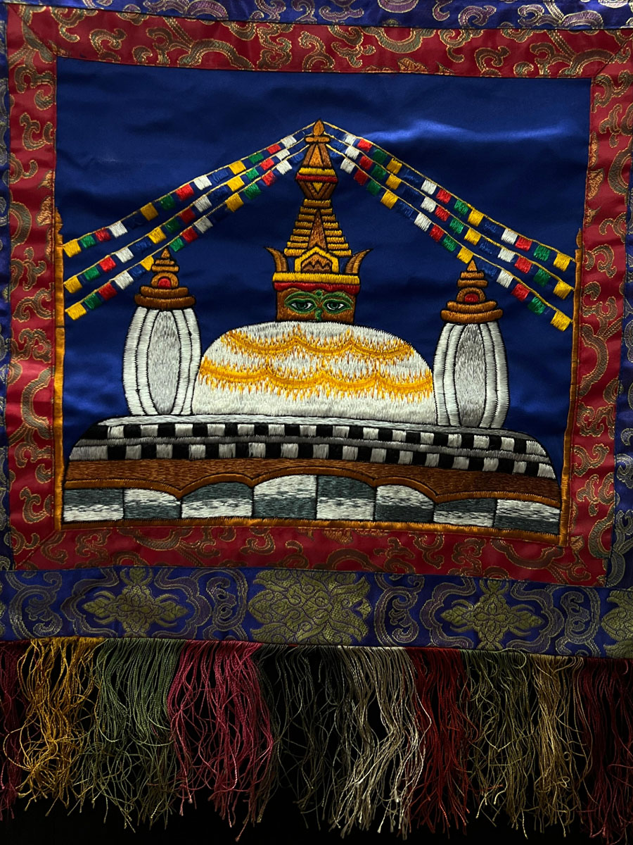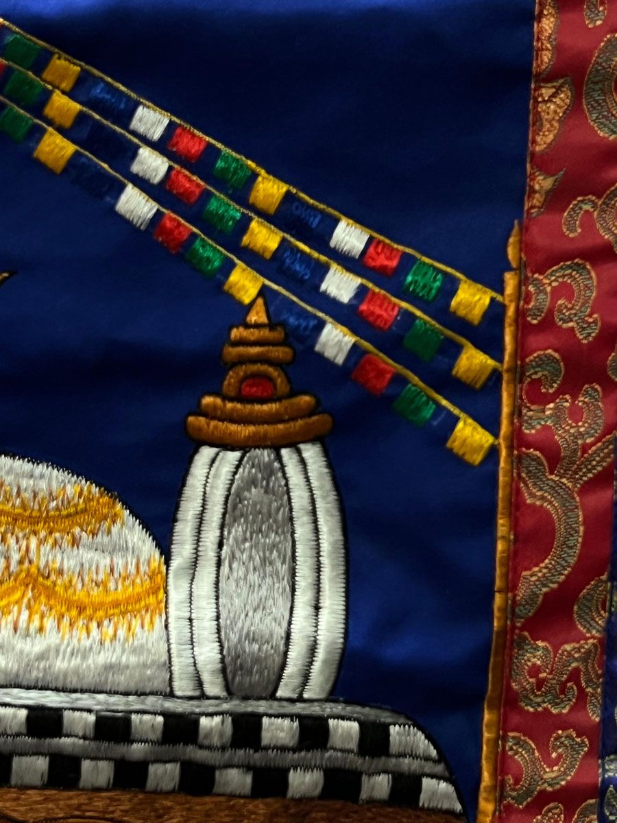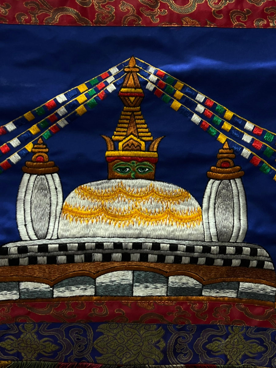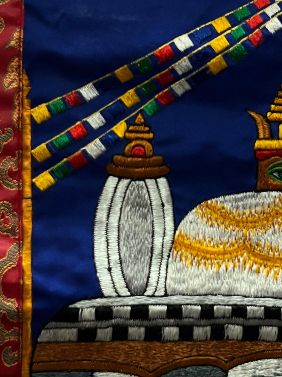 This is a beautiful silk brocade wall hanging from Nepal. Swoyambhu Nath temple. Image is finely embroidered and there is high quality brocade border. It is decorated with beautiful hand woven silk embroidery. These thangka are handmade by the highly skilled and experienced local artisans in Nepal.