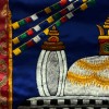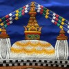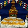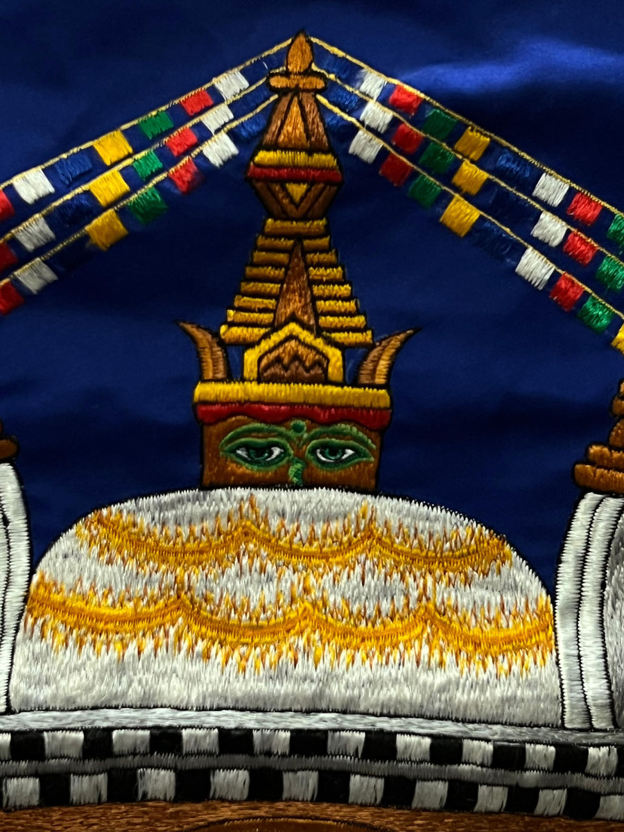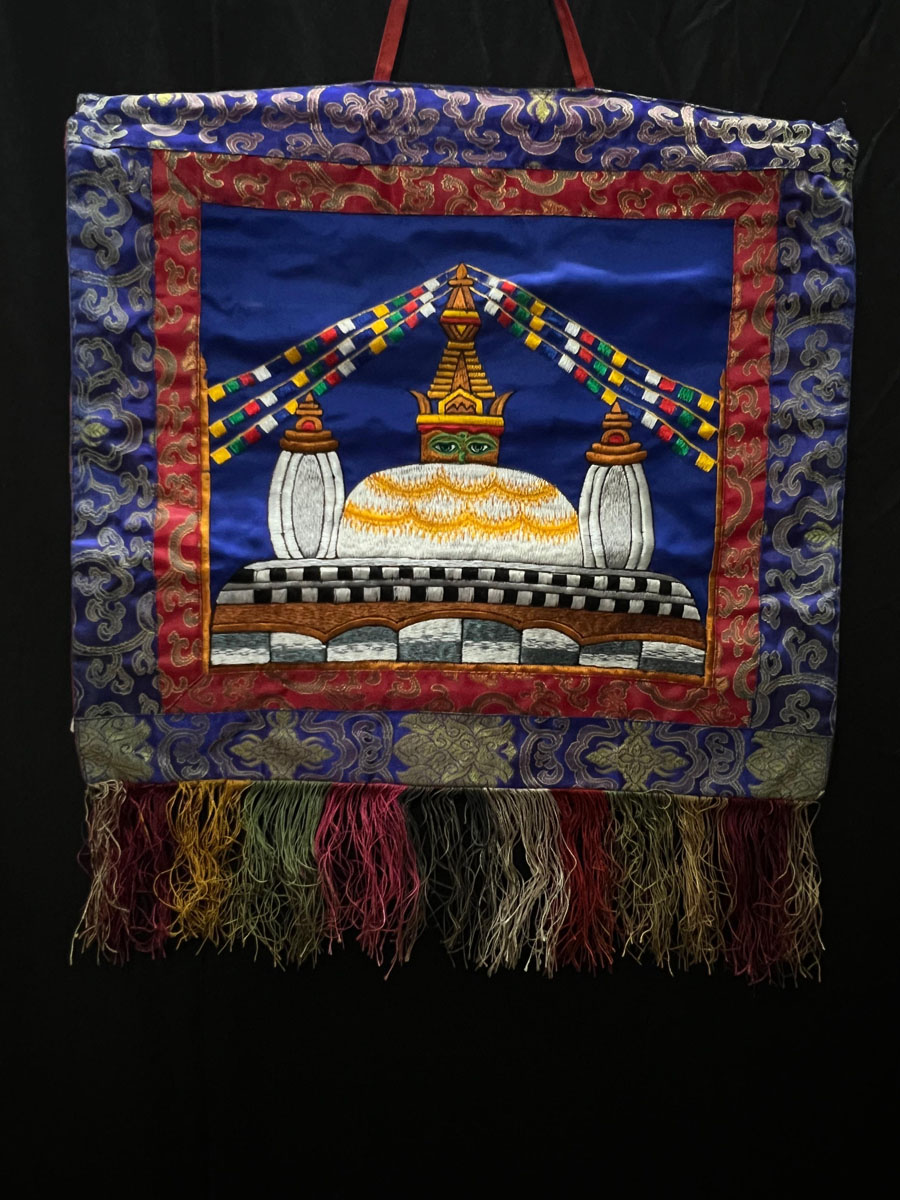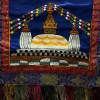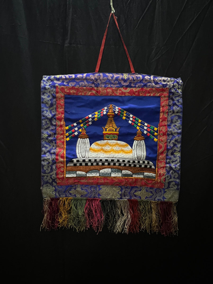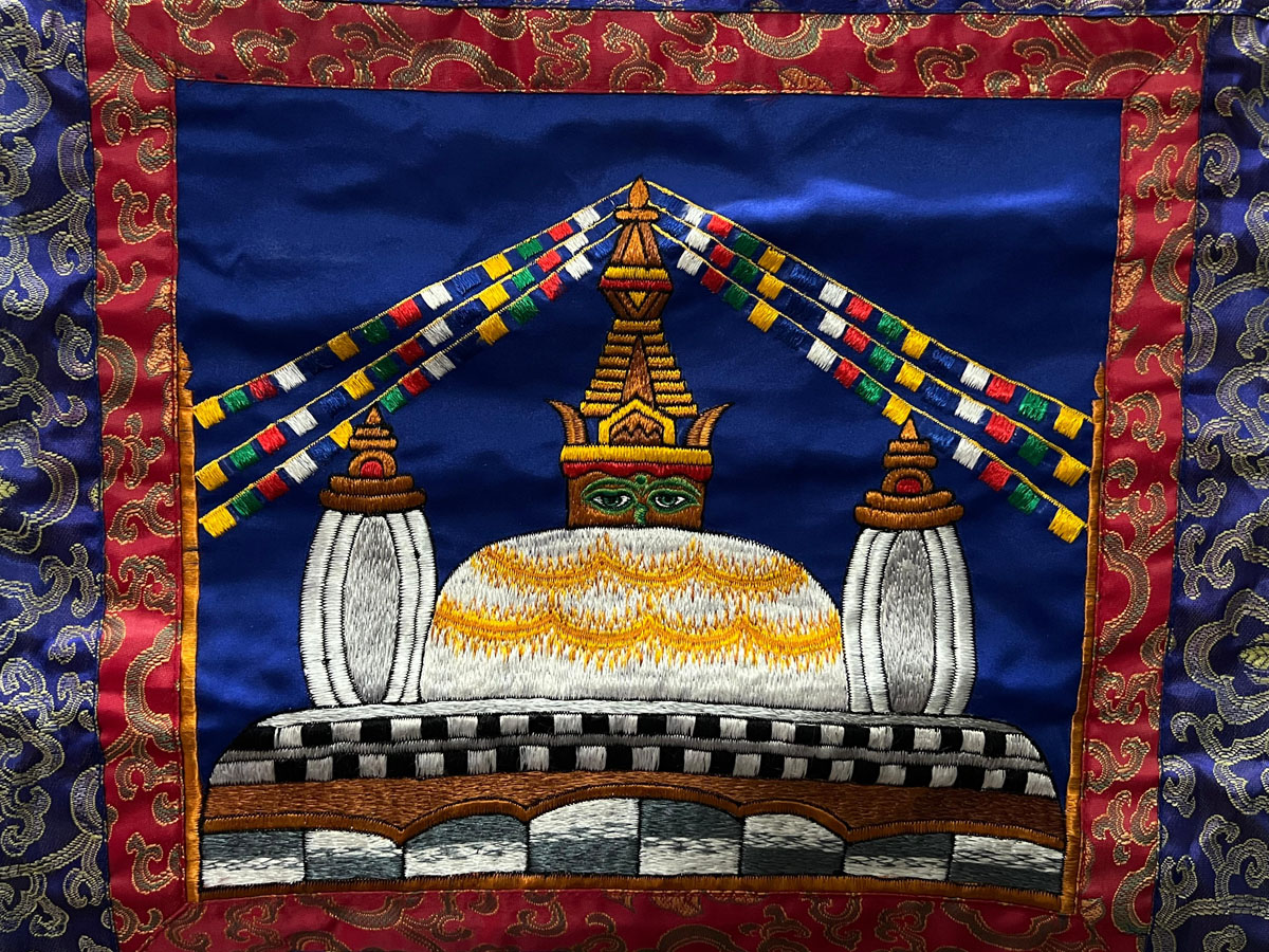 This is a beautiful silk brocade wall hanging from Nepal. Swoyambhu Nath temple. Image is finely embroidered and there is high quality brocade border. It is decorated with beautiful hand woven silk embroidery. These thangka are handmade by the highly skilled and experienced local artisans in Nepal.