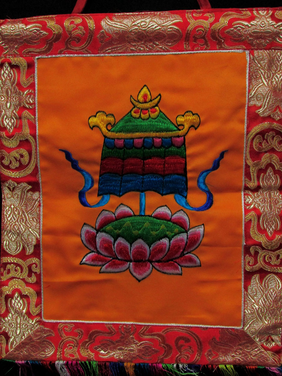 This is a beautiful silk brocade wall hanging from Nepal. This is one of the 8th auspicious sign or Sutra of Buddhism called The Victory Banner. It is decorated with beautiful hand woven silk embroidery. These thangka are handmade by the highly skilled and experienced local artisans in Nepal.