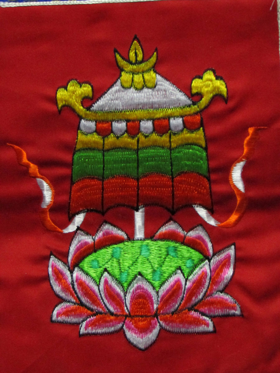 This is a beautiful silk brocade wall hanging from Nepal. This is one of the 8th auspicious sign or Sutra of Buddhism called The Victory Banner. It is decorated with beautiful hand woven silk embroidery. These thangka are handmade by the highly skilled and experienced local artisans in Nepal.
