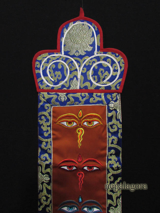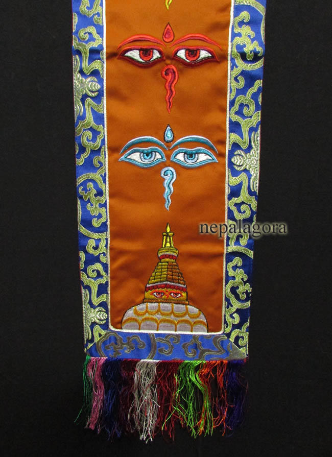 This is a beautiful silk brocade wall hanging from Nepal. At the center Buddha Eye and Bouddhanath temple is decorated with beautiful hand woven silk embroidery, there is a high quality brocade border. They are handmade by the highly skilled and experienced local artisans in Nepal.