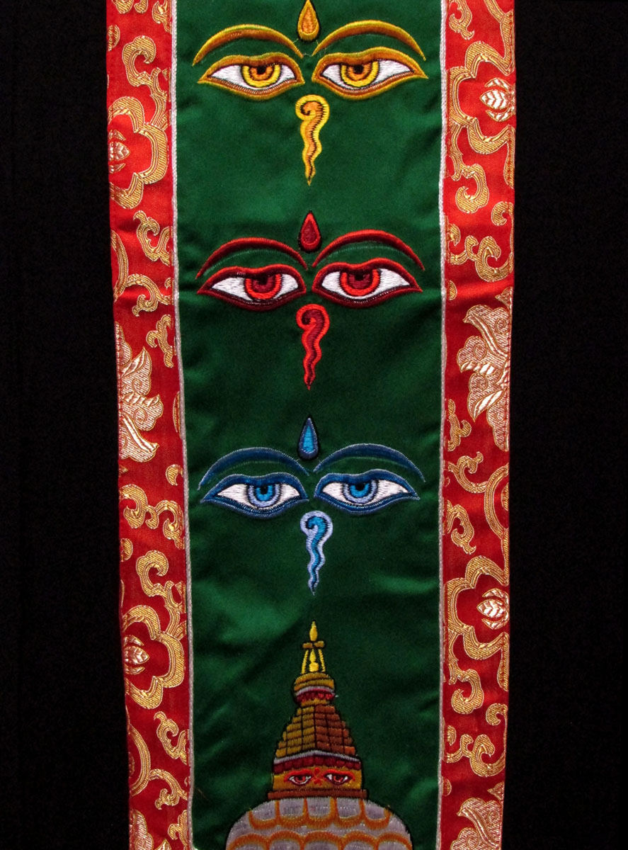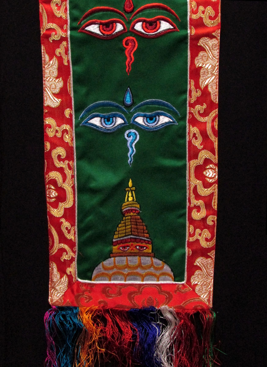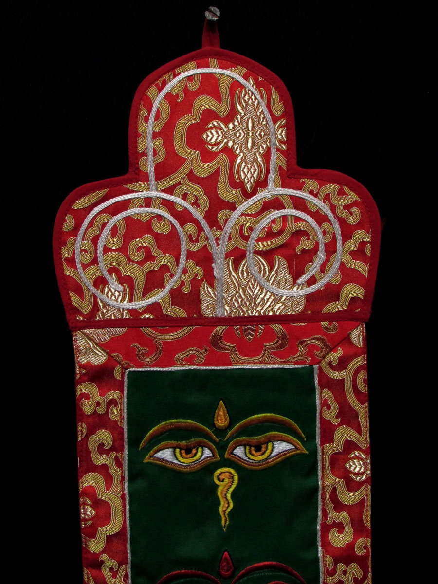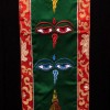 This is a beautiful silk brocade wall hanging from Nepal. At the center Buddha Eye and Bouddhanath temple is decorated with beautiful hand woven silk embroidery, there is a high quality brocade border. They are handmade by the highly skilled and experienced local artisans in Nepal.