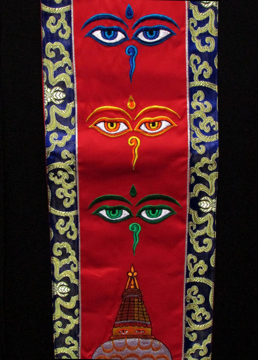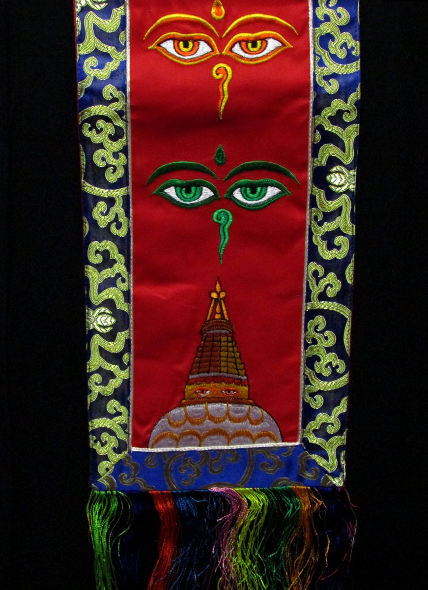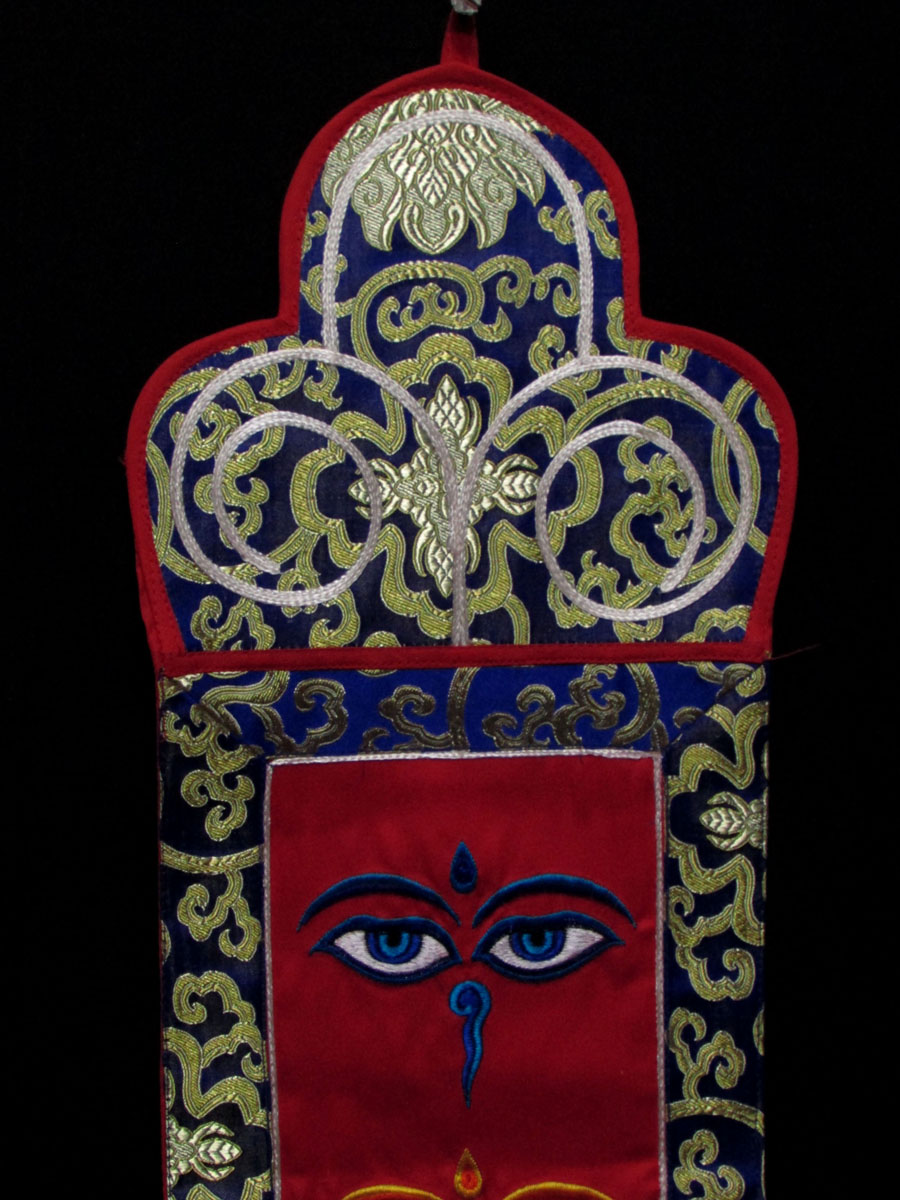 This is a beautiful silk brocade wall hanging from Nepal. At the center Buddha Eye and Bouddhanath temple is decorated with beautiful hand woven silk embroidery, there is a high quality brocade border. They are handmade by the highly skilled and experienced local artisans in Nepal.