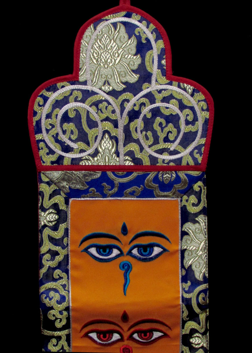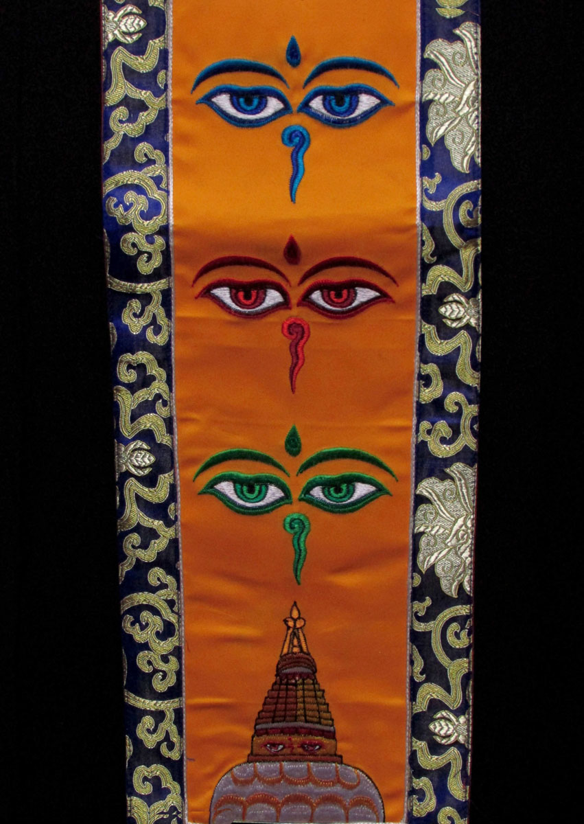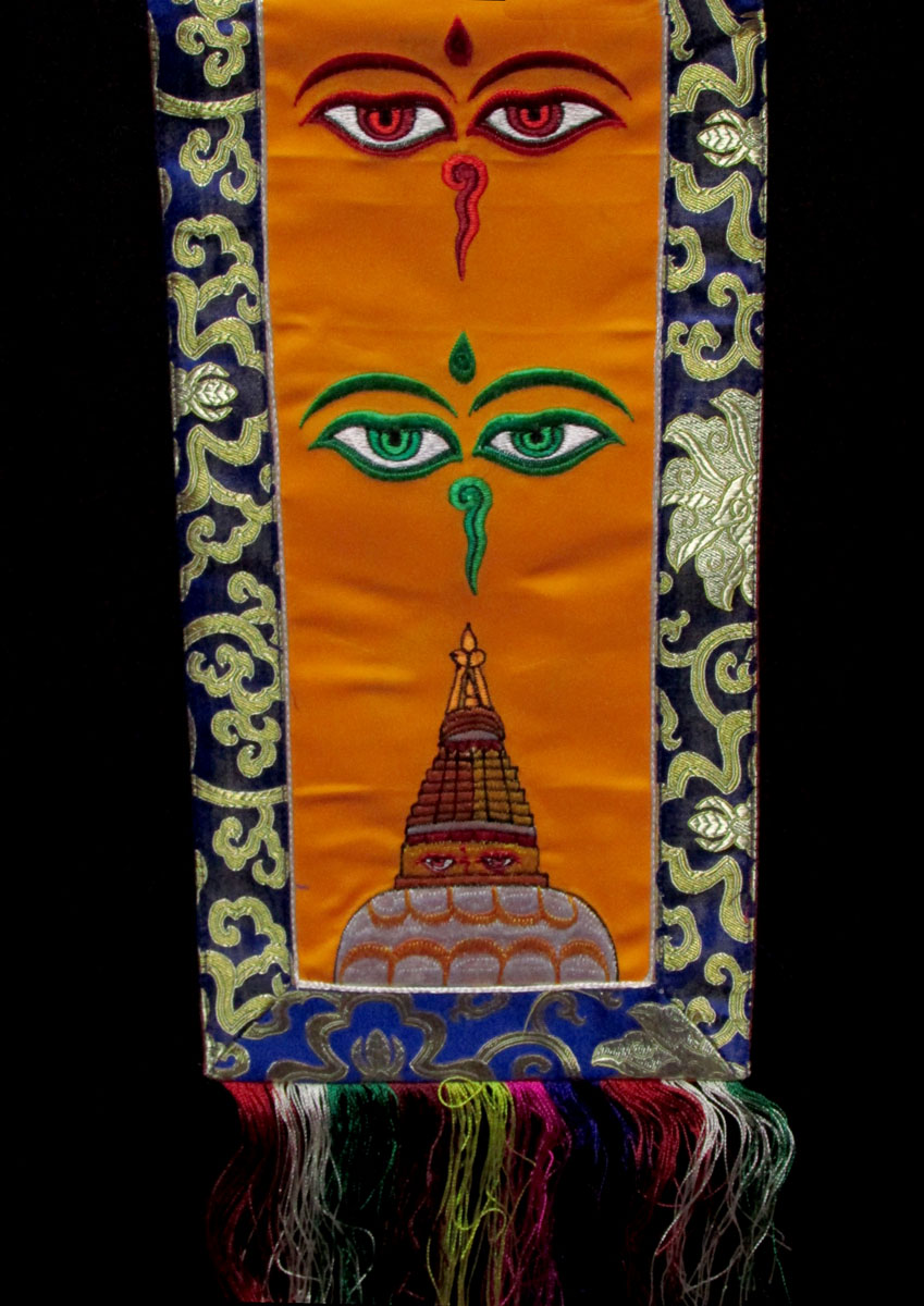 This is a beautiful silk brocade wall hanging from Nepal. At the center Buddha Eye and Bouddhanath temple is decorated with beautiful hand woven silk embroidery, there is a high quality brocade border. They are handmade by the highly skilled and experienced local artisans in Nepal.