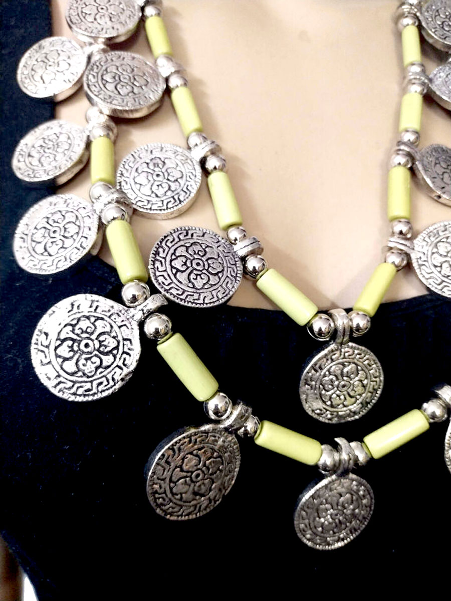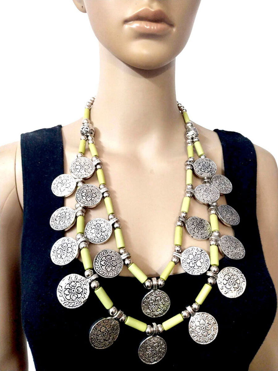 Embrace the vibrant and eclectic spirit of tribal design with this Tibetan Gypsy-inspired necklace. This statement piece features a striking combination of resin and metal beads, arranged in a bold two-strand collar style that elegantly frames the neckline.