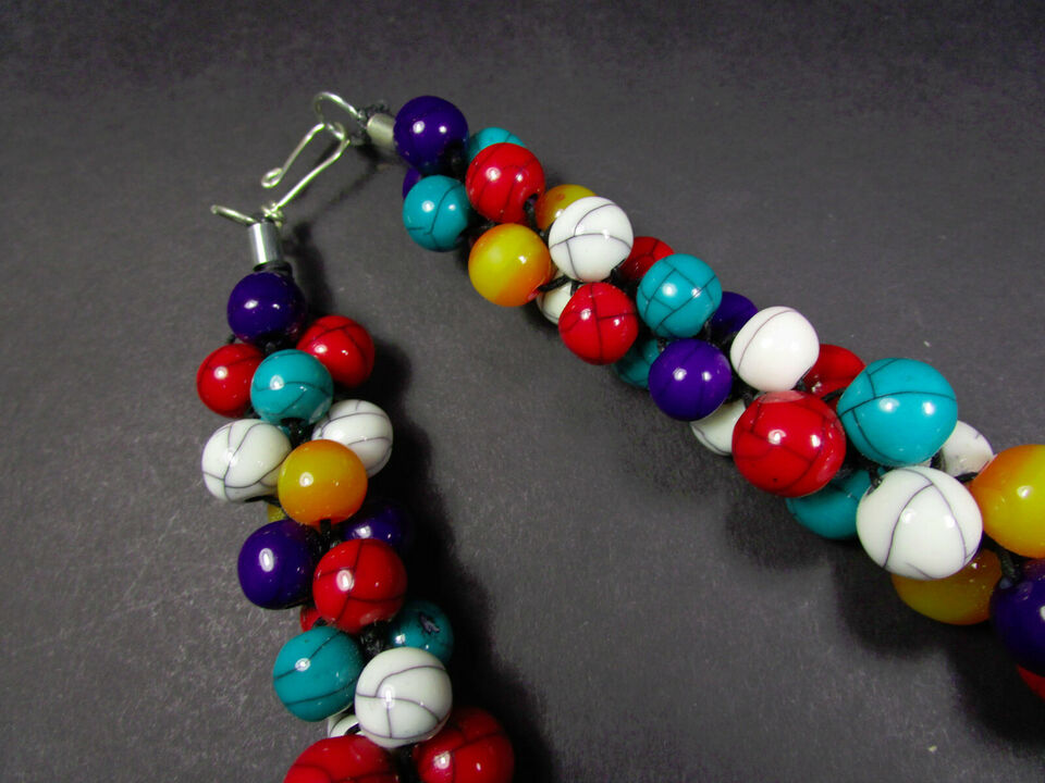 Elevate your style with this stunning Tibetan-inspired multi color necklace, handcrafted in India. This bold, fashion-forward piece features vibrant multi-color resin beads meticulously braided with a sleek black cord. The combination of colors creates a unique and eye-catching design that's both elegant and distinctive.