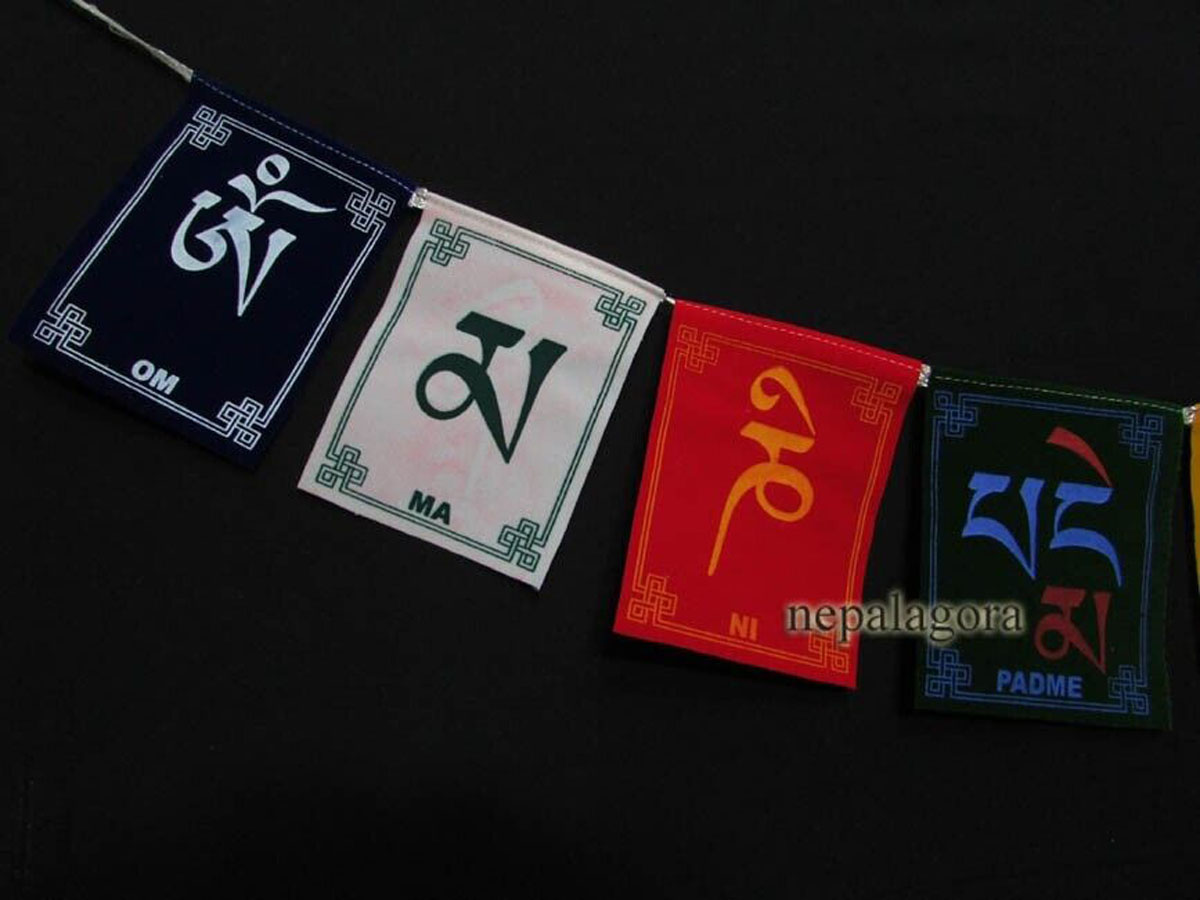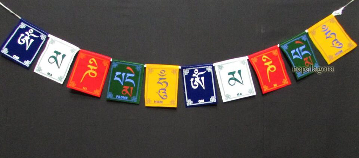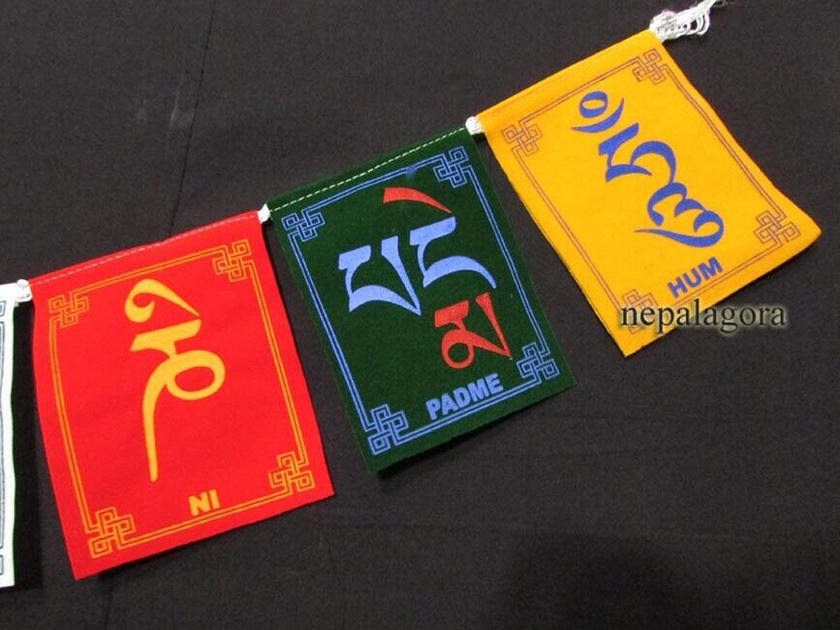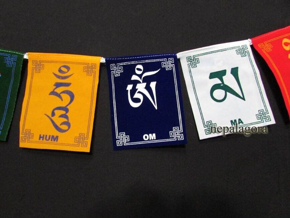This prayer flag is excellence hand embossed from Nepal. The Tibetan Om Ma Ni Padme Hum Mantra printed prayer flags are made of velvet. This is a string of 10 flags of 1 roll with two each of the five Tibetan fundamental colors.
