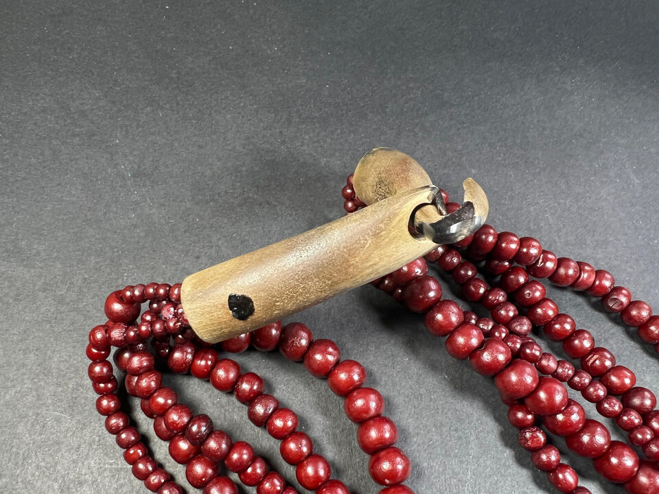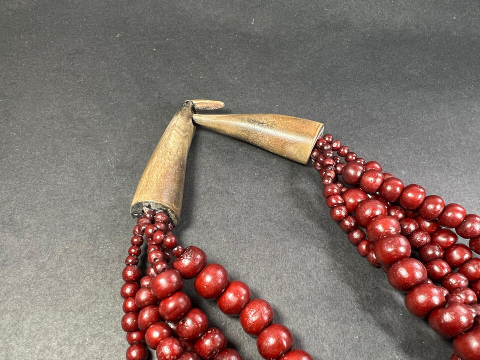 The necklace features a long, flowing strand of bone beads that can be wrapped around the neck multiple times. The beads are arranged in a pattern that creates a sense of movement and fluidity, with some beads stacked on top of each other to create a dimensional effect. The design is reminiscent of traditional tribal jewelry, with its use of bold colors and geometric patterns.
